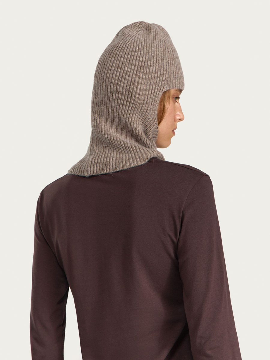 Вязаная балаклава из шерстяной пряжи с содержанием кашемира, выполнена вязкой “резинка”.