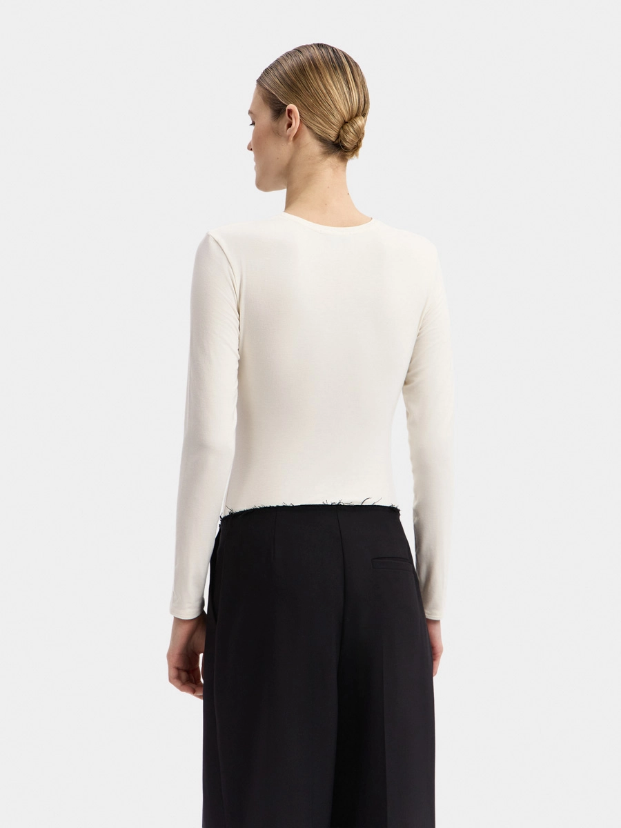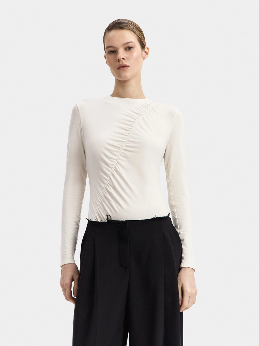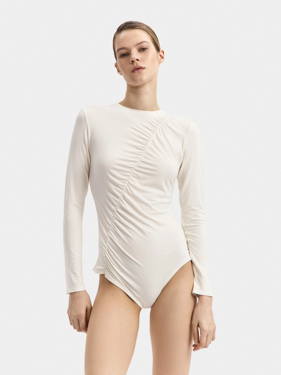 Боди Кира имеет длинный рукав и аккуратную горловину с узкой обтачкой. Интересный вид изделию придает диагональная сборка спереди. Застёжка на кнопки расположена внизу на детали ластовицы.