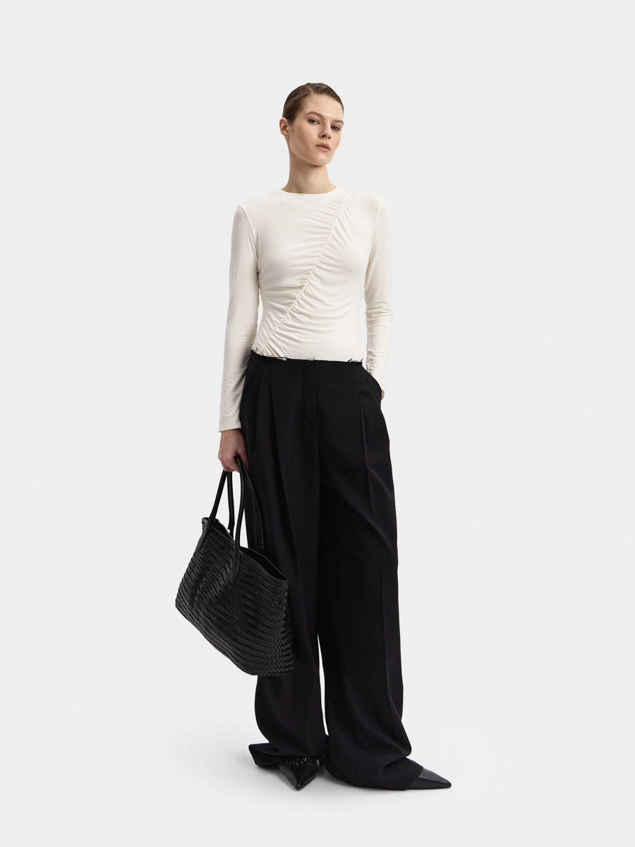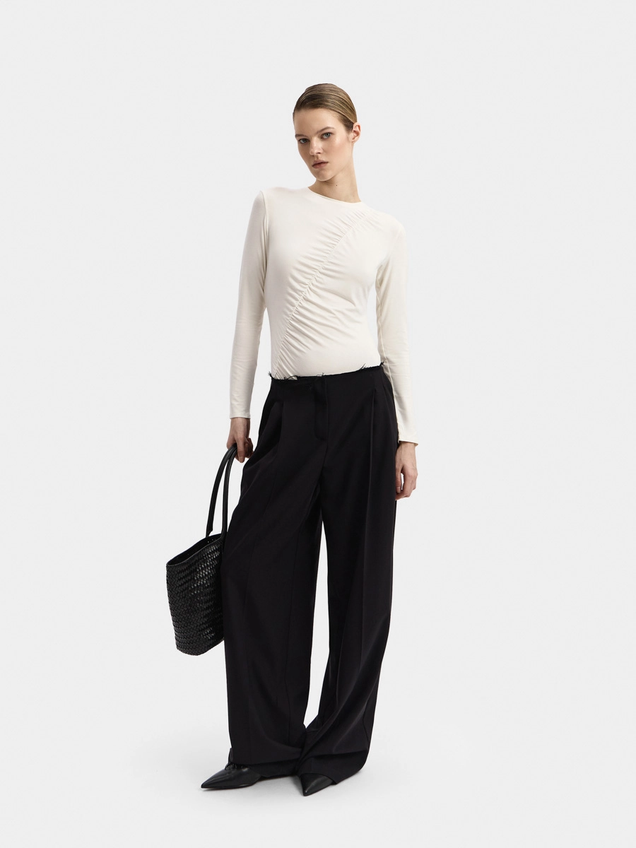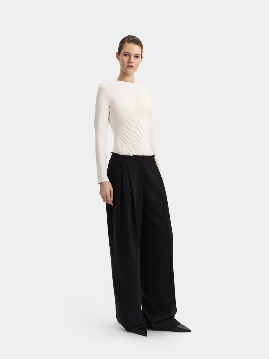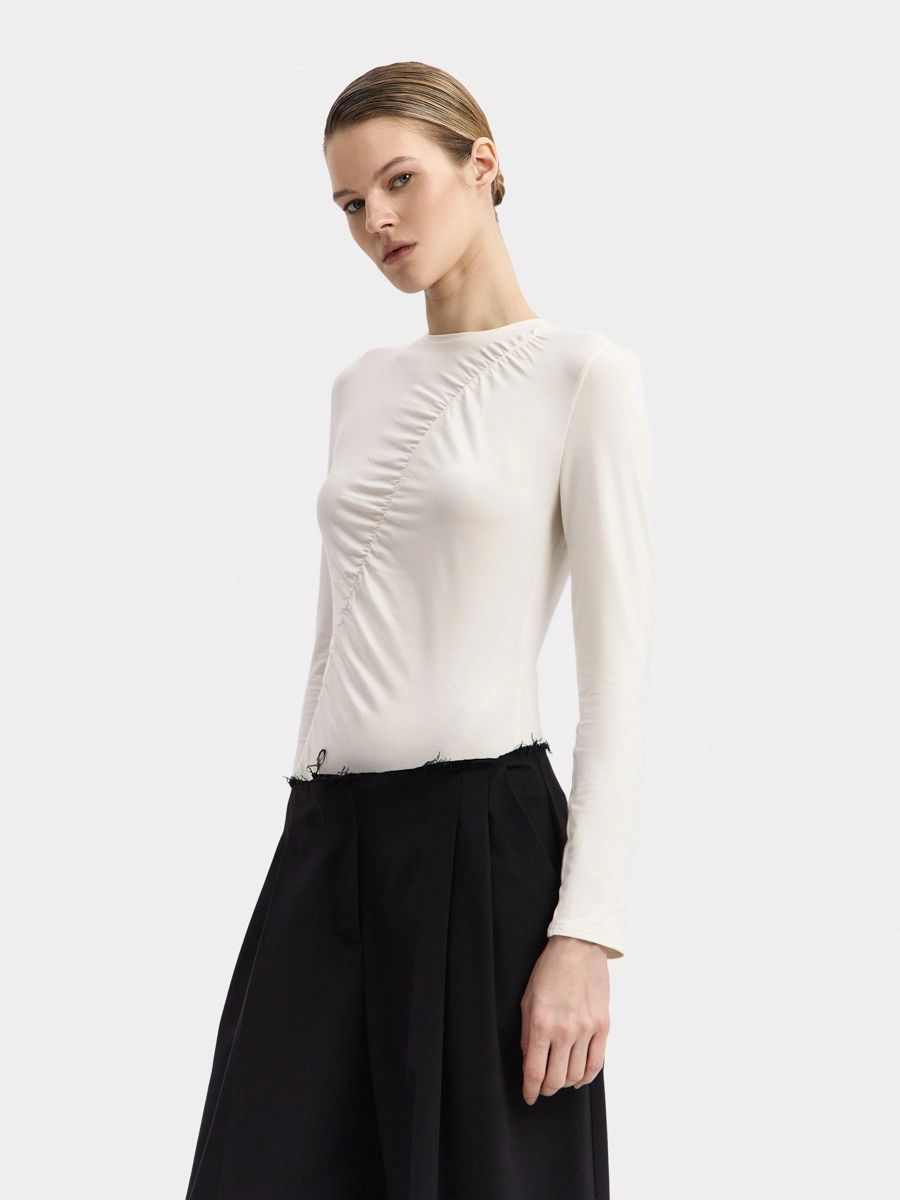 Боди Кира имеет длинный рукав и аккуратную горловину с узкой обтачкой. Интересный вид изделию придает диагональная сборка спереди. Застёжка на кнопки расположена внизу на детали ластовицы.