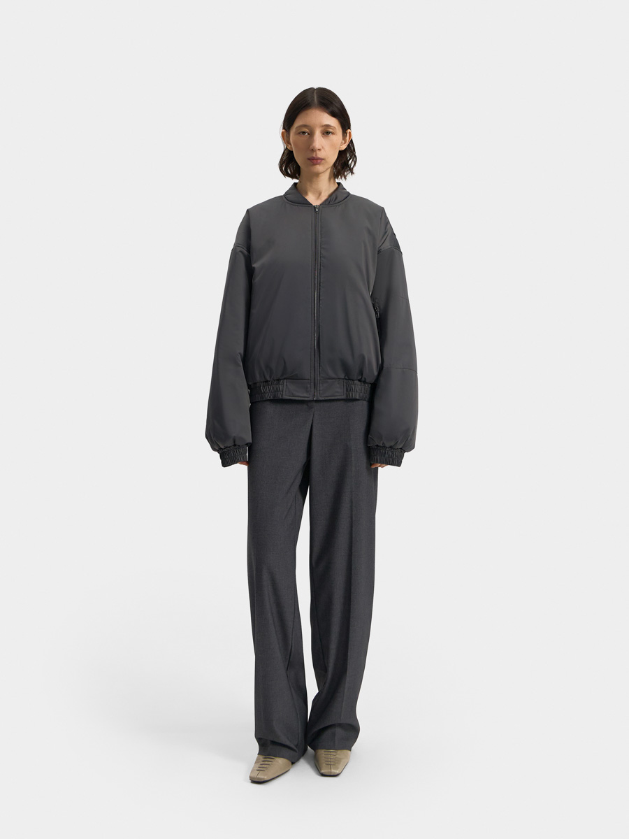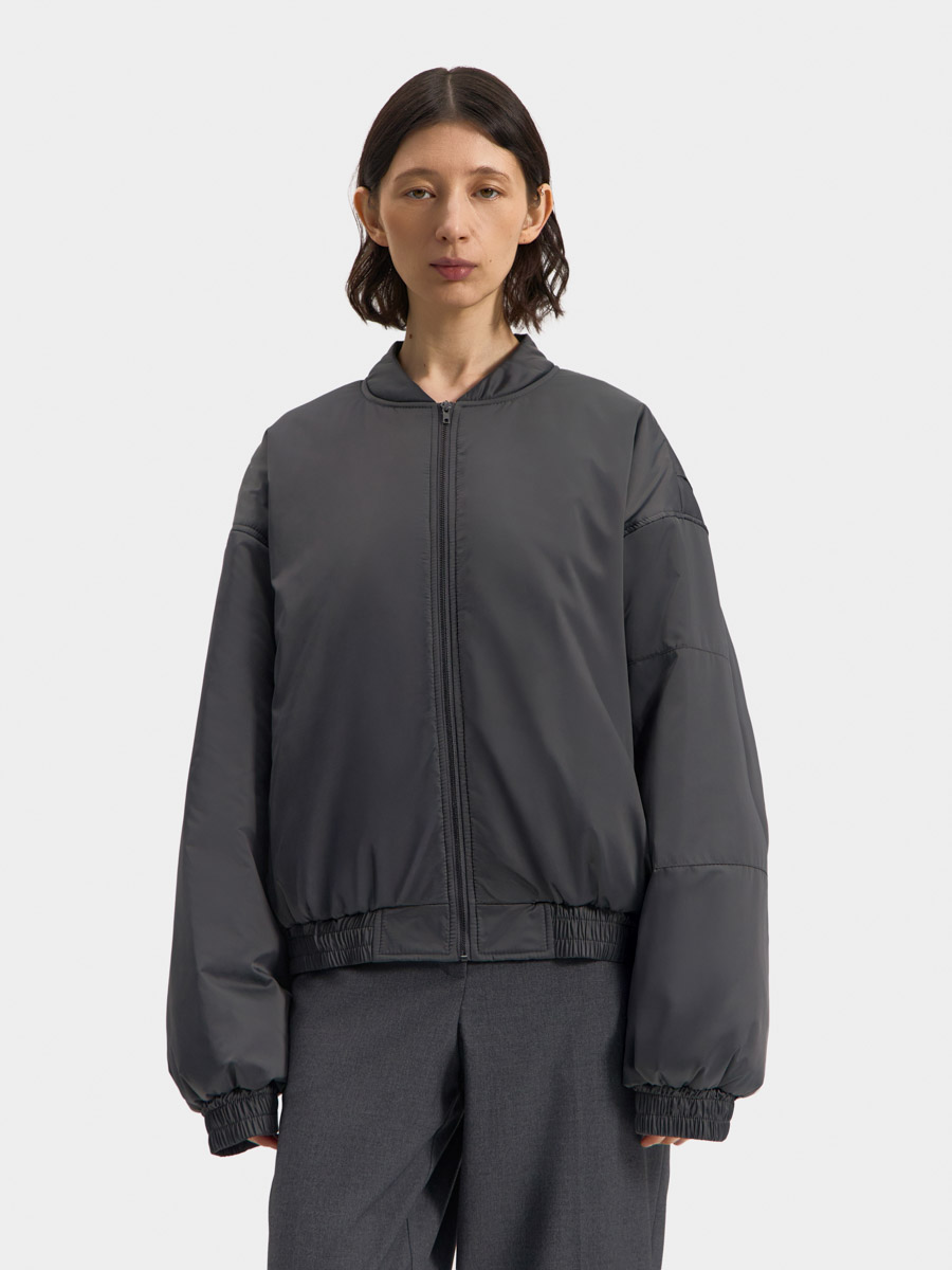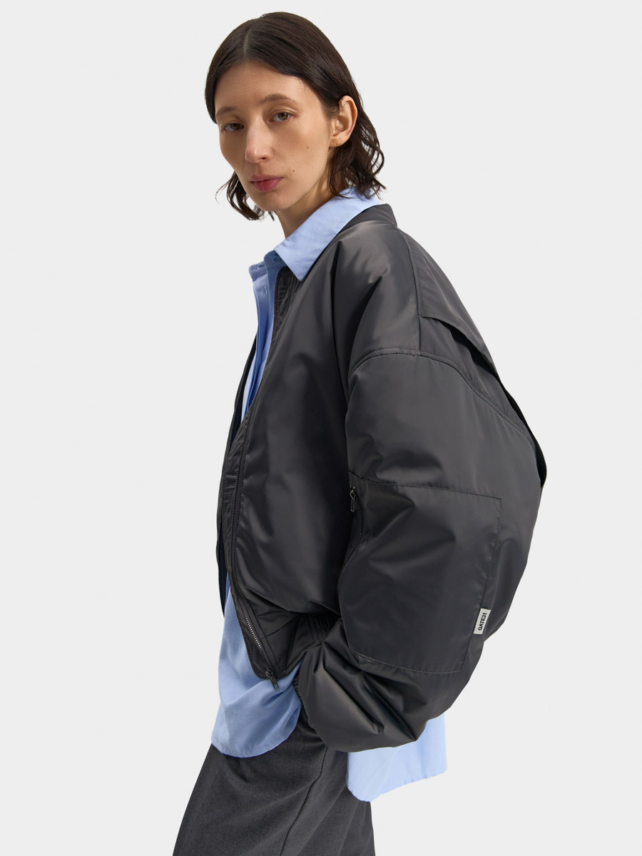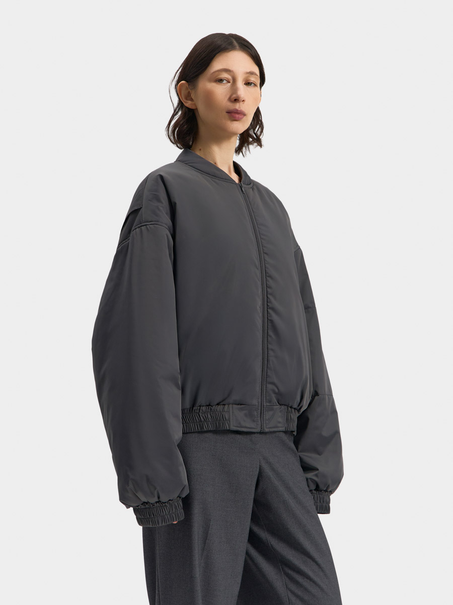 Укороченный бомбер Лос-Анджелес на утеплителе выполнен из гладкой курточной ткани, имеет спущенную линию плеча и застёжку на металлическую молнию и воротник-стойку. На полочках обработаны прорезные карманы с листочкой и застёжкой на потайную кнопку. Низ изделия и низ рукавов на притачных манжетах с эластичной резинкой внутри и параллельными отделочными строчками. На спинке в проймах обработаны специальные складки на свободу движения. На левом рукаве расположен накладной карман с застёжкой на молнию. Изделие на подкладке.