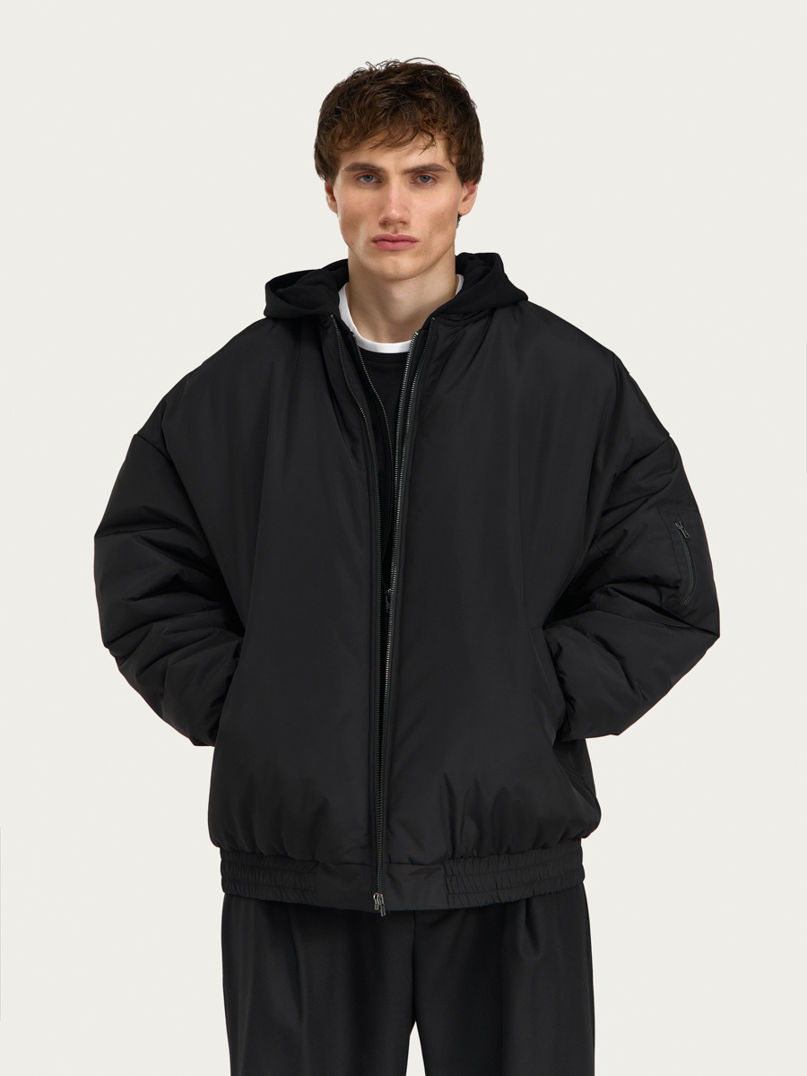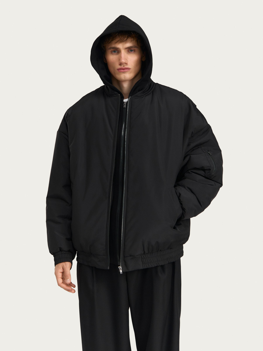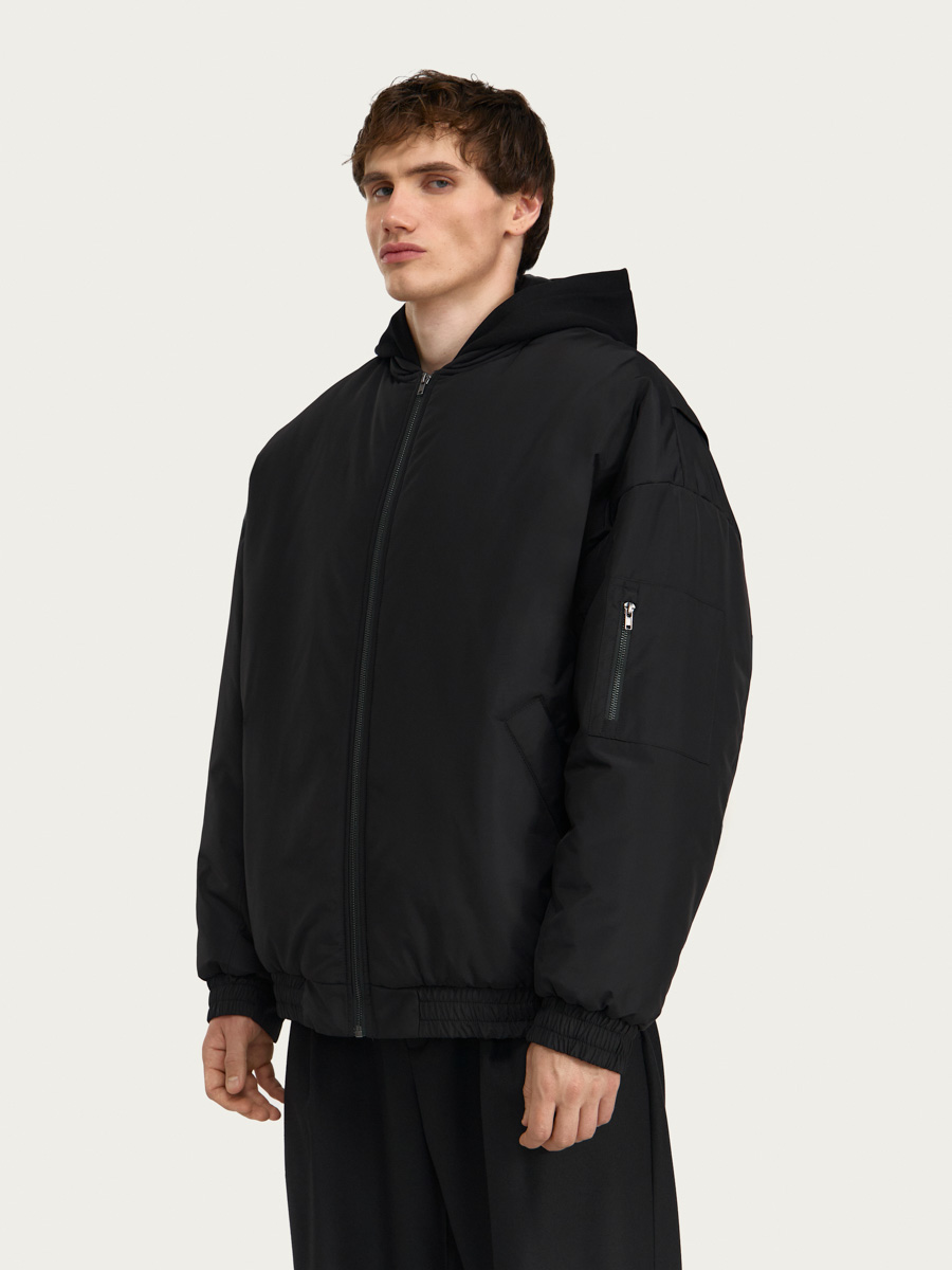 Мужской бомбер Мюнхен с капюшоном из футера выполнен из плащевой ткани с пропиткой. Модельной особенностью бомбера является отделка в виде худи на молнии. Такая деталь защитит Вас от ветра и добавит расслабленности образу. Бомбер имеет спущенную линию плеча, объёмные рукава и воротник-стойку. На полочках карманы прорезные с листочкой, на левом рукаве накладной карман на молнии. Низ изделия и низ рукавов обработаны эластичной манжетой с резинкой. Изделие на подкладке.