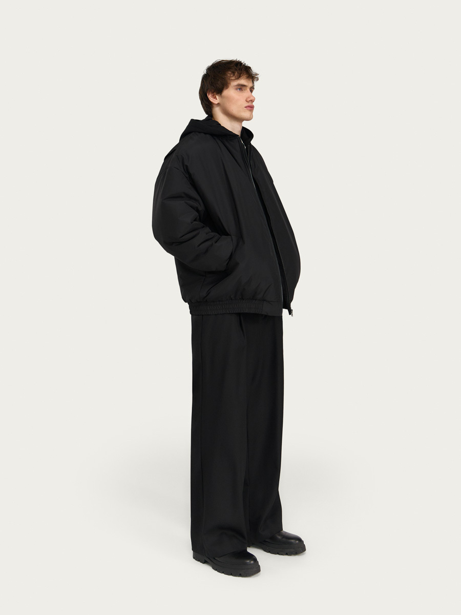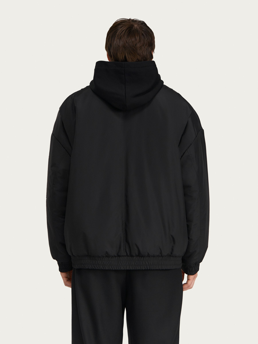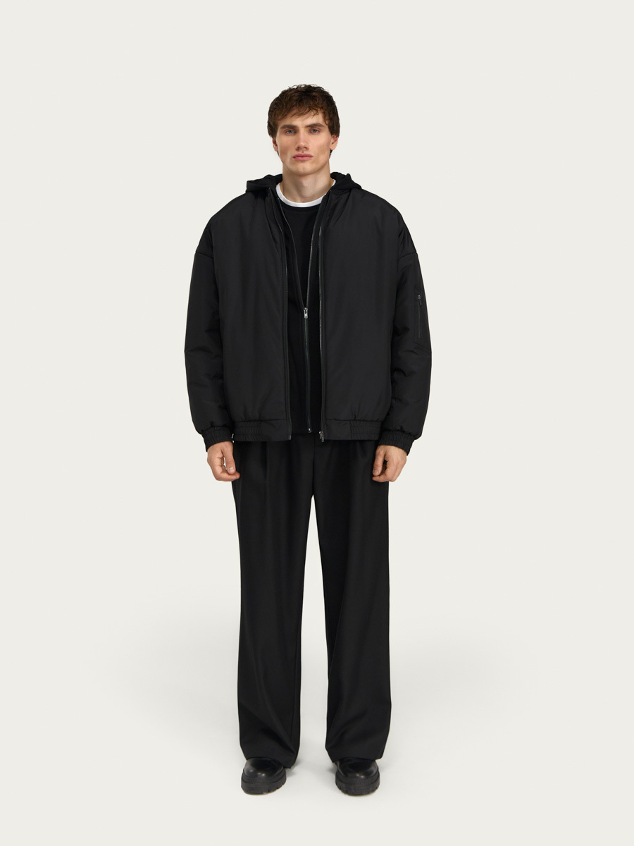 Мужской бомбер Мюнхен с капюшоном из футера выполнен из плащевой ткани с пропиткой. Модельной особенностью бомбера является отделка в виде худи на молнии. Такая деталь защитит Вас от ветра и добавит расслабленности образу. Бомбер имеет спущенную линию плеча, объёмные рукава и воротник-стойку. На полочках карманы прорезные с листочкой, на левом рукаве накладной карман на молнии. Низ изделия и низ рукавов обработаны эластичной манжетой с резинкой. Изделие на подкладке.