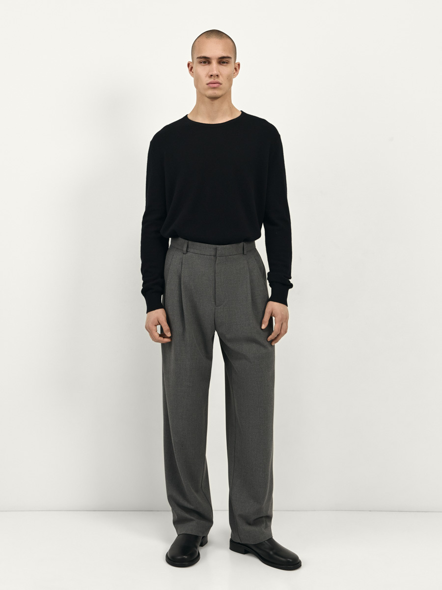 Модель брюк имеет притачной пояс со шлевками, по две складки на передних половинках, накладной карман сзади, застежку на брючный крючок и молнию в гульфике, карманы с бочками.