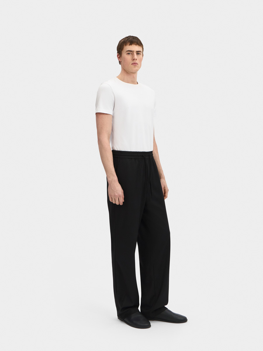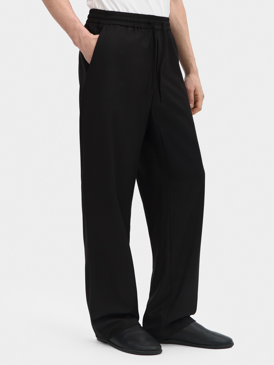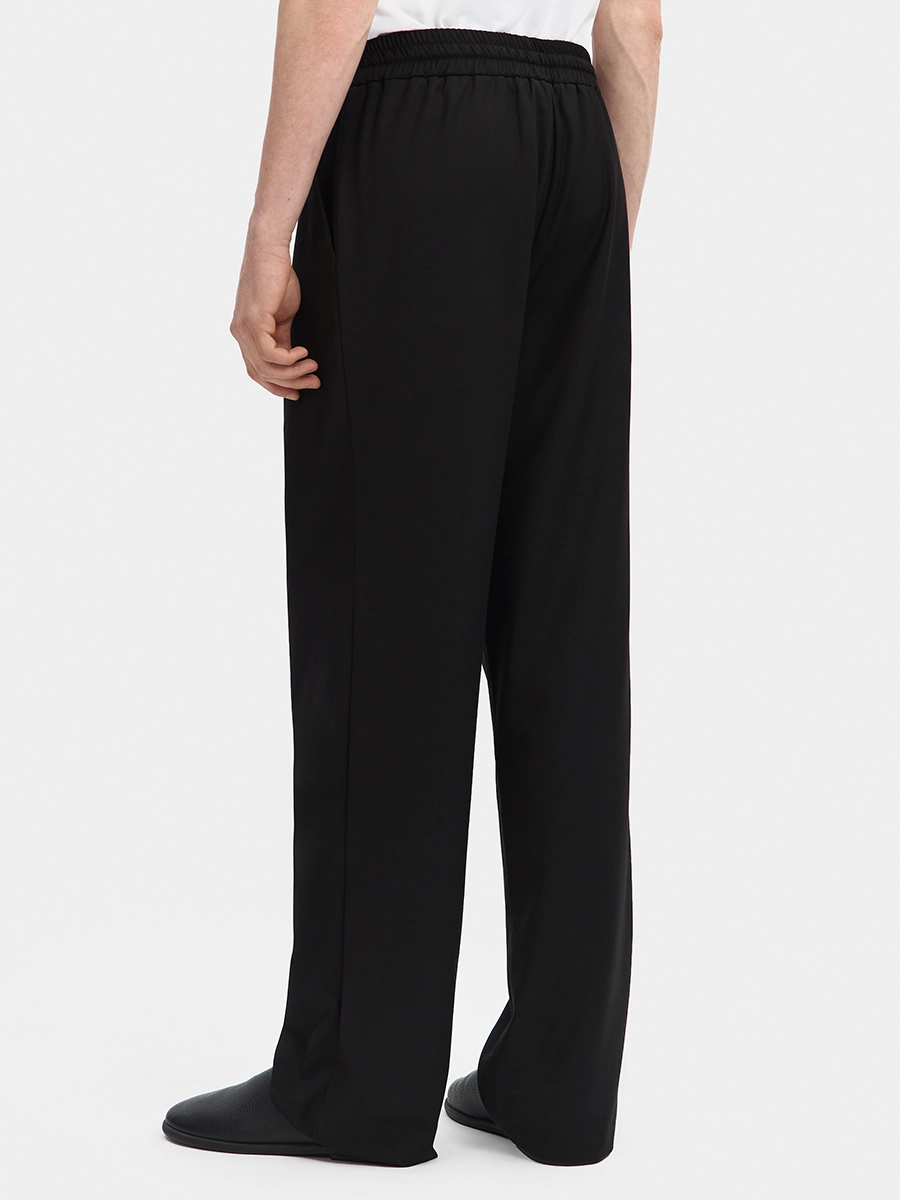 Брюки имеют прямой силуэт, притачной пояс с резинкой и завязками, карманы с бочками.