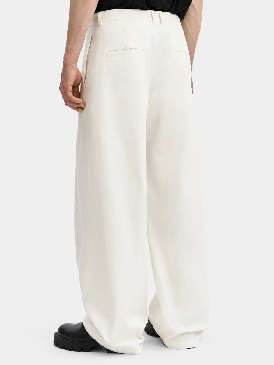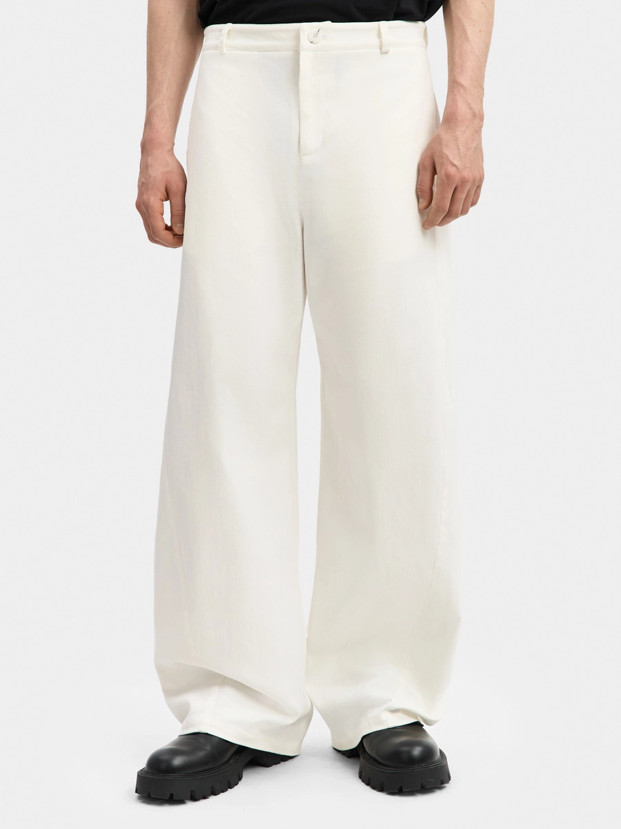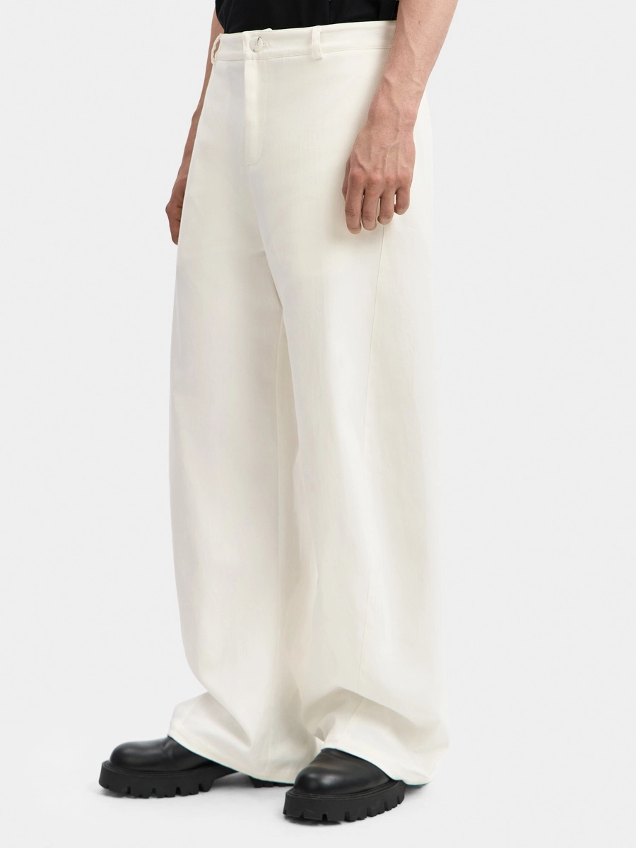 Брюки свободного кроя со средней посадкой имеют притачной пояс с шестью шлевками, застежку на молнию в гульфике и пуговицу на поясе, в асимметричных швах передних половинок брюк расположены карманы, сзади — прорезные карманы с листочкой.