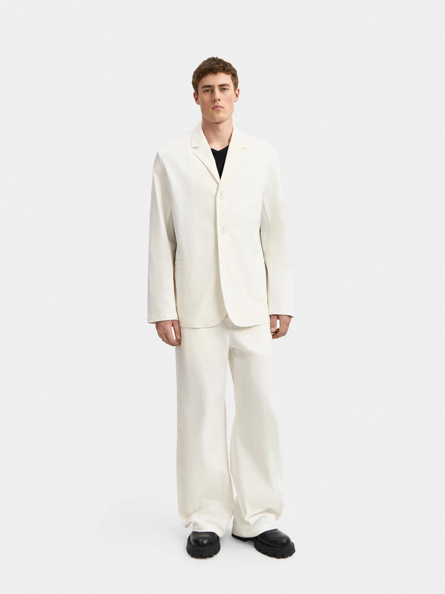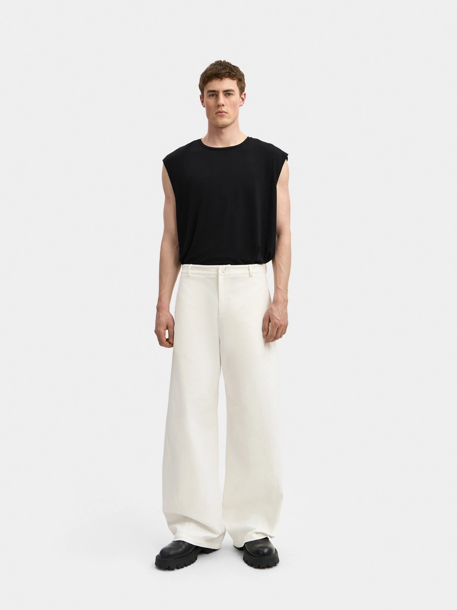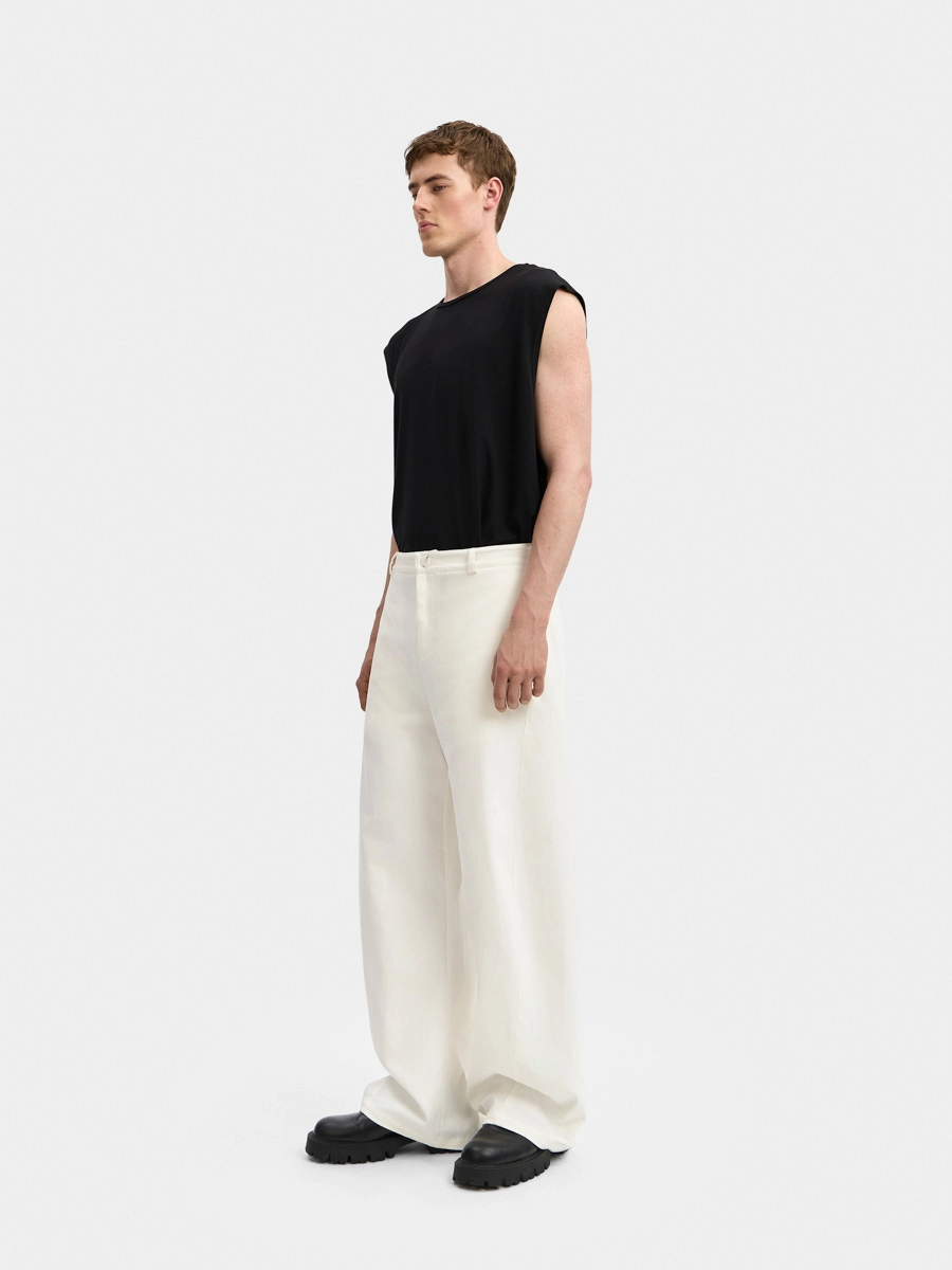 Брюки свободного кроя со средней посадкой имеют притачной пояс с шестью шлевками, застежку на молнию в гульфике и пуговицу на поясе, в асимметричных швах передних половинок брюк расположены карманы, сзади — прорезные карманы с листочкой.