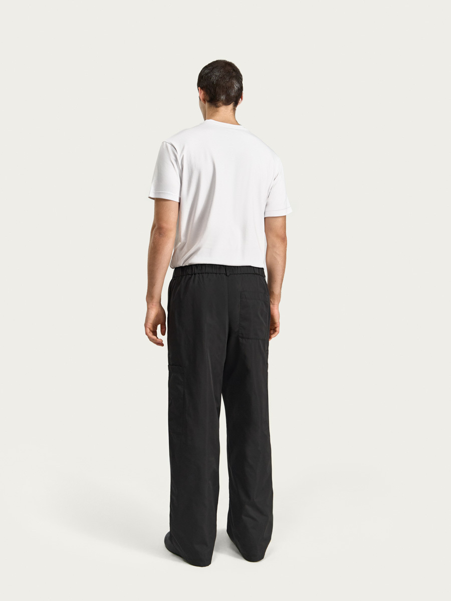 Мужские брюки Дэйв из плащевой ткани. Брюки прямого свободного силуэта имеют притачной пояс с резинкой и шлёвками, застёжку на брючный крючок и молнию в гульфике, карманы в боковых швах, накладные карманы по бокам и один накладной карман сзади с правой стороны, над правым карманом сбоку находится маленький прорезной карман с листочкой для разных мелочей. Изделие на подкладке из трикотажной сетки.