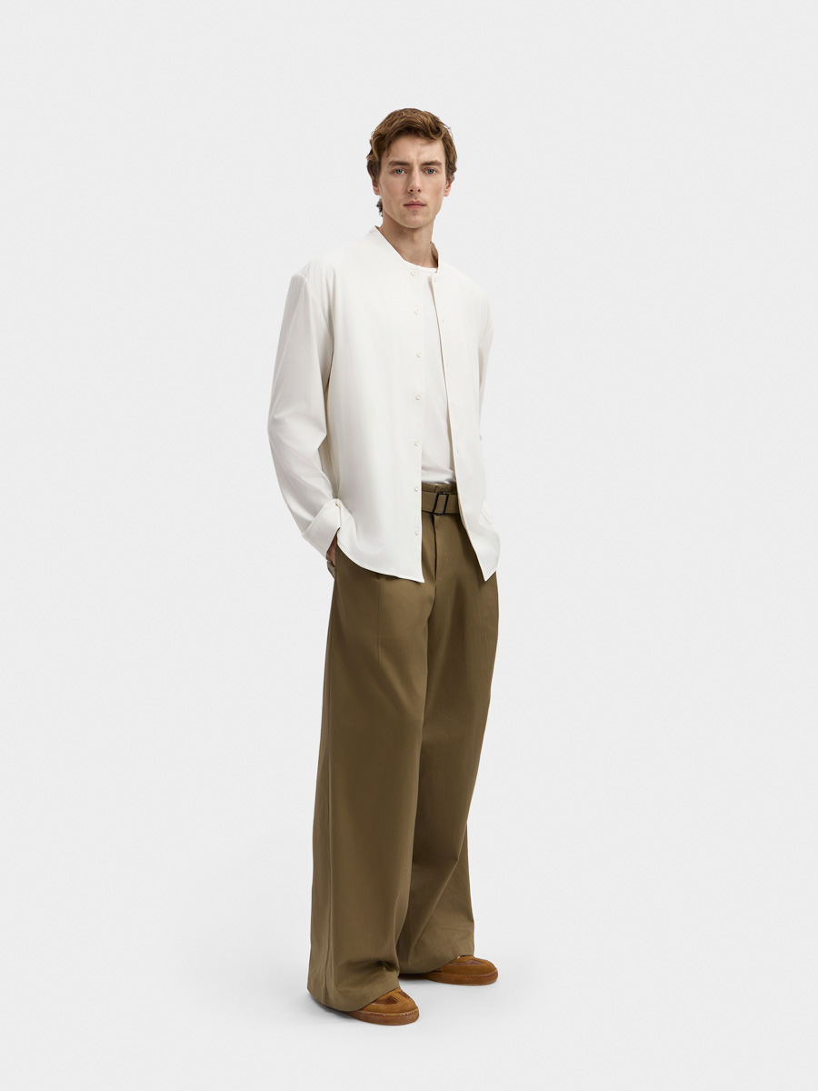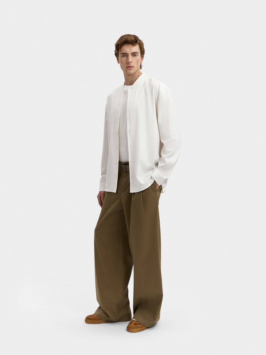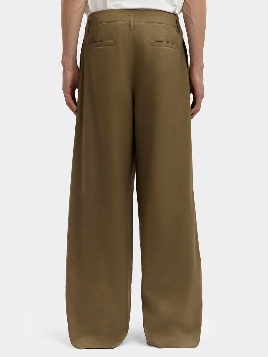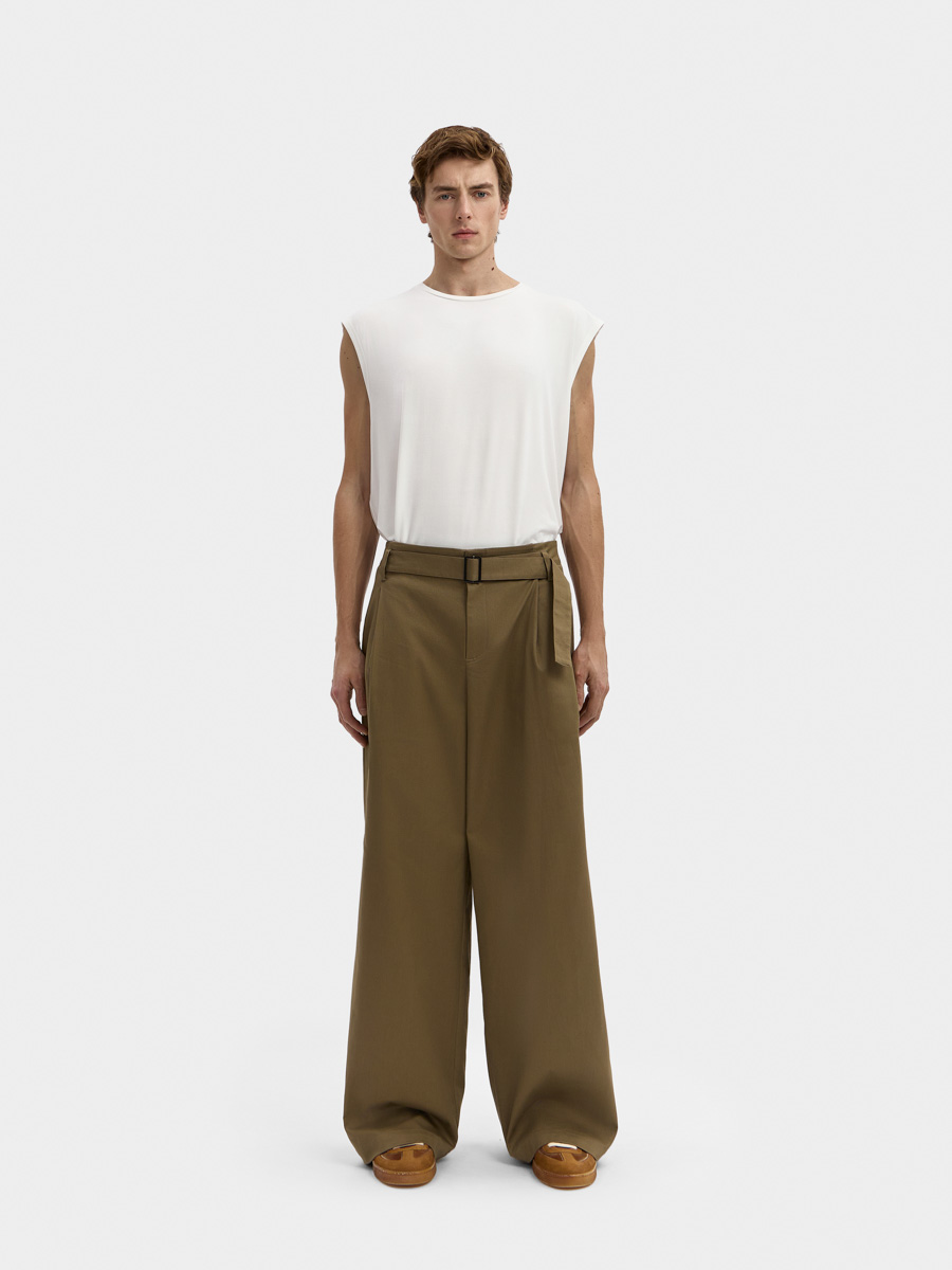 These wide, straight-leg, mid-rise pants feature a decorative buckle belt and pleats on the front panels, with a button and zip fly closure. The asymmetrical number of pleats at the front makes this piece model particularly interesting. Side seam pockets are located at the front, while the back features welt pockets with a flap and an inside button closure.