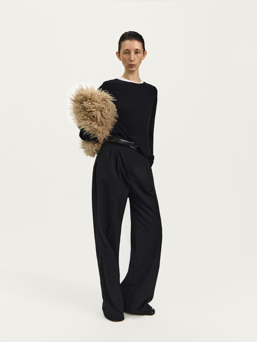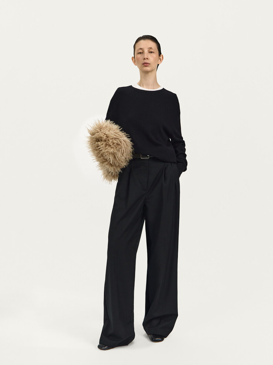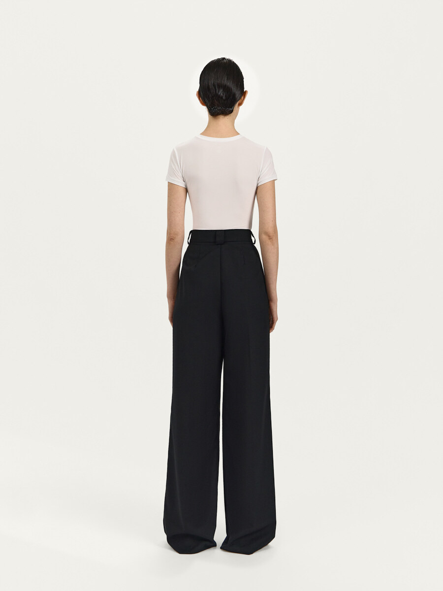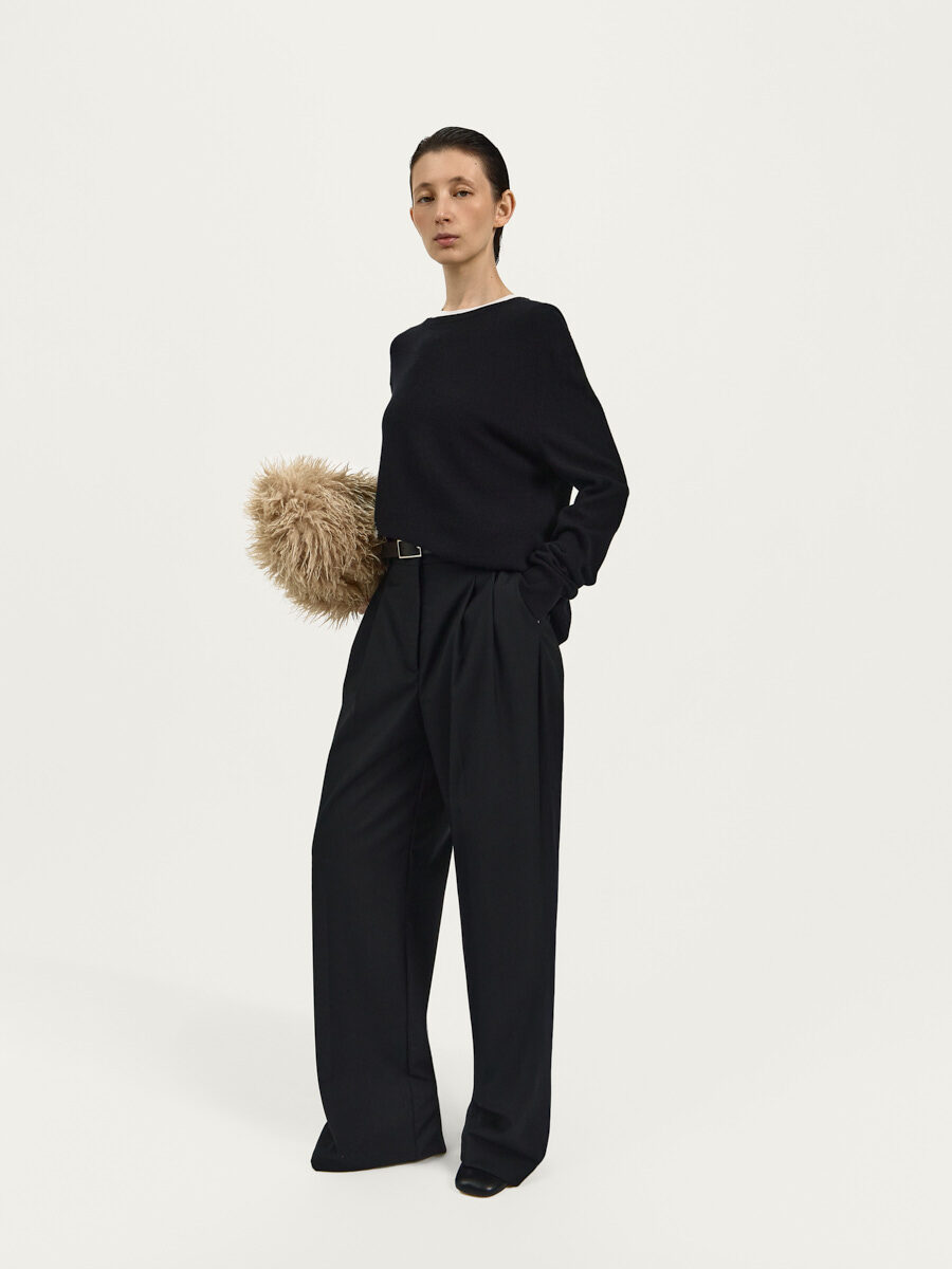 Брюки Ингрид имеют прямой свободный силуэт, притачной пояс с широкими шлевками, складки по передним половинкам, стрелки спереди и сзади, карманы с бочками, застежку на молнию в гульфике и на два брючных крючка на поясе.
