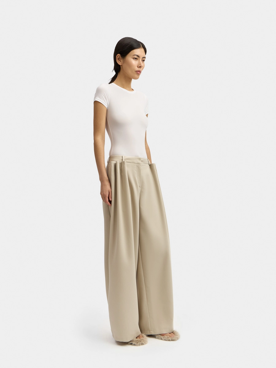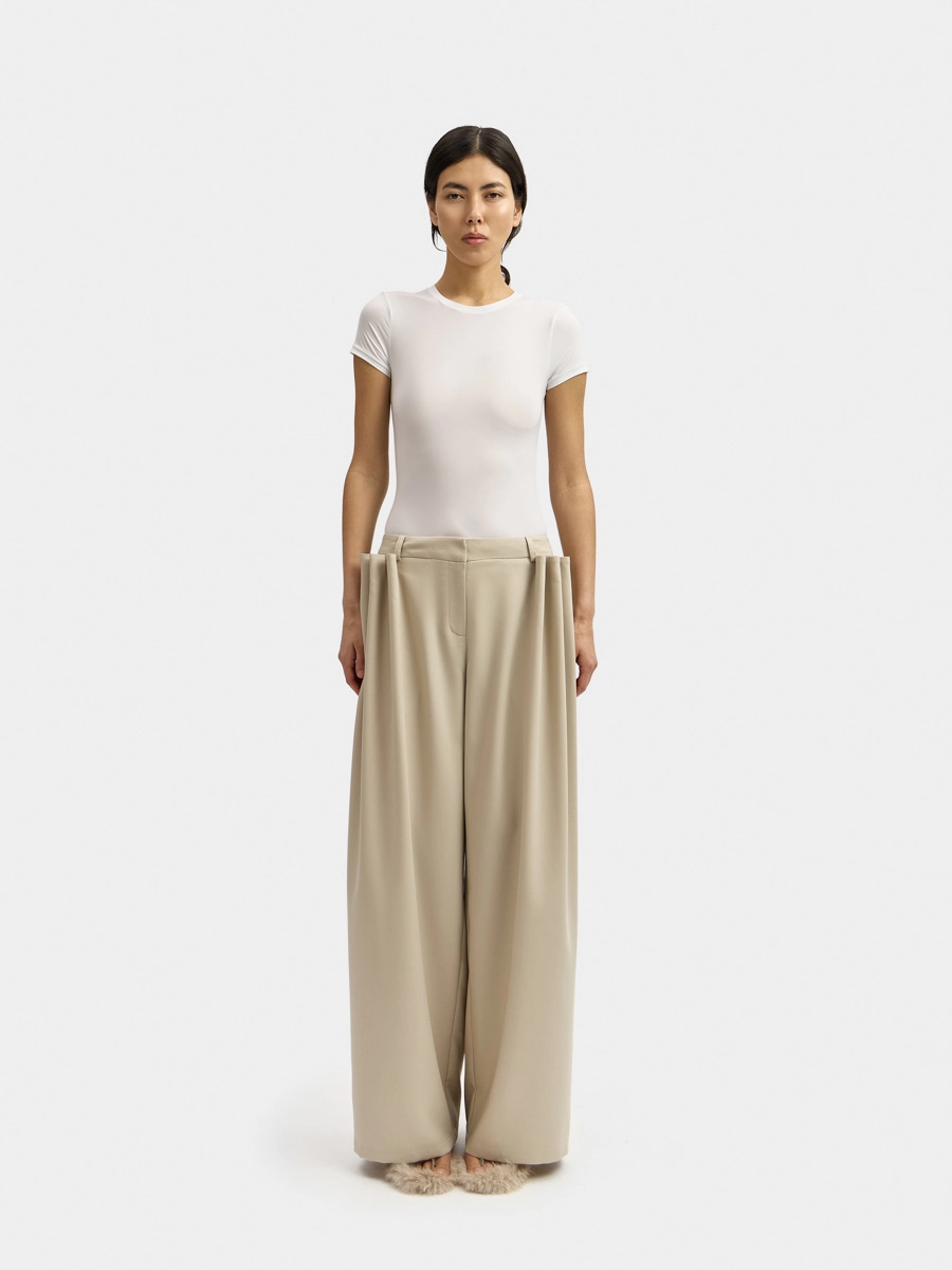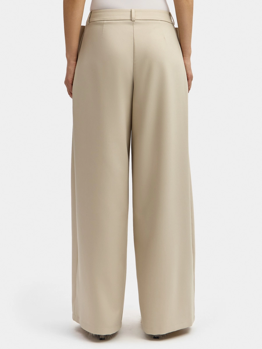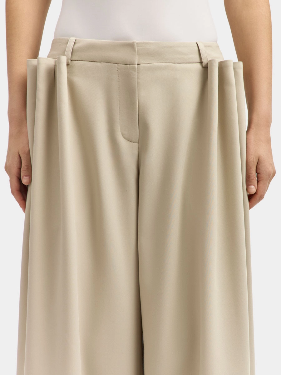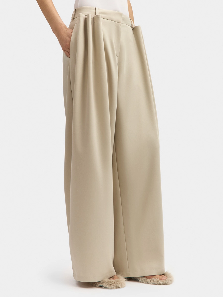 These wide, straight-leg, low-rise pants feature an attached waistband with belt loops, a two-hook closure, and a zip fly. They have side seam pockets, back darts, and voluminous decorative pleats on the front panels secured with bar tacks.