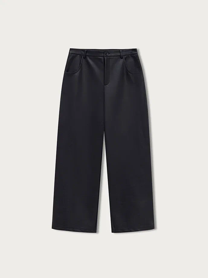 Брюки Клинт прямого силуэта выполнены из экокожи на хлопковой основе, приятной к телу. Брюки на притачном поясе со шлевками, с застежкой на пуговицу и молнию в гульфике.