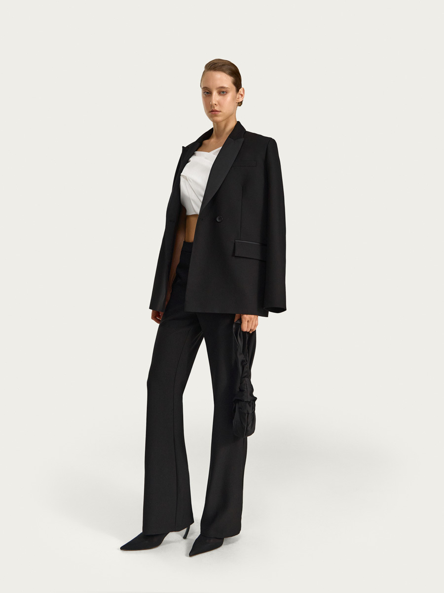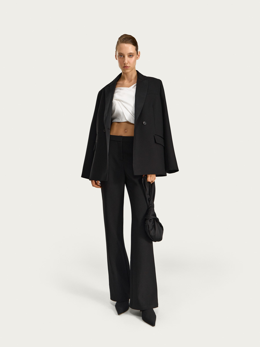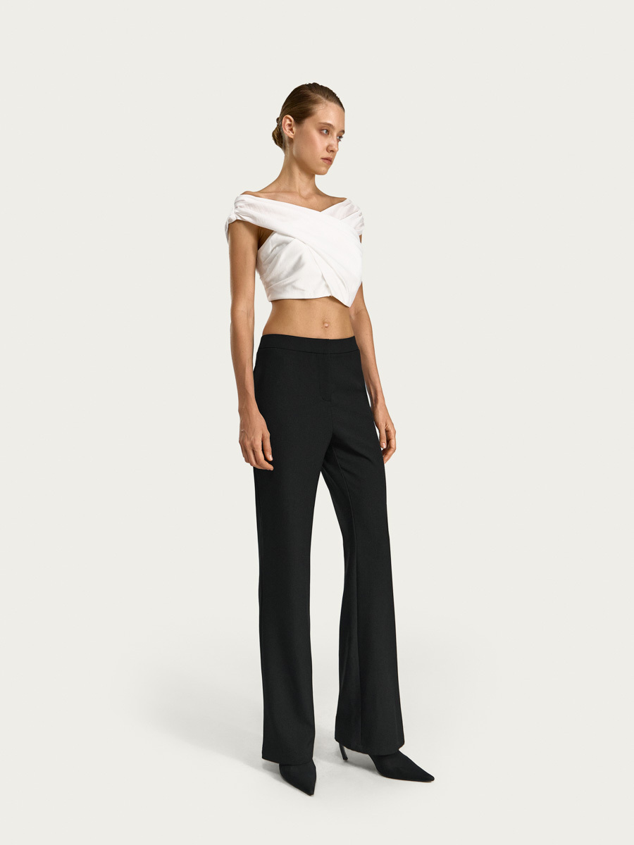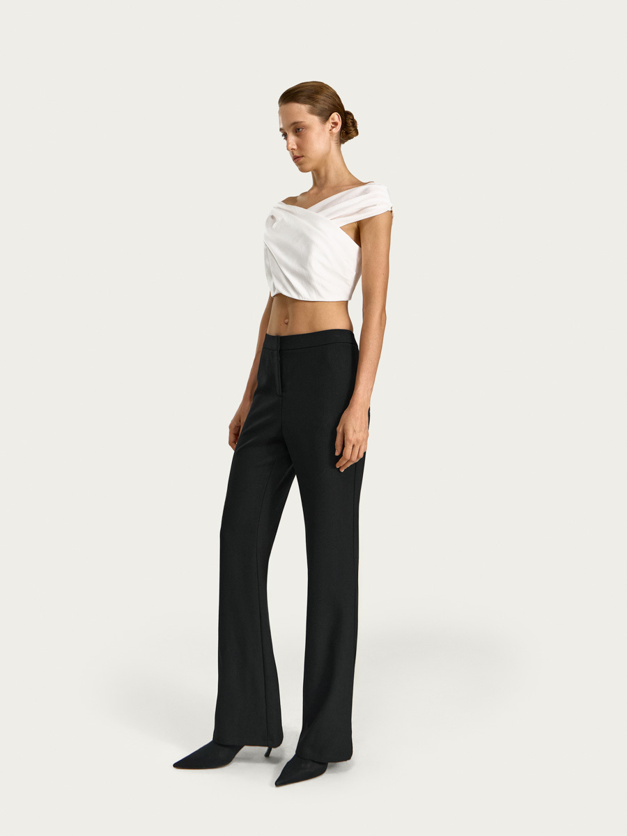 Узкие брюки с небольшим расклешением от колена имеют притачной пояс с застежкой на брючные крючки и гульфик с застежкой на молнию. На задних половинках обработаны талиевые вытачки для комфортной посадки.