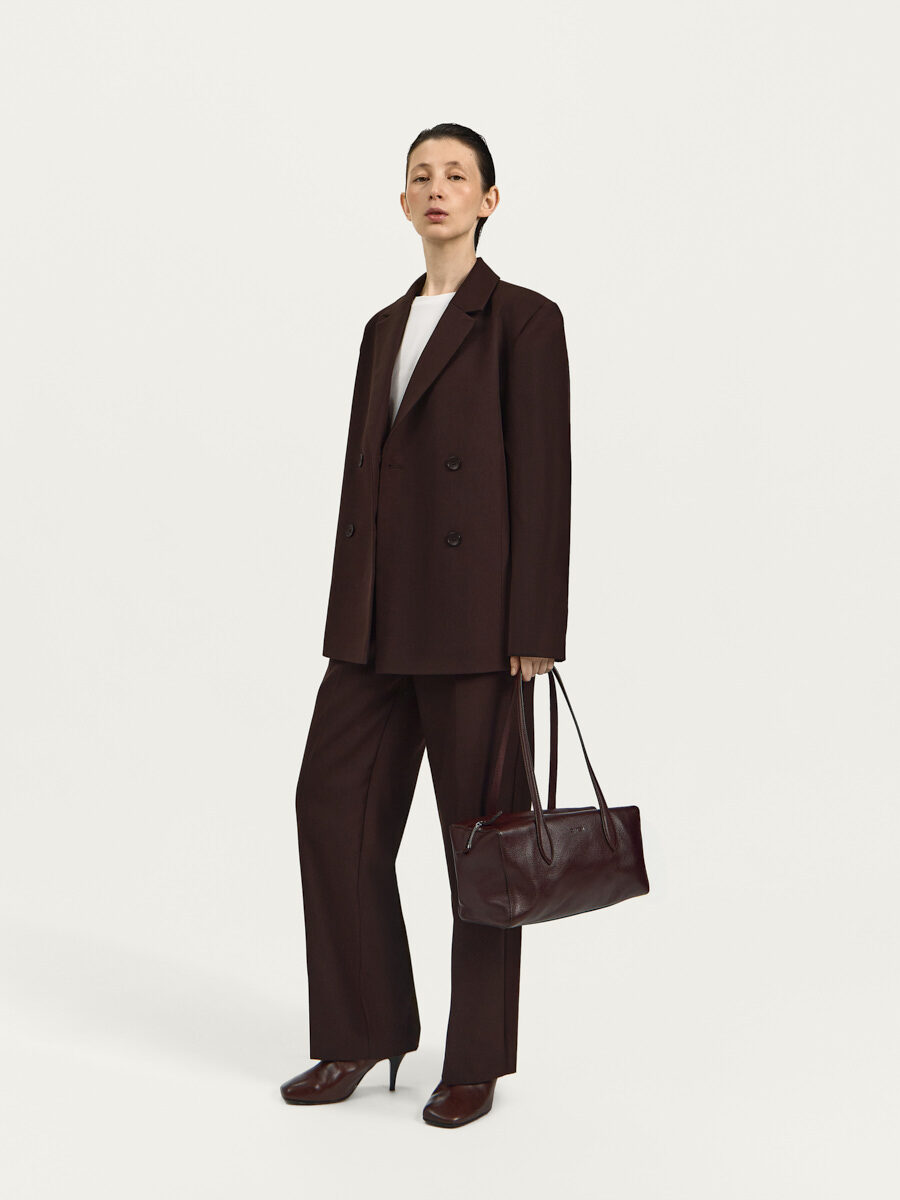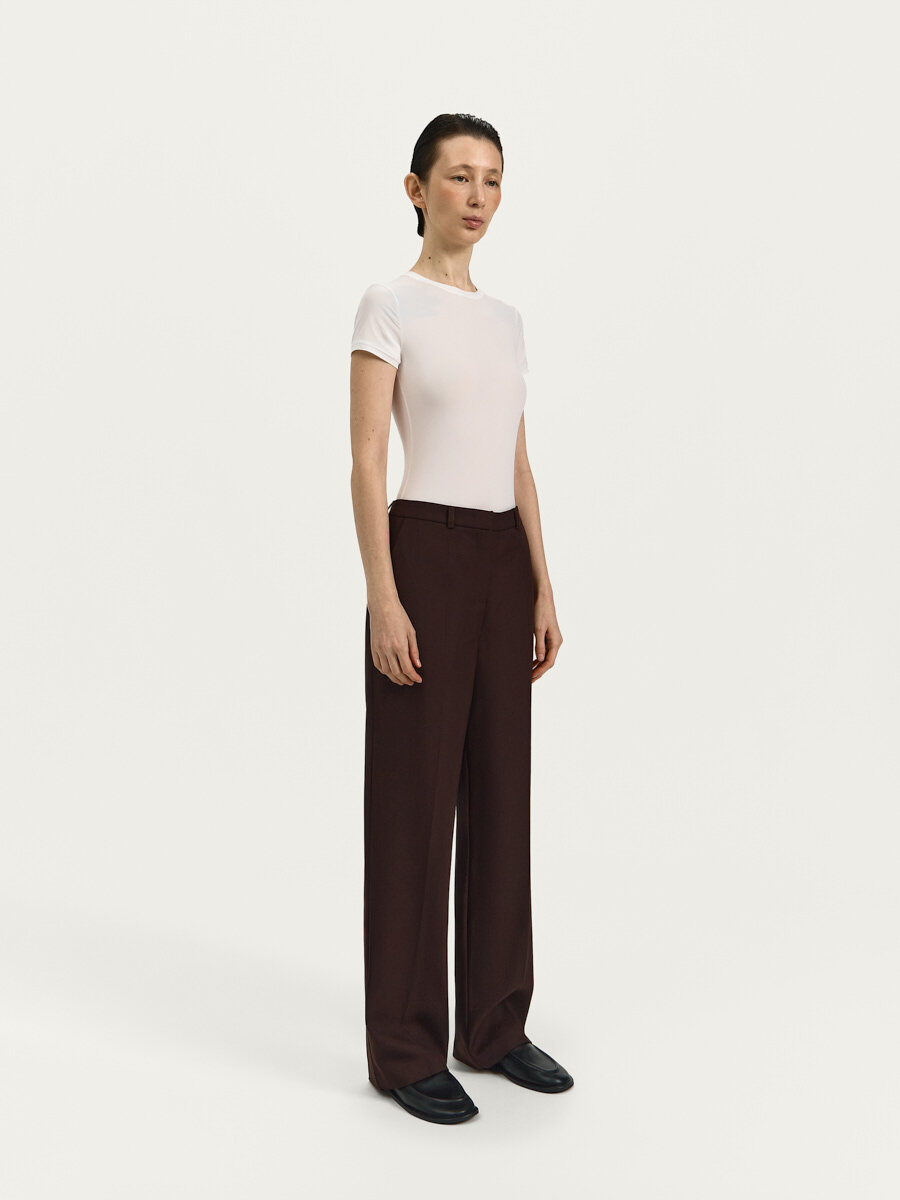 Брюки Леа из шерстяной костюмной ткани имеют прямой крой, стрелки спереди и карманы с бочками.