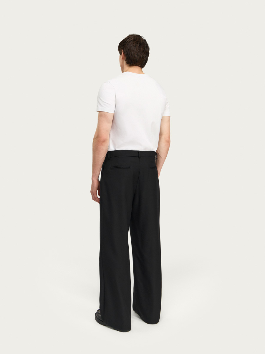 Широкие брюки прямого силуэта имеют притачной пояс со шлевками, застежку на пуговицу на поясе и молнию в гульфике, карманы в боковых швах, на передних половинках мягкие складки, на задних - вытачки и прорезные карманы в рамку.