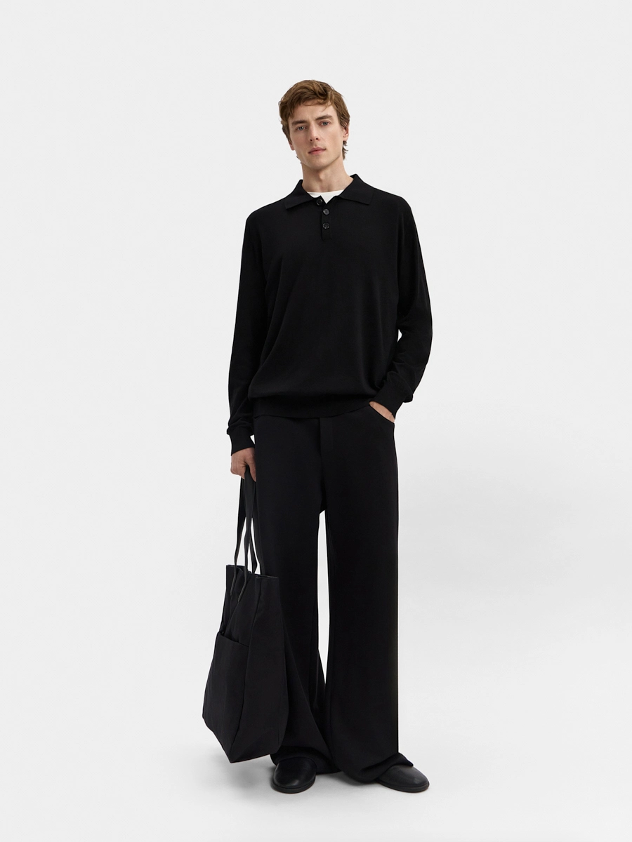 Брюки прямого свободного силуэта на притачном поясе с завязками, с застежкой на внутреннюю пуговицу на поясе и молнию в гульфике. Карманы в боковых швах и накладные карманы сзади.
