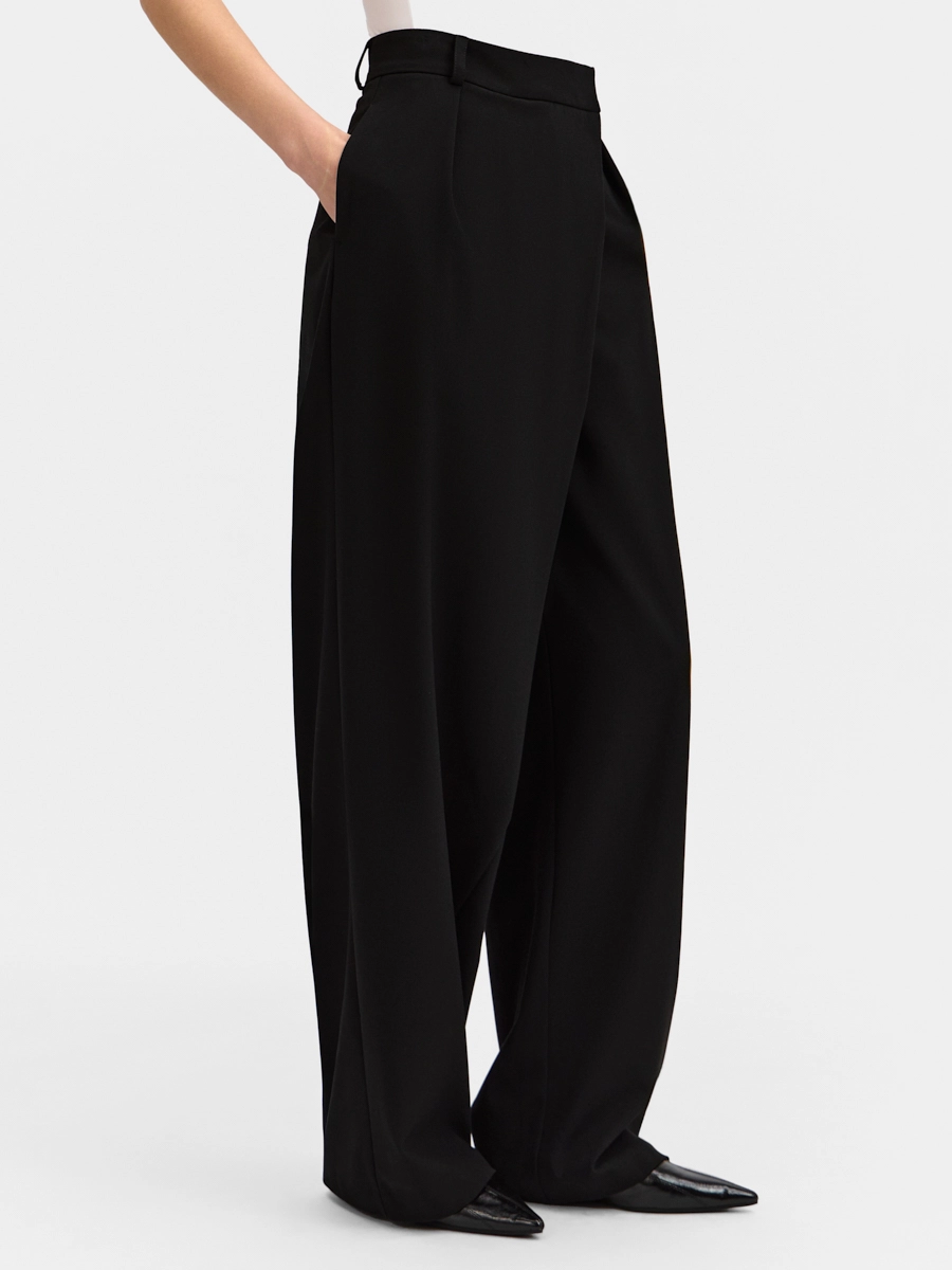 Брюки прямого кроя со средней посадкой и асимметричной складкой-запахом с правой стороны. Брюки с притачным поясом со шлёвками, по передним половинкам брюк заложены складки, застёжка брюк на молнию в гульфике, брючные крючки и внутреннюю пуговицу на поясе, в боковых швах расположены карманы, сзади справа - прорезной карман с листочкой.