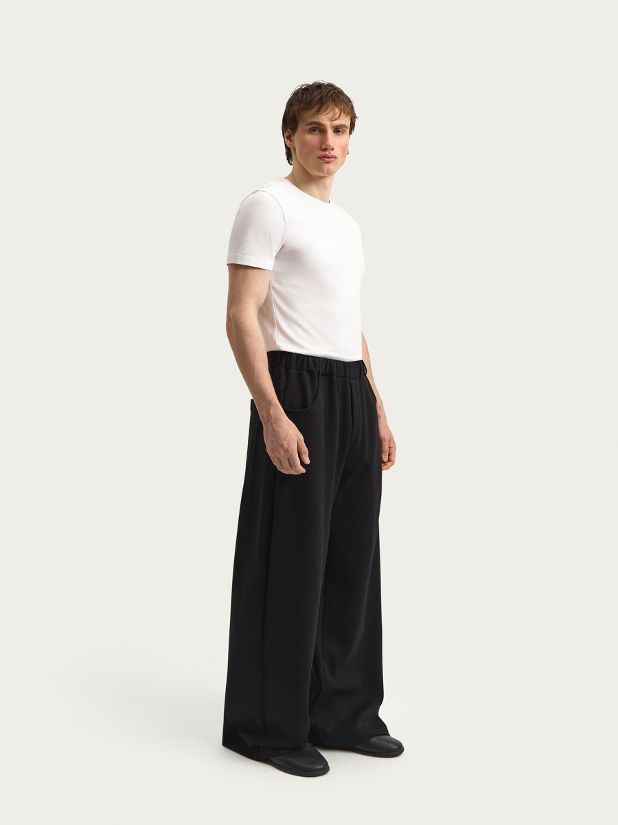 Широкие брюки на эластичном поясе со шнуром внутри и шлевками. На передних половинках обработаны карманы с бочком и имитация гульфика. Задние половинки с кокетками и накладными карманами.