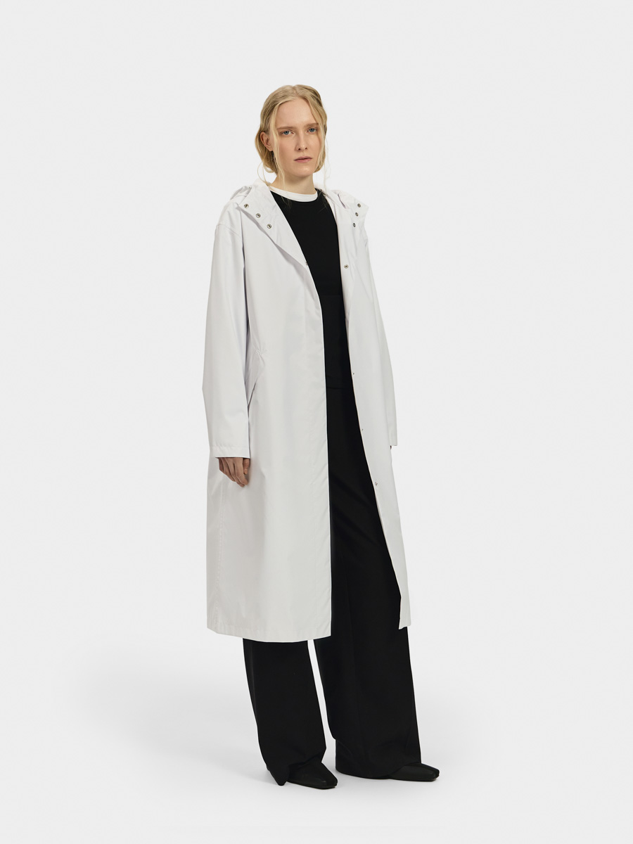 Дождевик имеет спущенную линию плеча, двухшовный капюшон с регулируемой резинкой по краю, на полочках карманы с клапаном, на спинке кулиса с резинкой и стопорами для регулировки объёма.