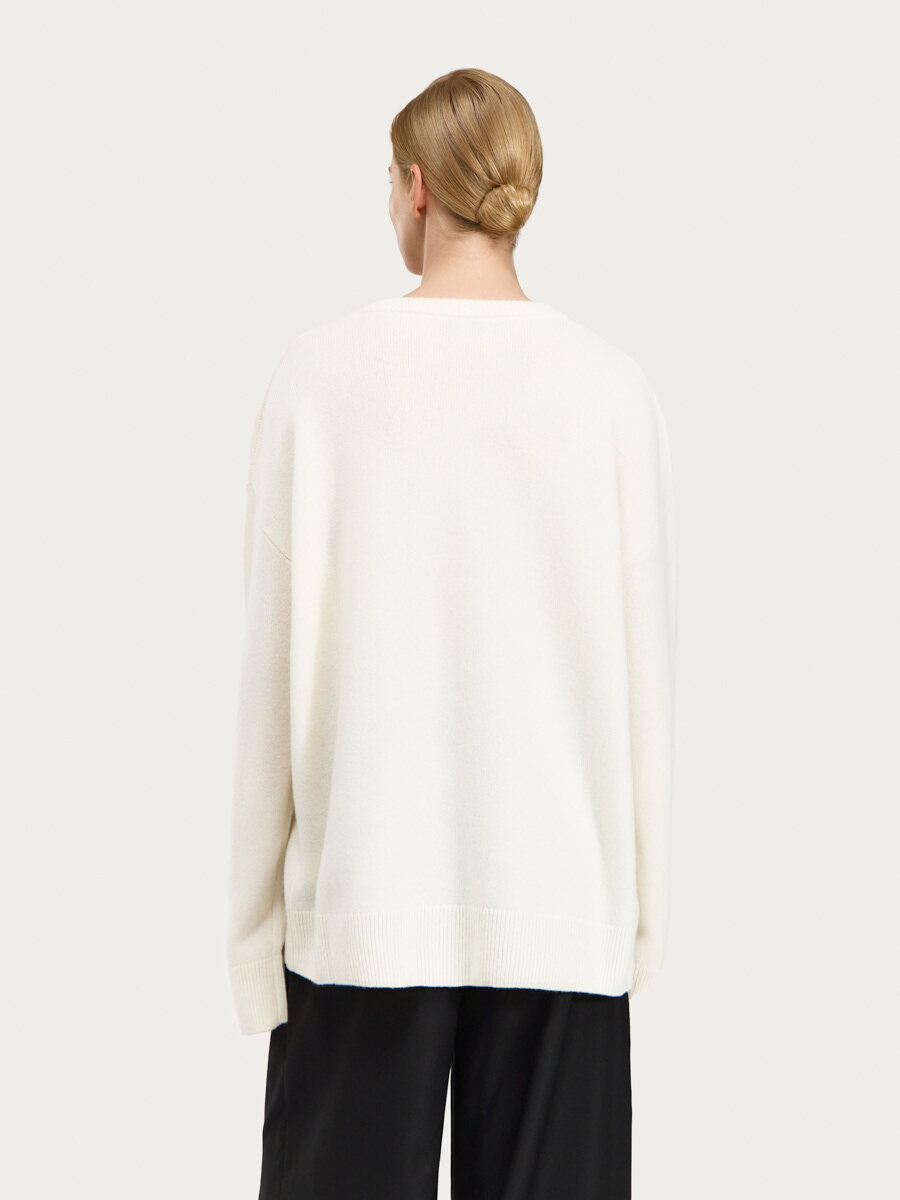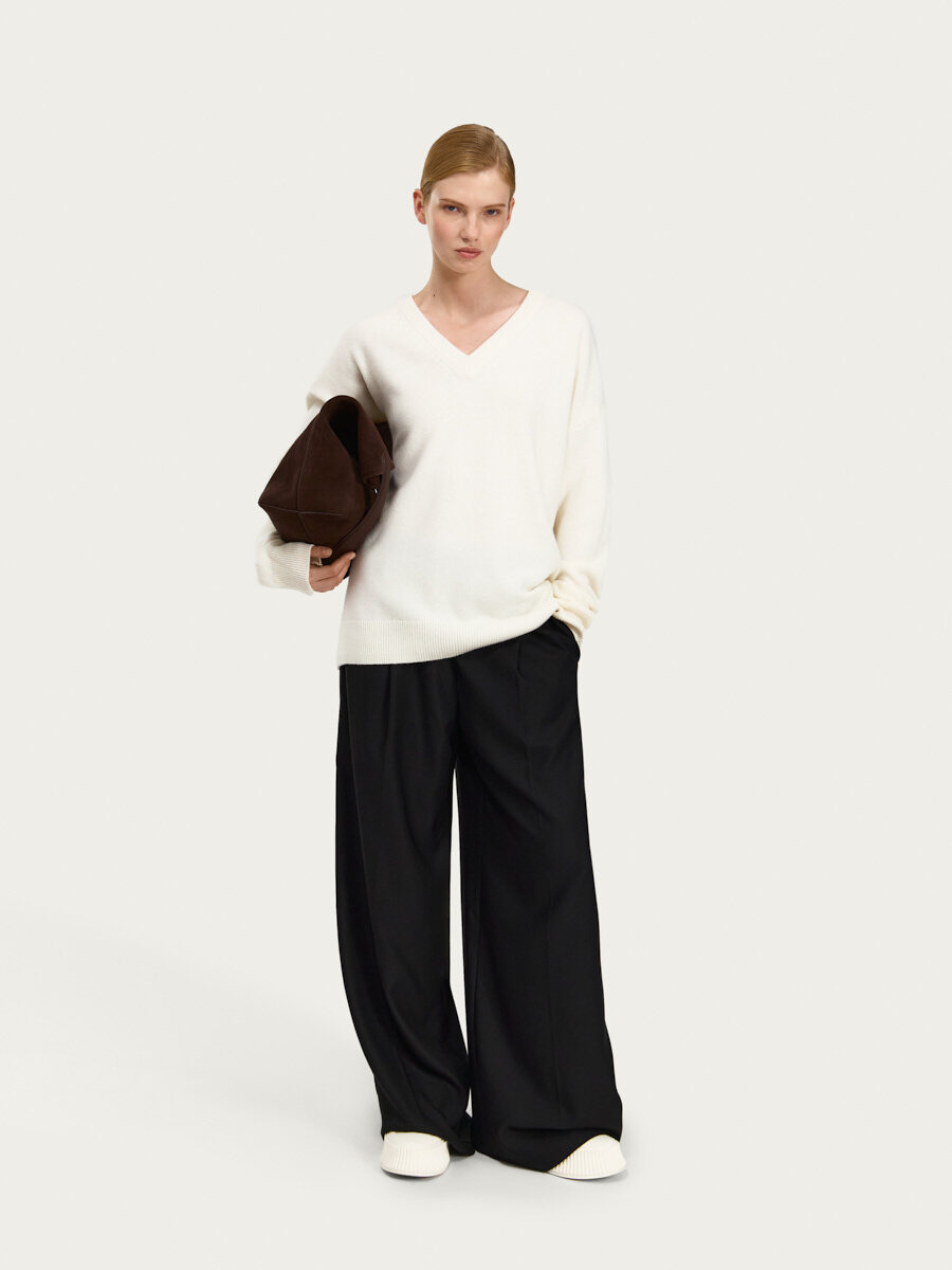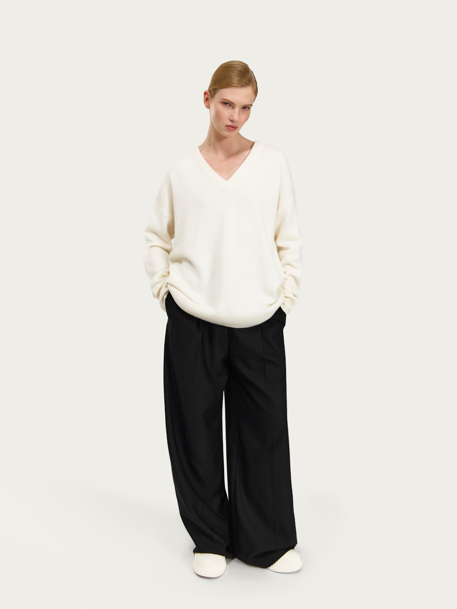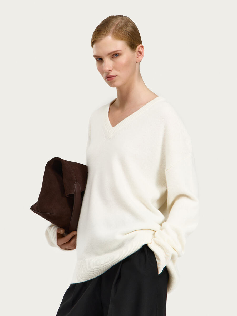 Джемпер Алекса выполнен из мягкой пряжи с содержание кашемира. Джемпер прямого оверсайз силуэта имеет спущенную линию плеча, длинный рукав и глубокий V-образный вырез.