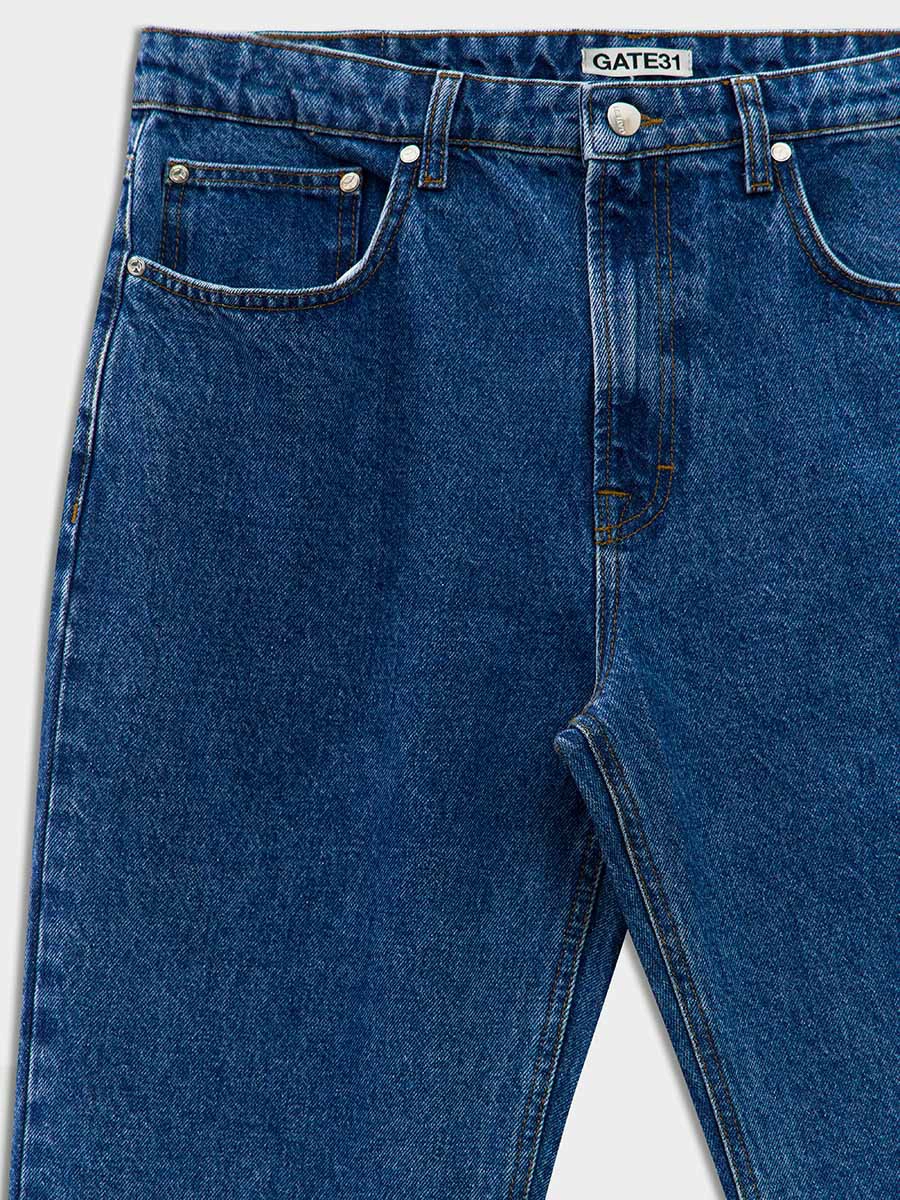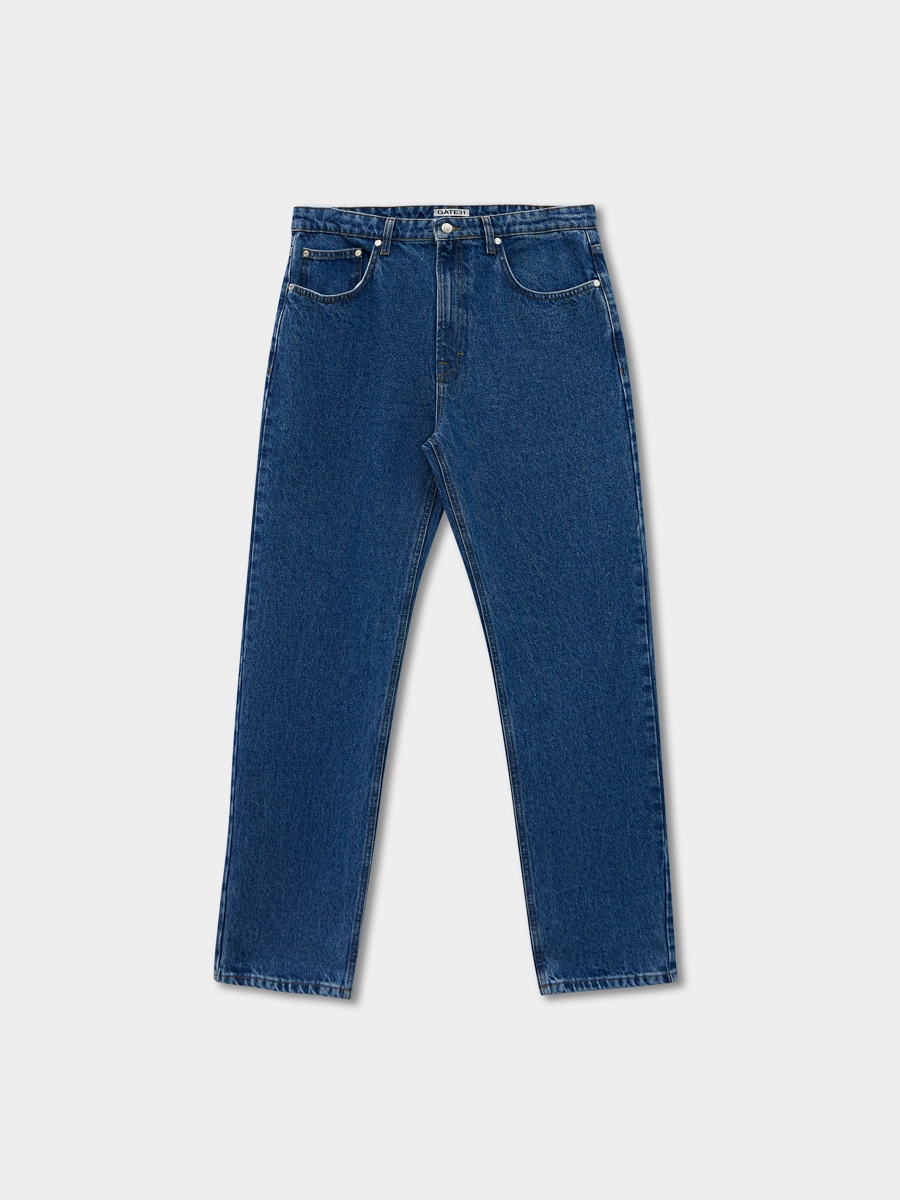 Мужские джинсы классического синего цвета прямого силуэта с притачным поясом со шлевками, пятью карманами и кокеткой сзади, застёжка на джинсовую пуговицу на поясе и металлическую молнию в гульфике.