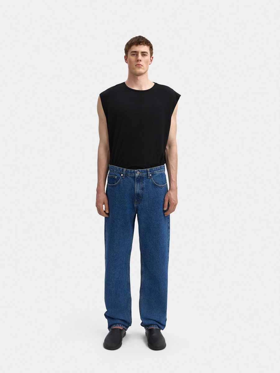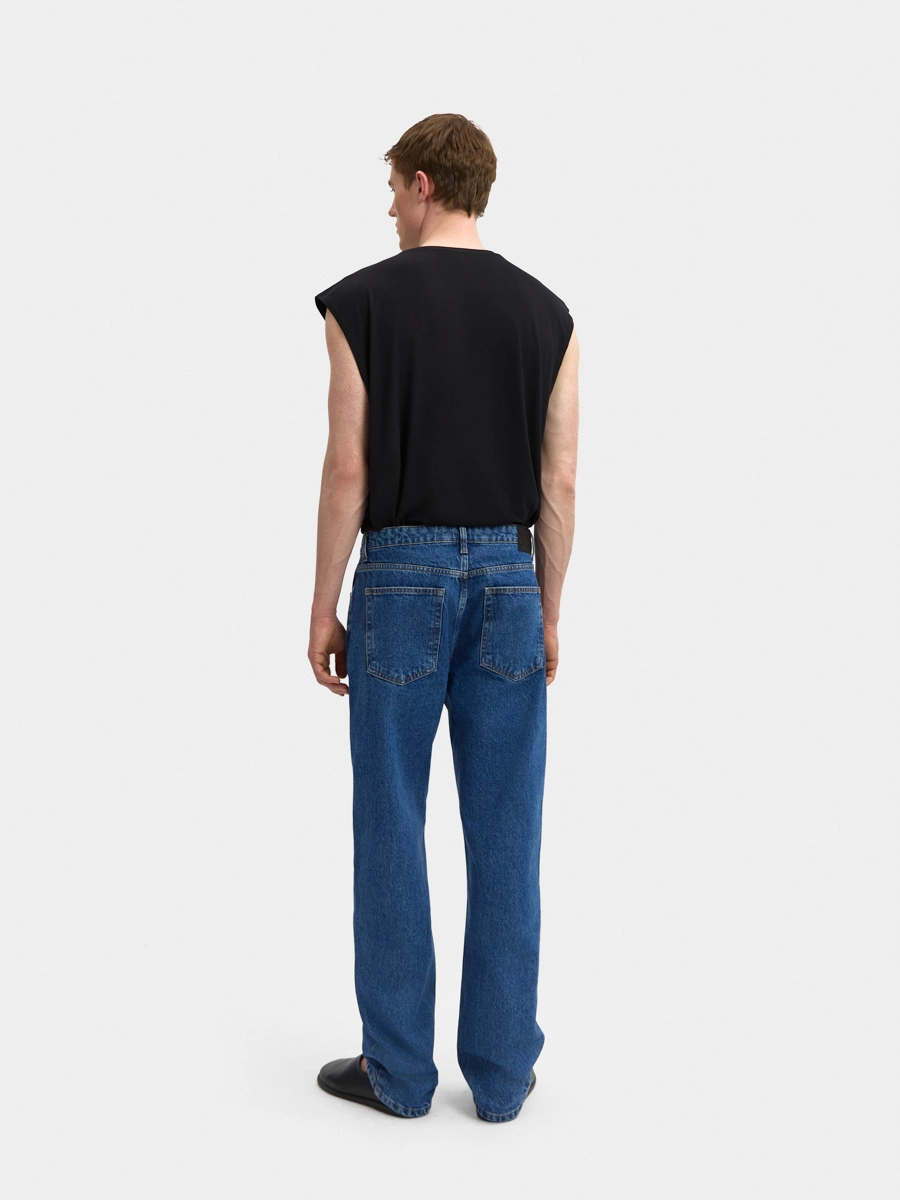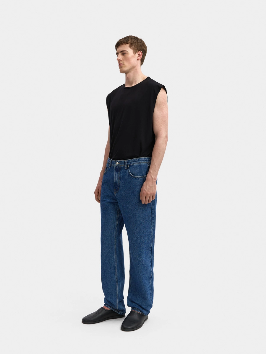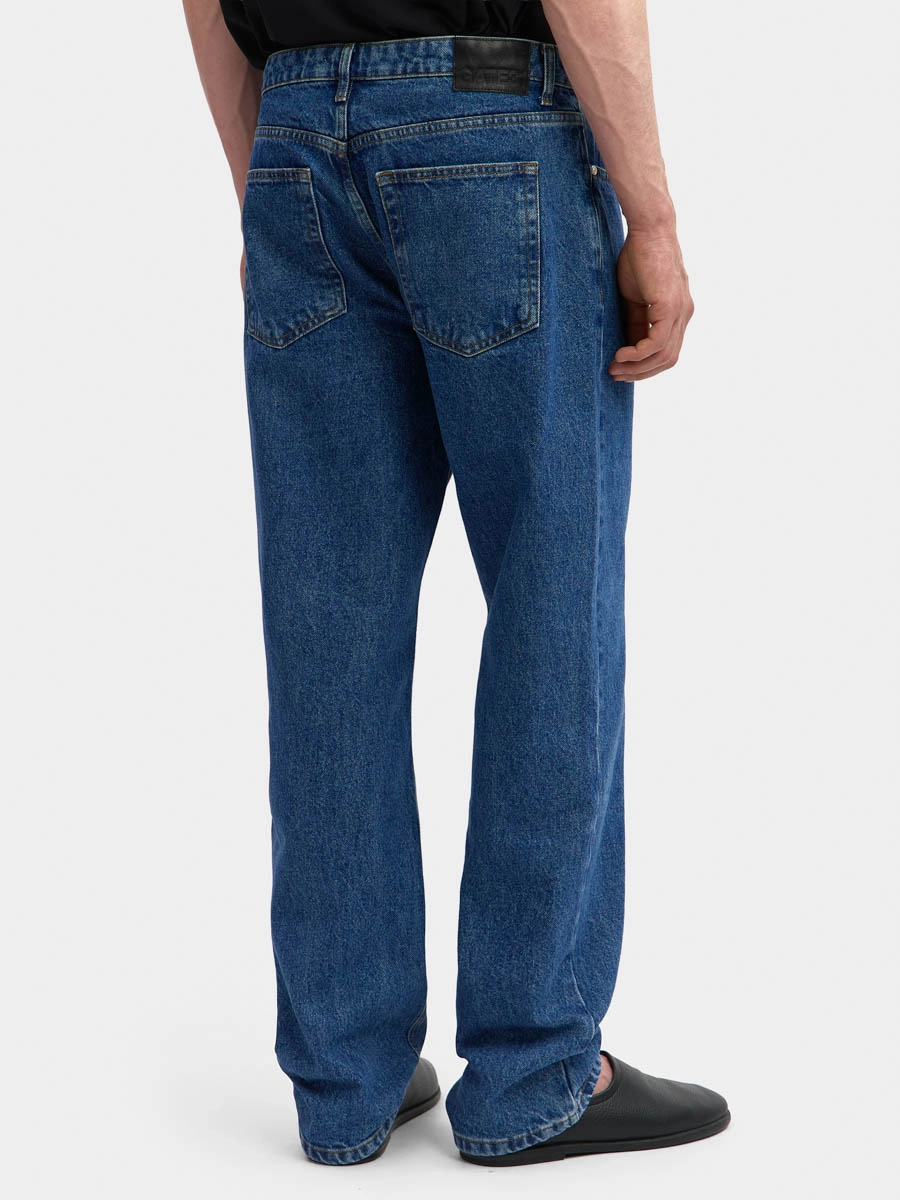 Men's jeans in classic blue feature a straight cut with an attached waistband and belt loops, five pockets, and a back yoke. They fasten with a denim button at the waist and a metal zipper fly.