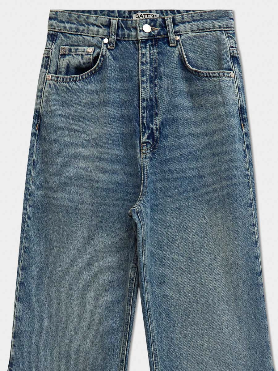Джинсы застёгиваются на молнию и джинсовую кнопку на притачном поясе со шлевками.