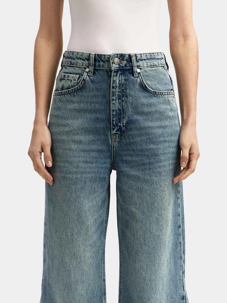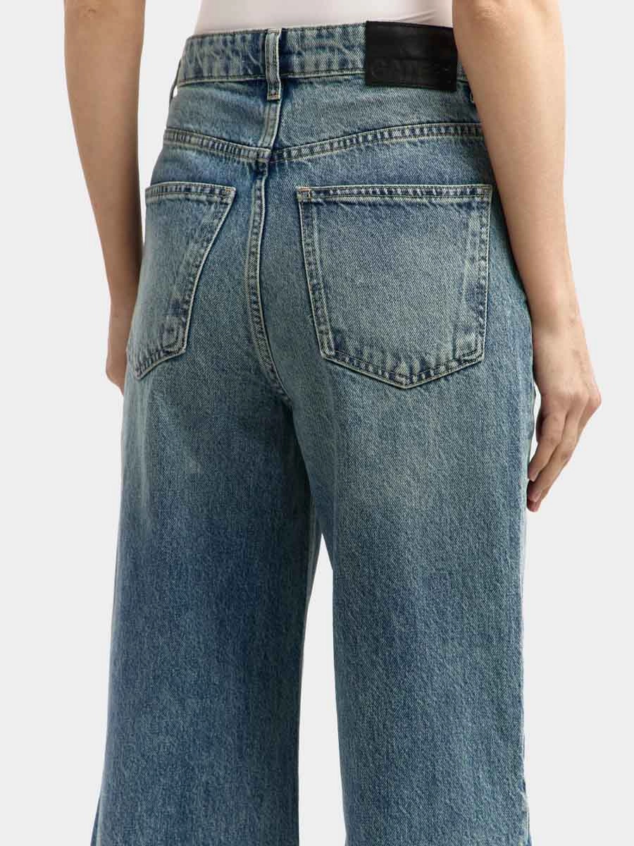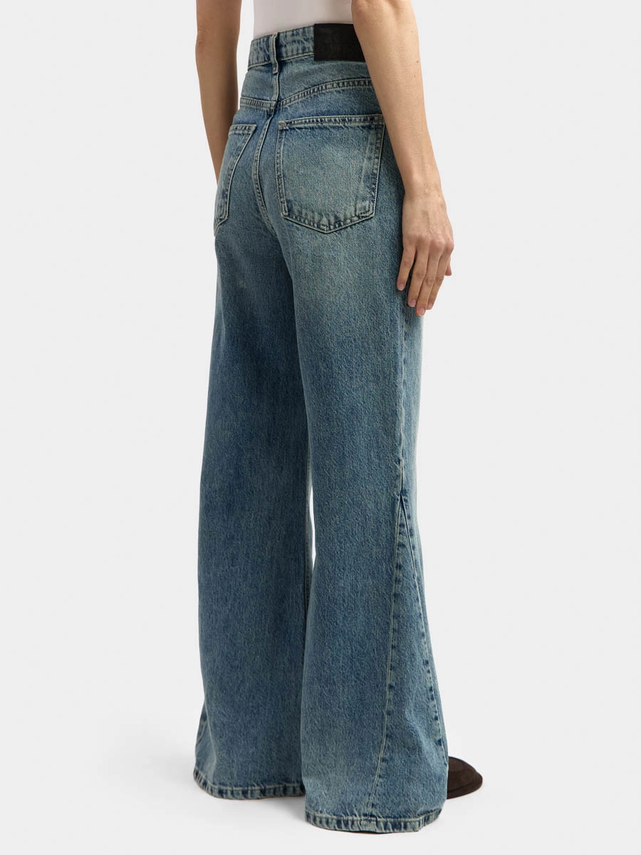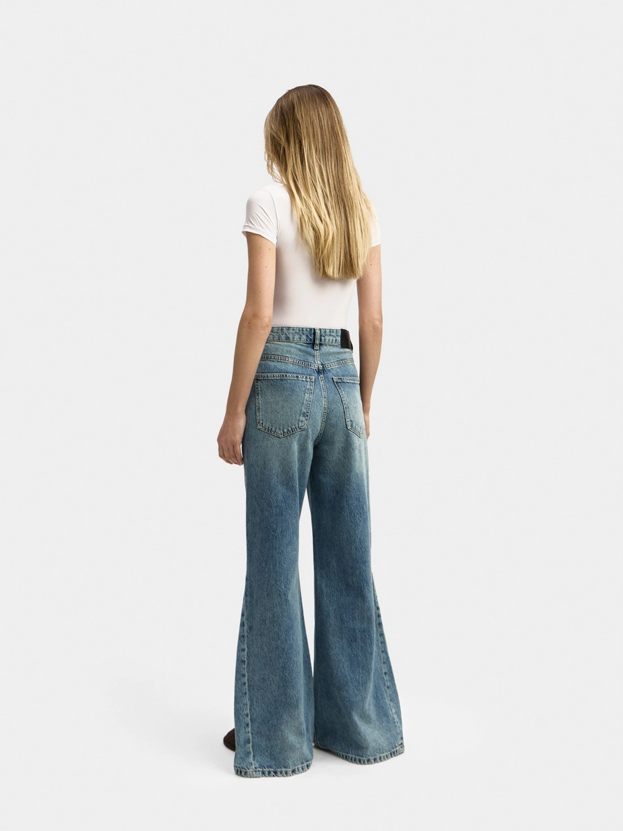 Джинсы с плавным расклешением низу выполнены из плотного денима с эффектом варки.