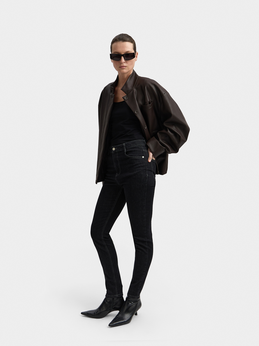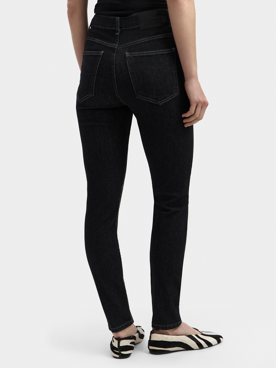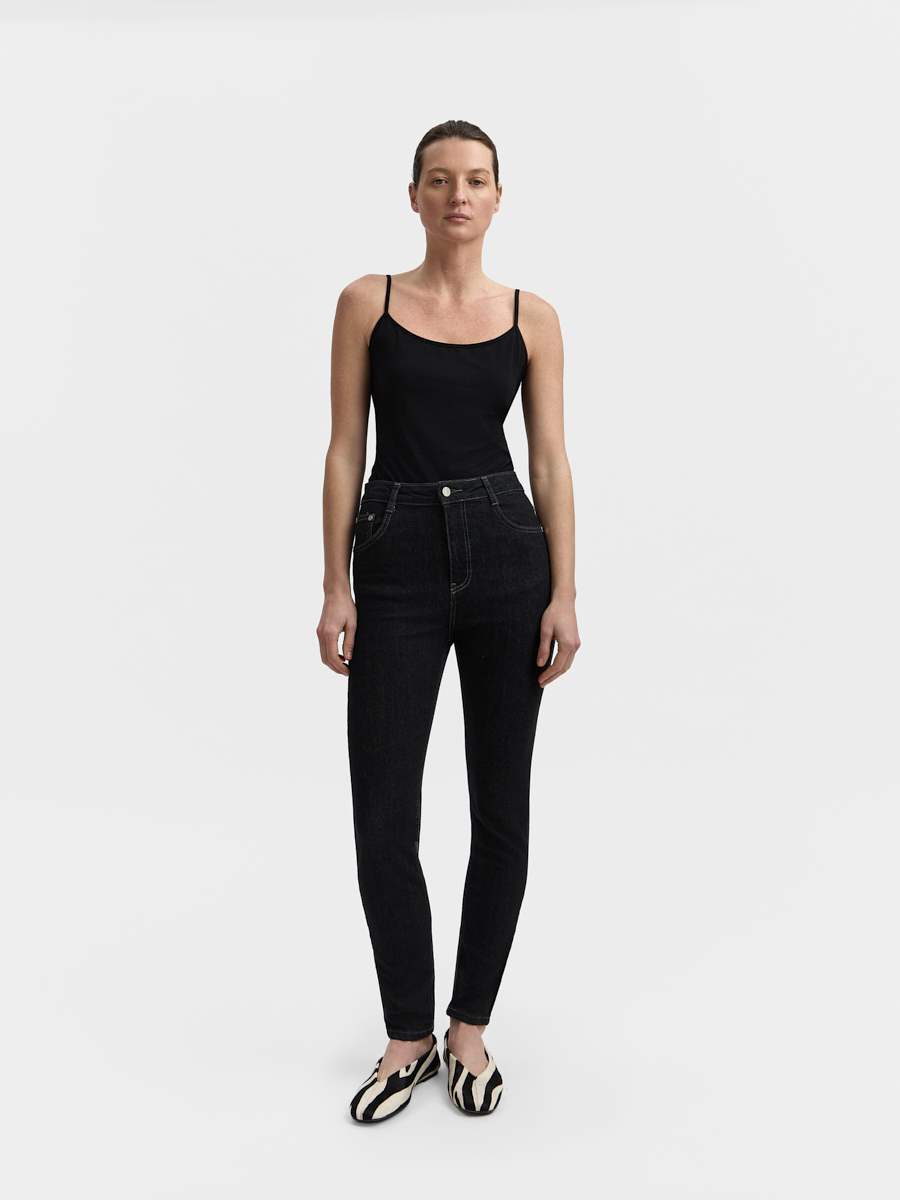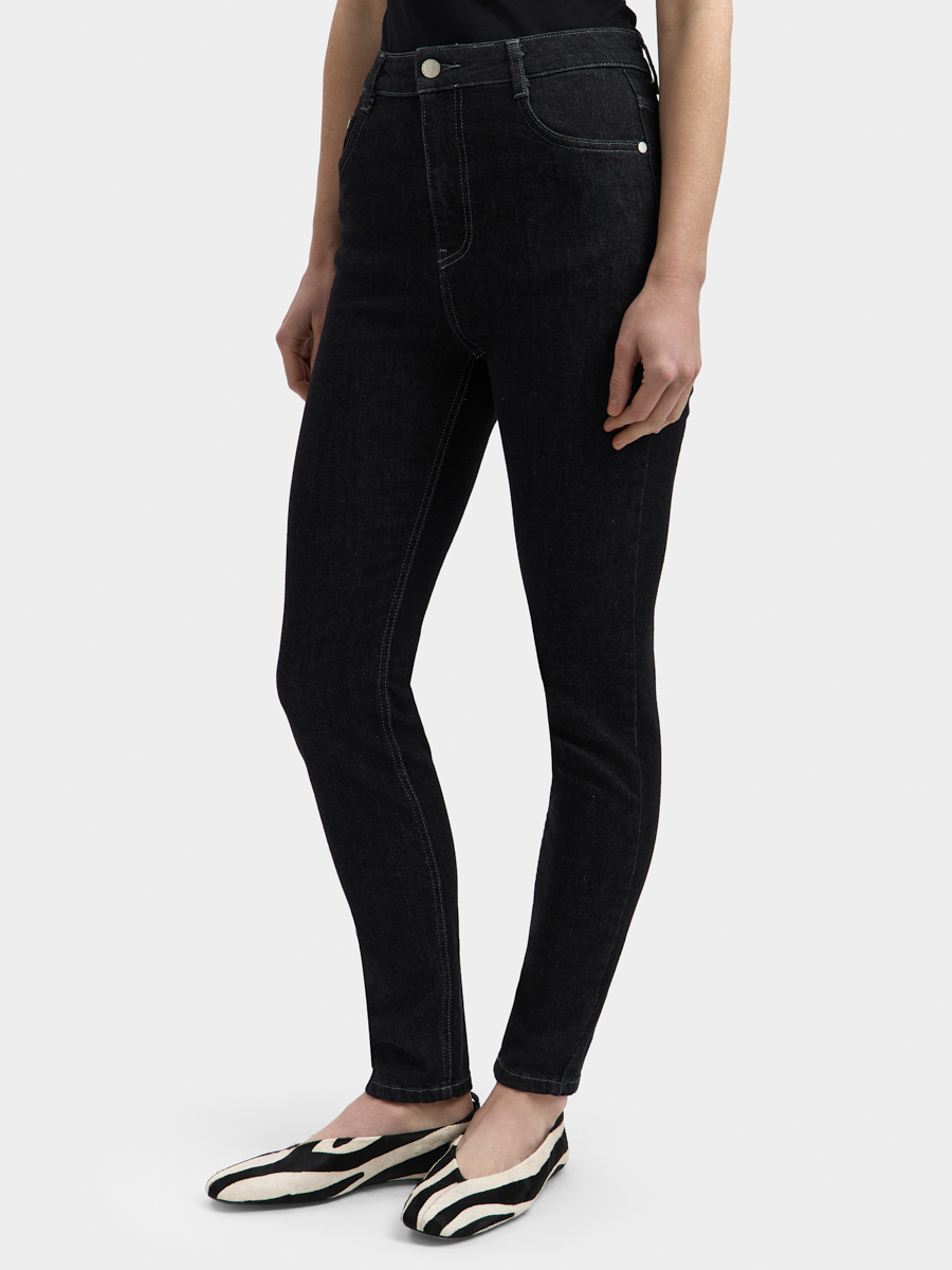 High-waisted jeans with a wide fit silhouette and a shortened length. There are a button and a zip fly, five pocket design.