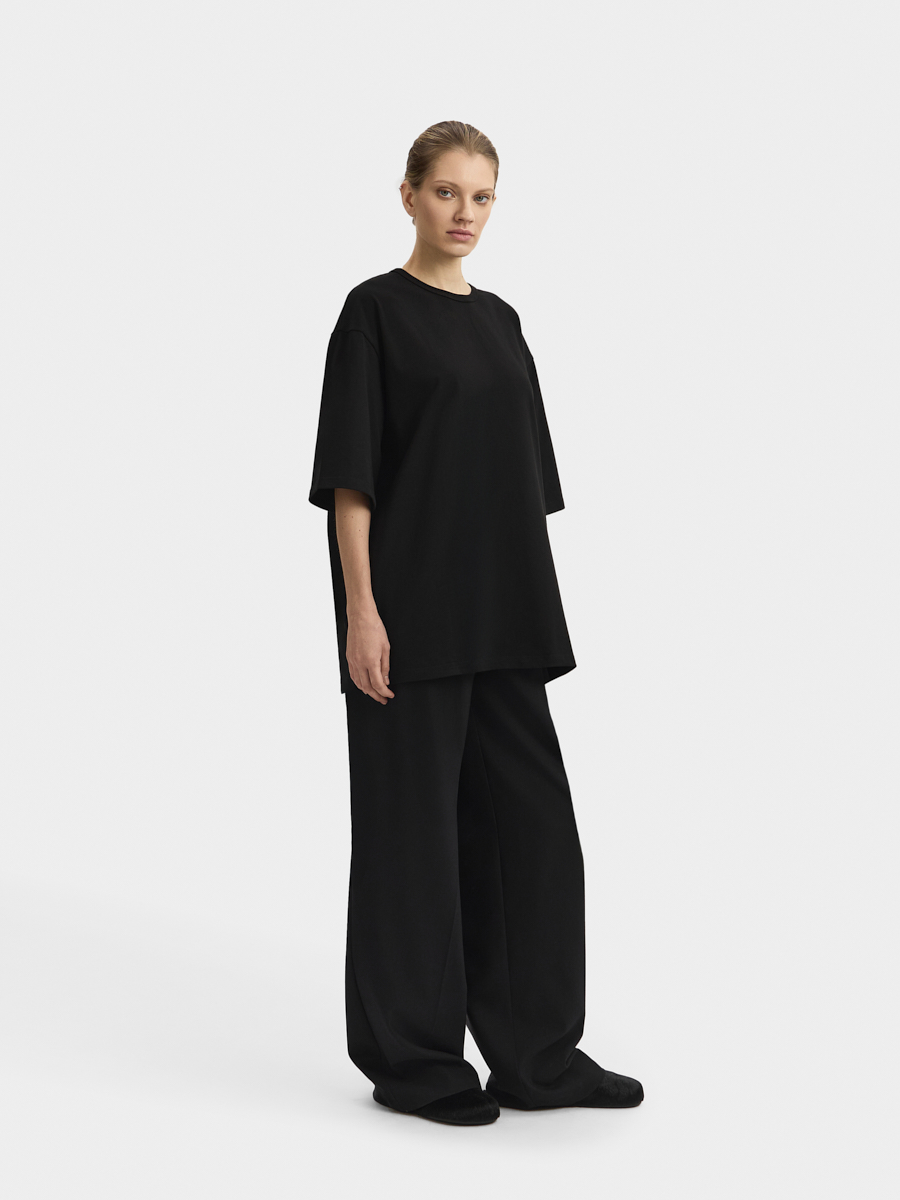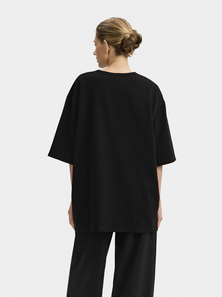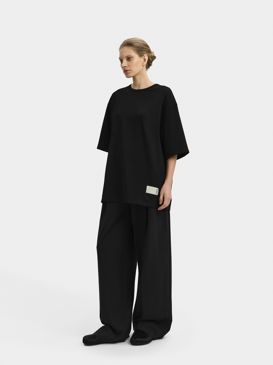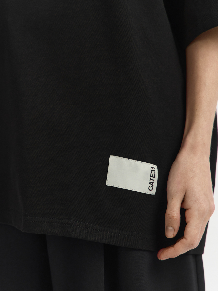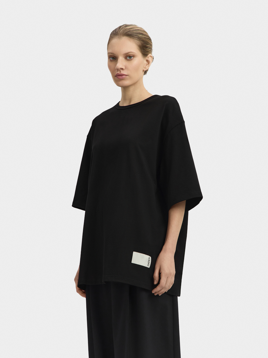Футболка имеет спущенную линию плеча, широкие рукава и окантованную рибаной горловину. Футболка выполнена из плотного хлопкового трикотажа. Внизу футболки расположено фирменное лого. Футболка дополнит ваш гардероб.