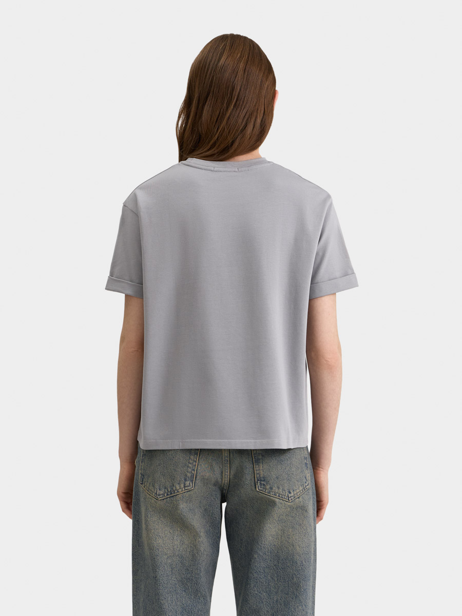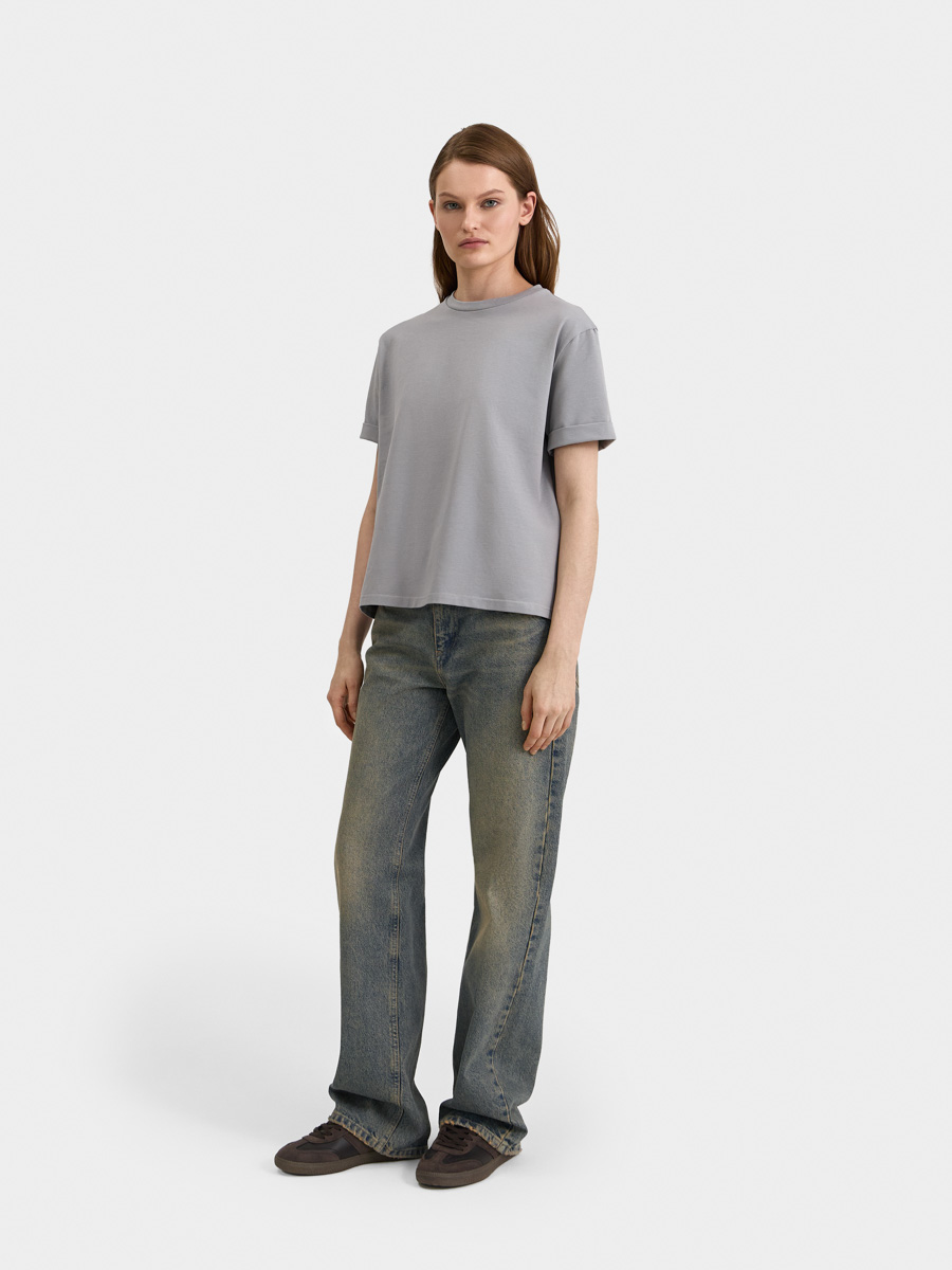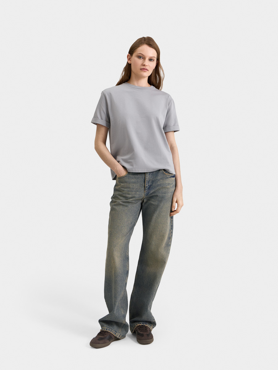 Базовая футболка с круглым вырезом и коротким рукавом. Выполнена из хлопкового трикотажа с добавлением эластана.