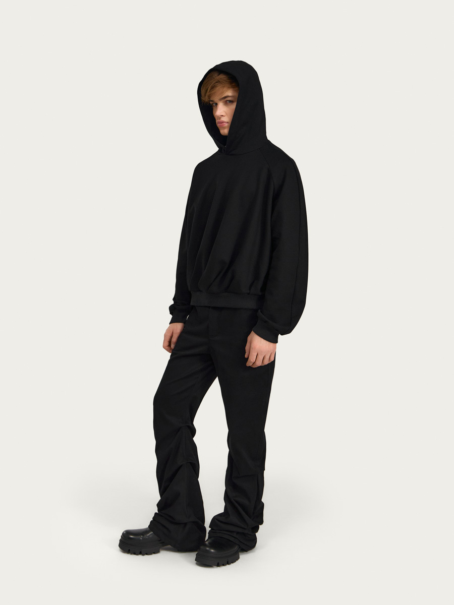 Худи с наклонными складками по низу создает эффект “закрученного” изделия.