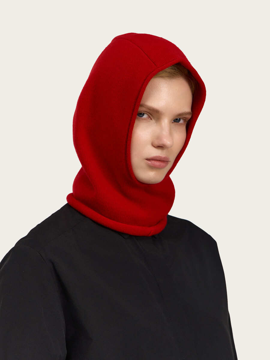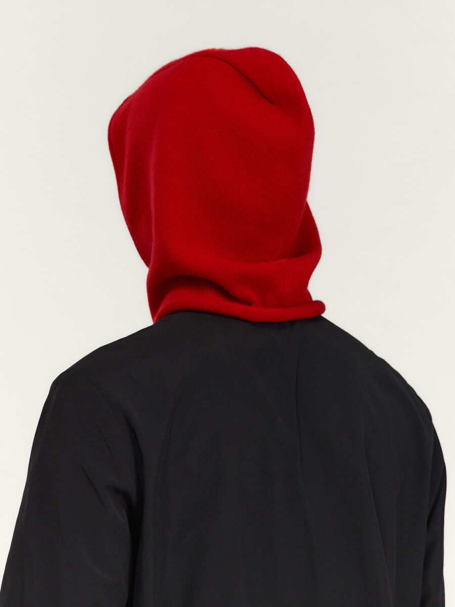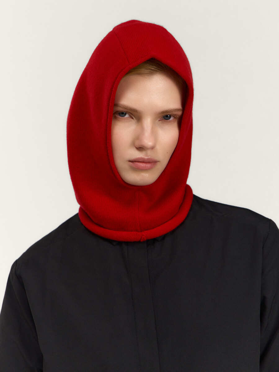 Капор из шерсти мериноса связан лицевой гладью, вырез для лица и линия низа капора имеют слегка скрученные края.