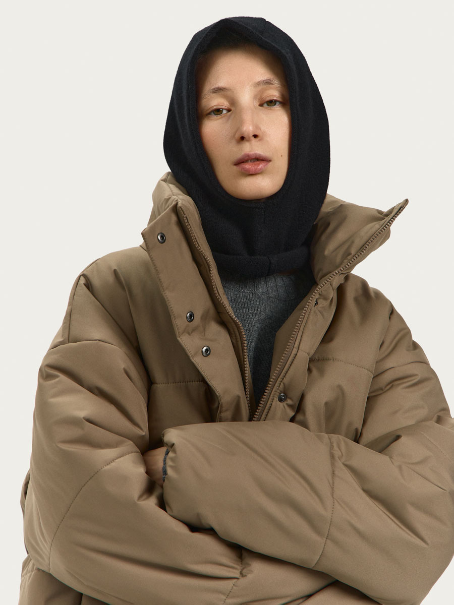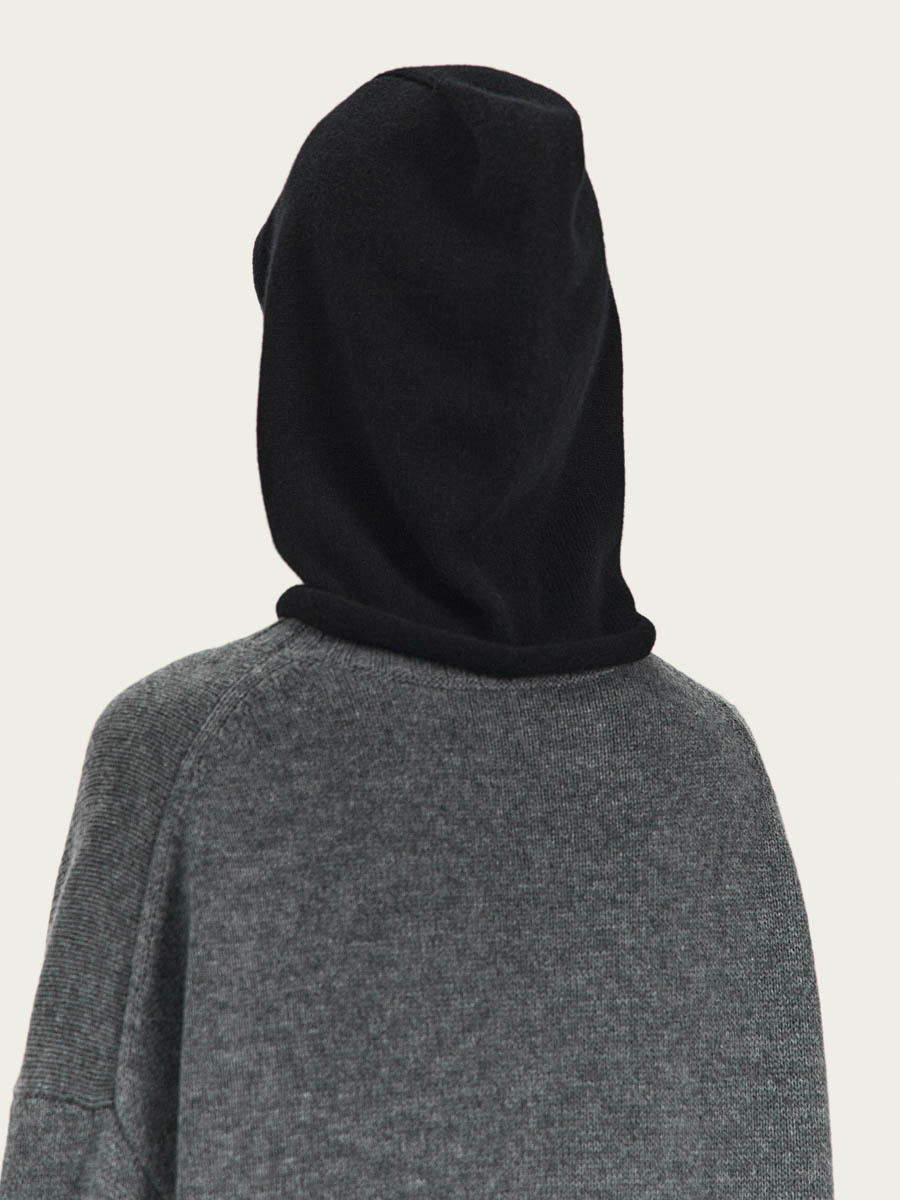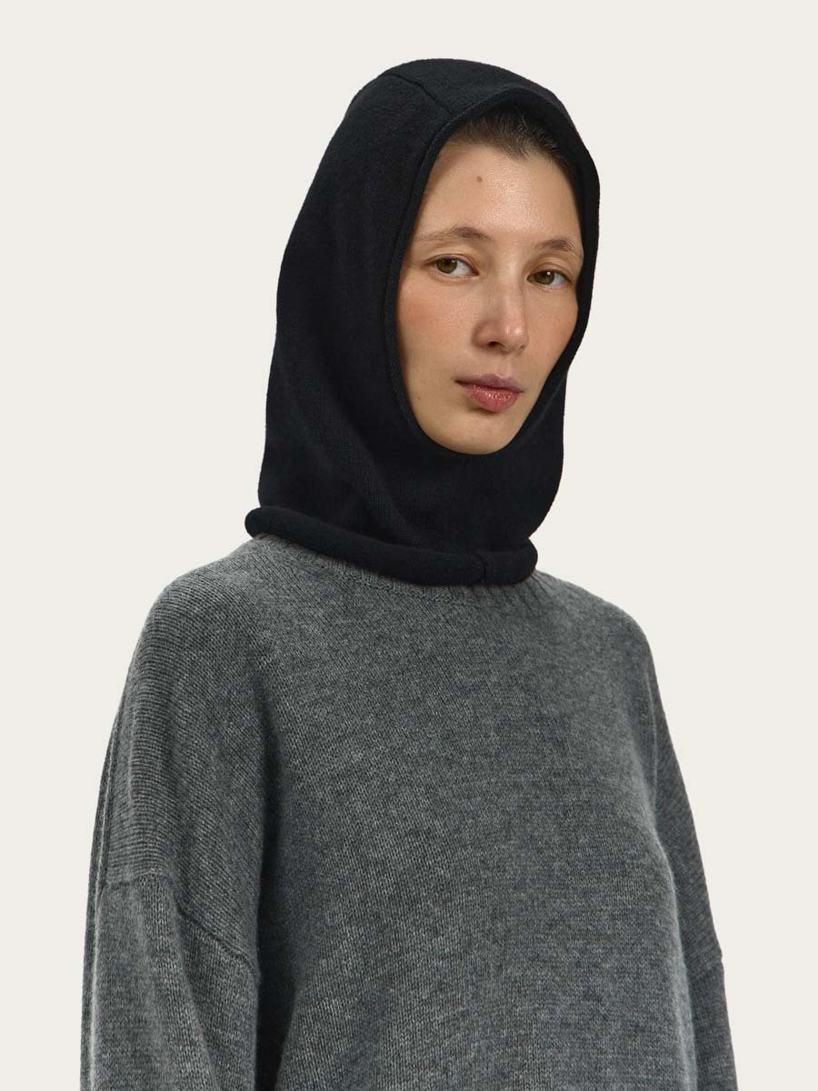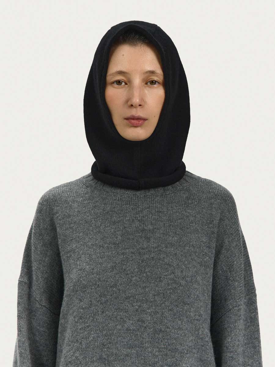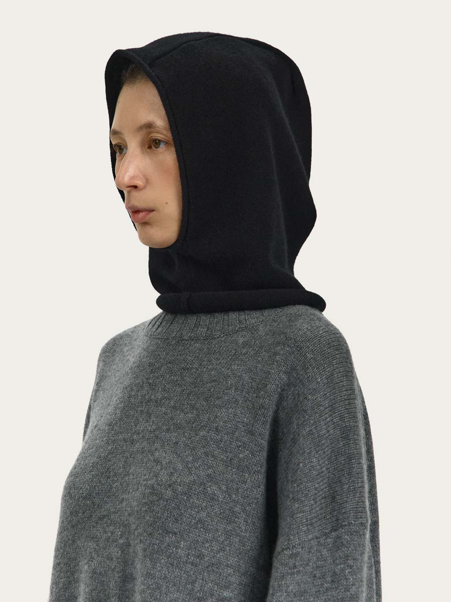 Капор из шерсти мериноса связан лицевой гладью, вырез для лица и линия низа капора имеют слегка скрученные края.