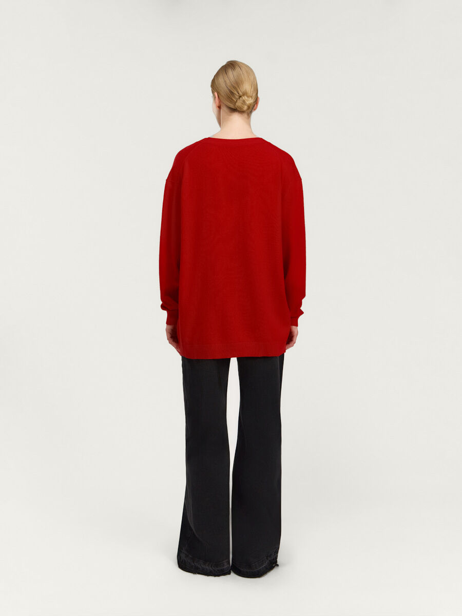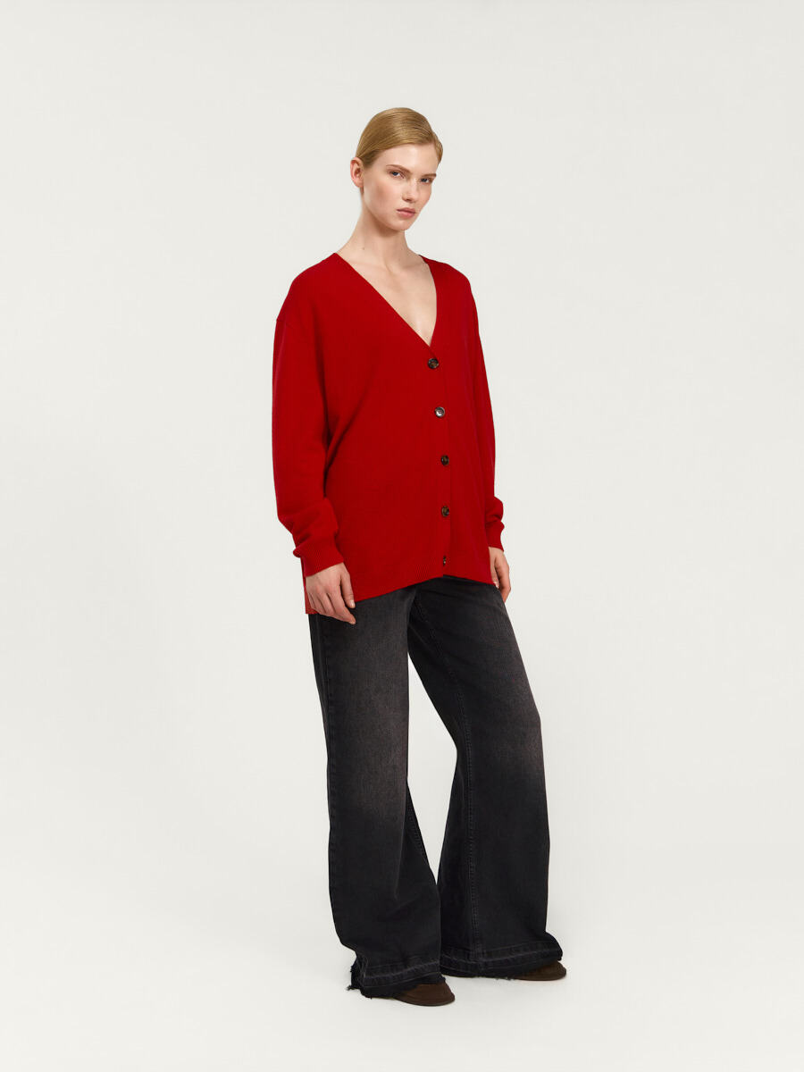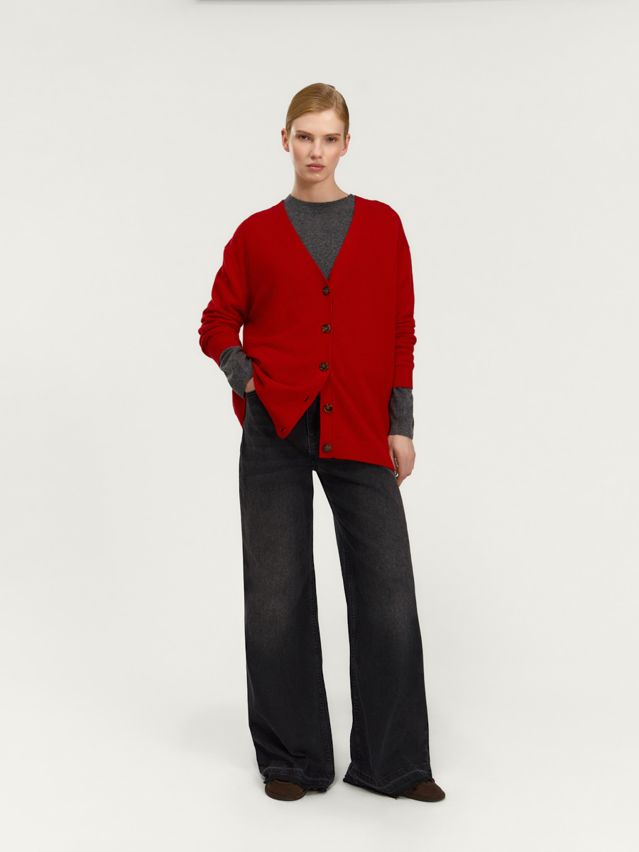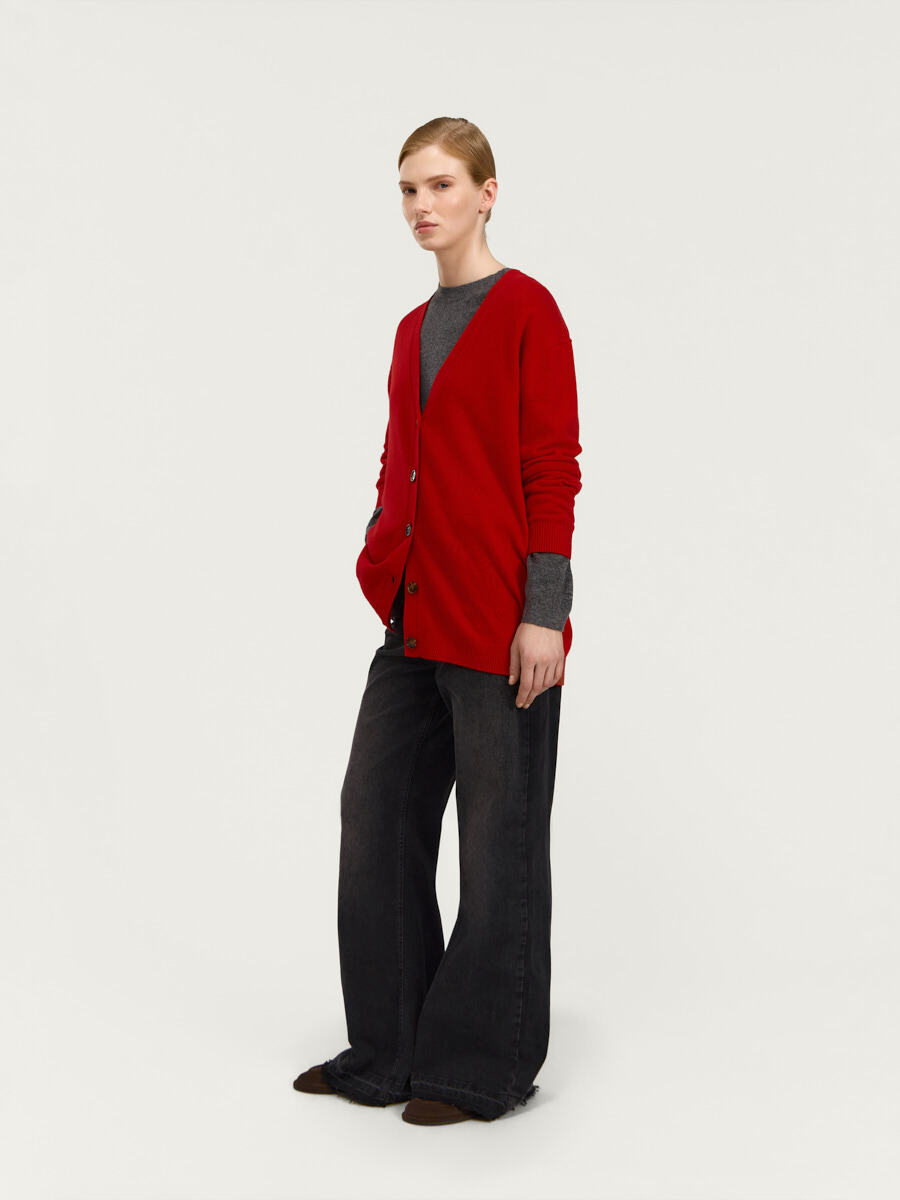 Удлиненный кардиган прямого оверсайз силуэта имеет втачной рукав, глубокий V-образный вырез и застежку на петли и пуговицы. Низ рукавов и низ изделия выполненны вязкой “резинка”.