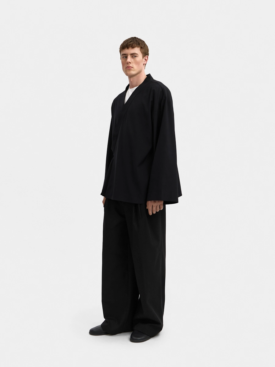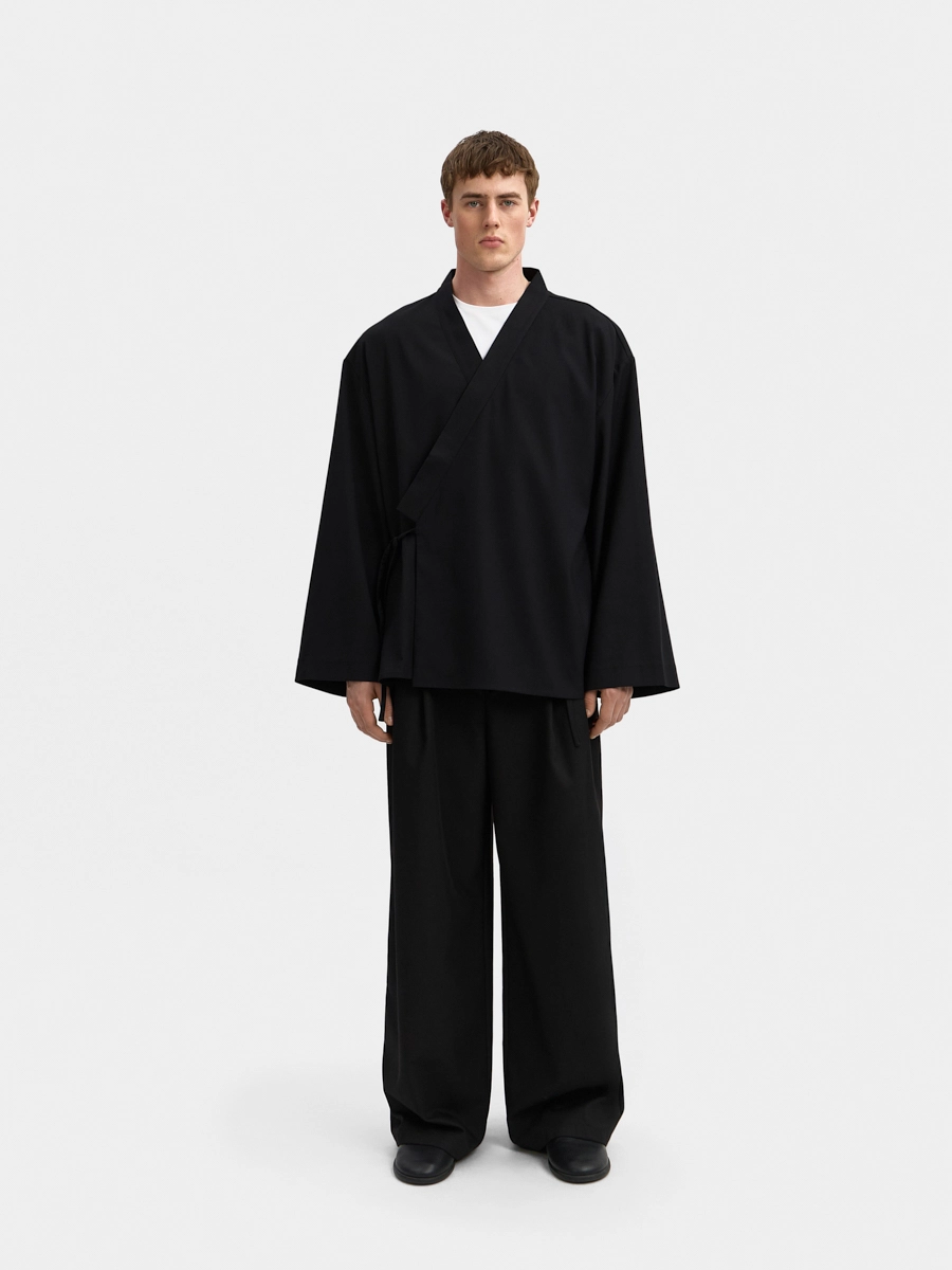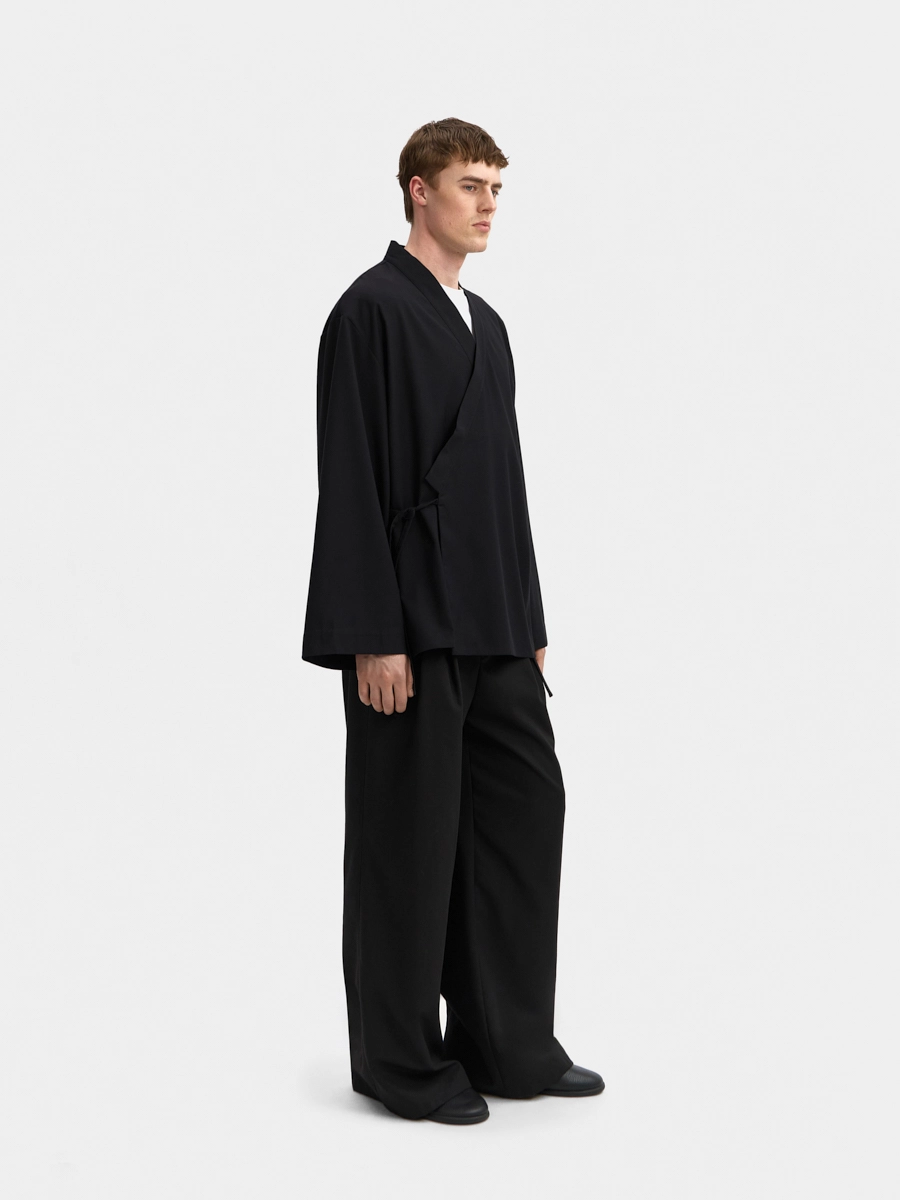 Кимоно Райан с разрезами составляет костюм с брюками Райан с асимметричным поясом.