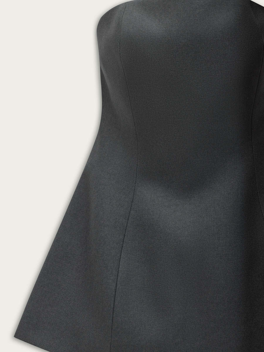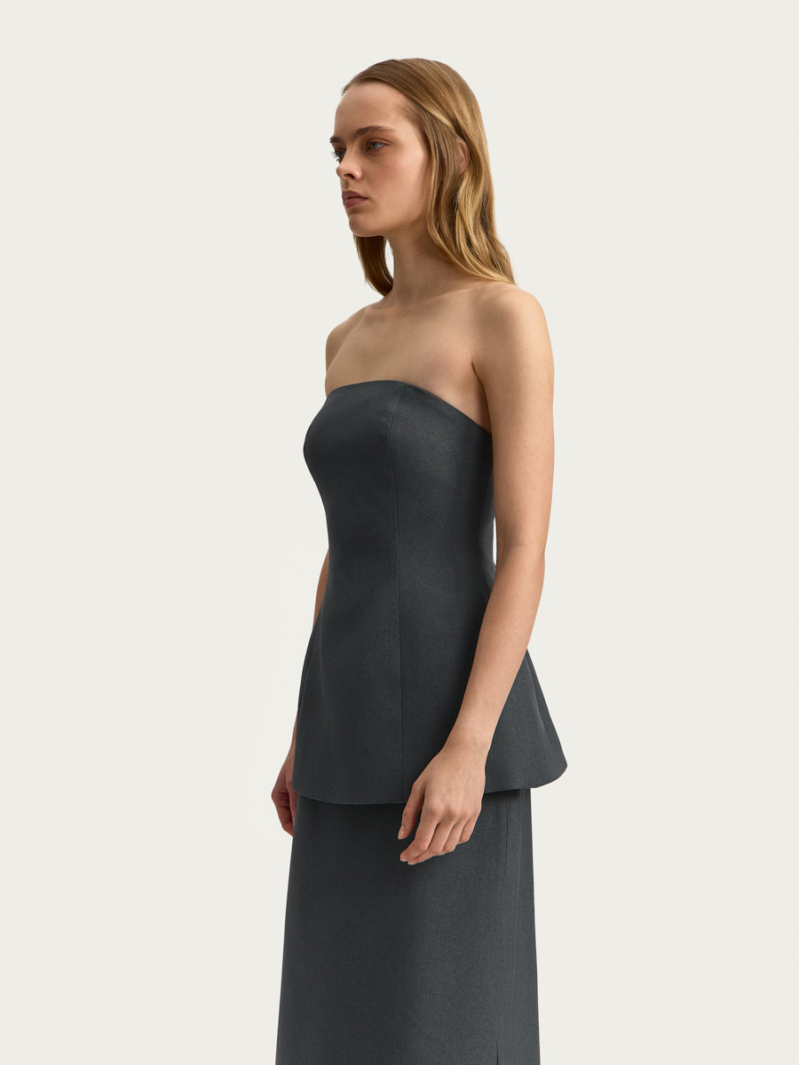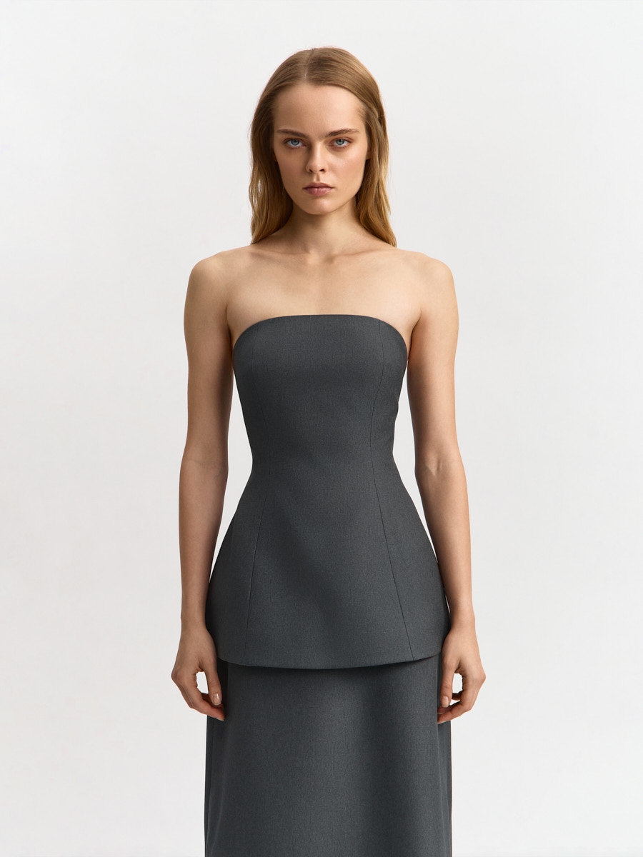 Мягкий корсет плотно прилегает по груди и расширяется на бедрах плавными округлыми линиями. Перед и спинка с рельефами. В среднем шве спинки обработана застежка на потайную молнию.