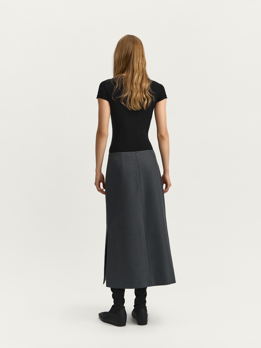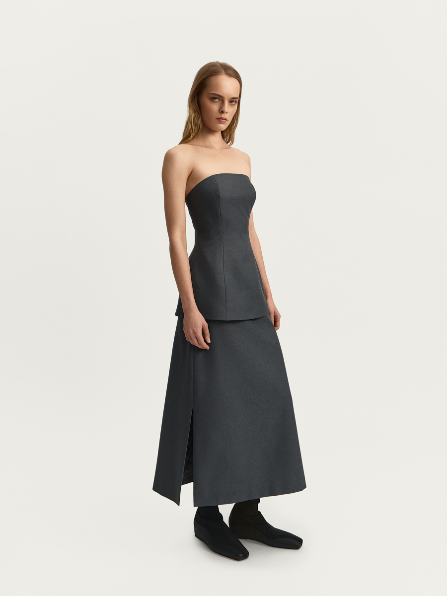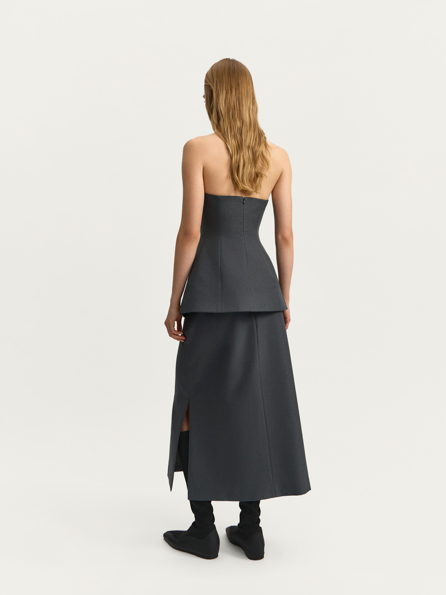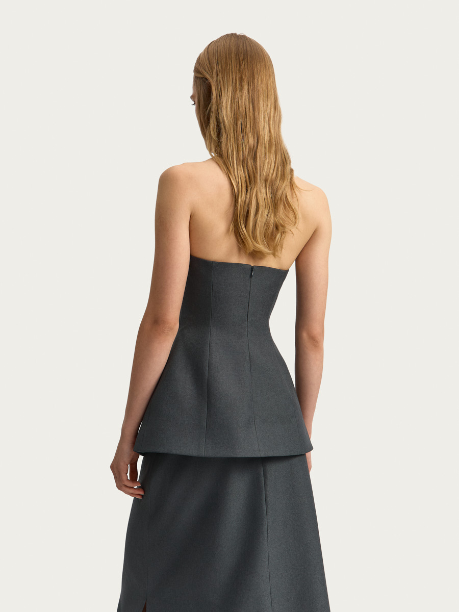 Мягкий корсет плотно прилегает по груди и расширяется на бедрах плавными округлыми линиями. Перед и спинка с рельефами. В среднем шве спинки обработана застежка на потайную молнию.