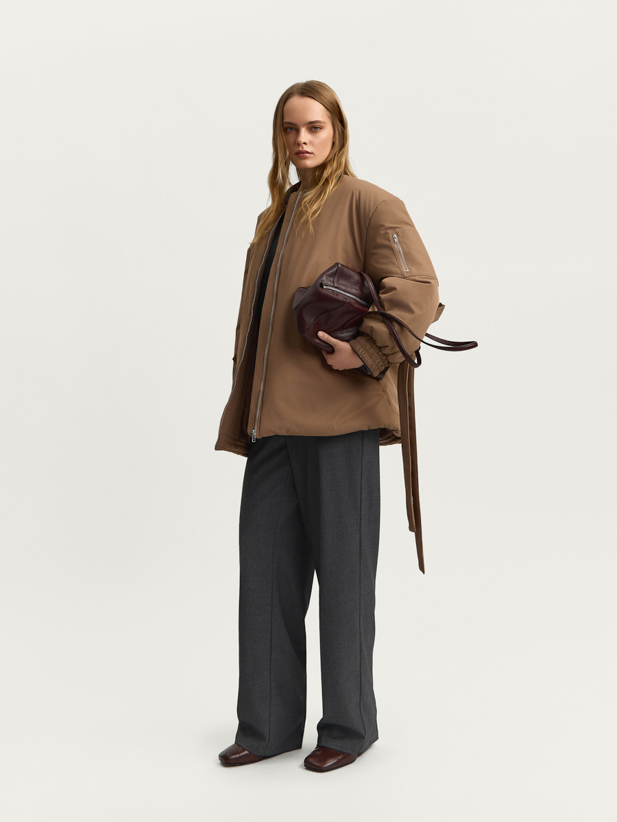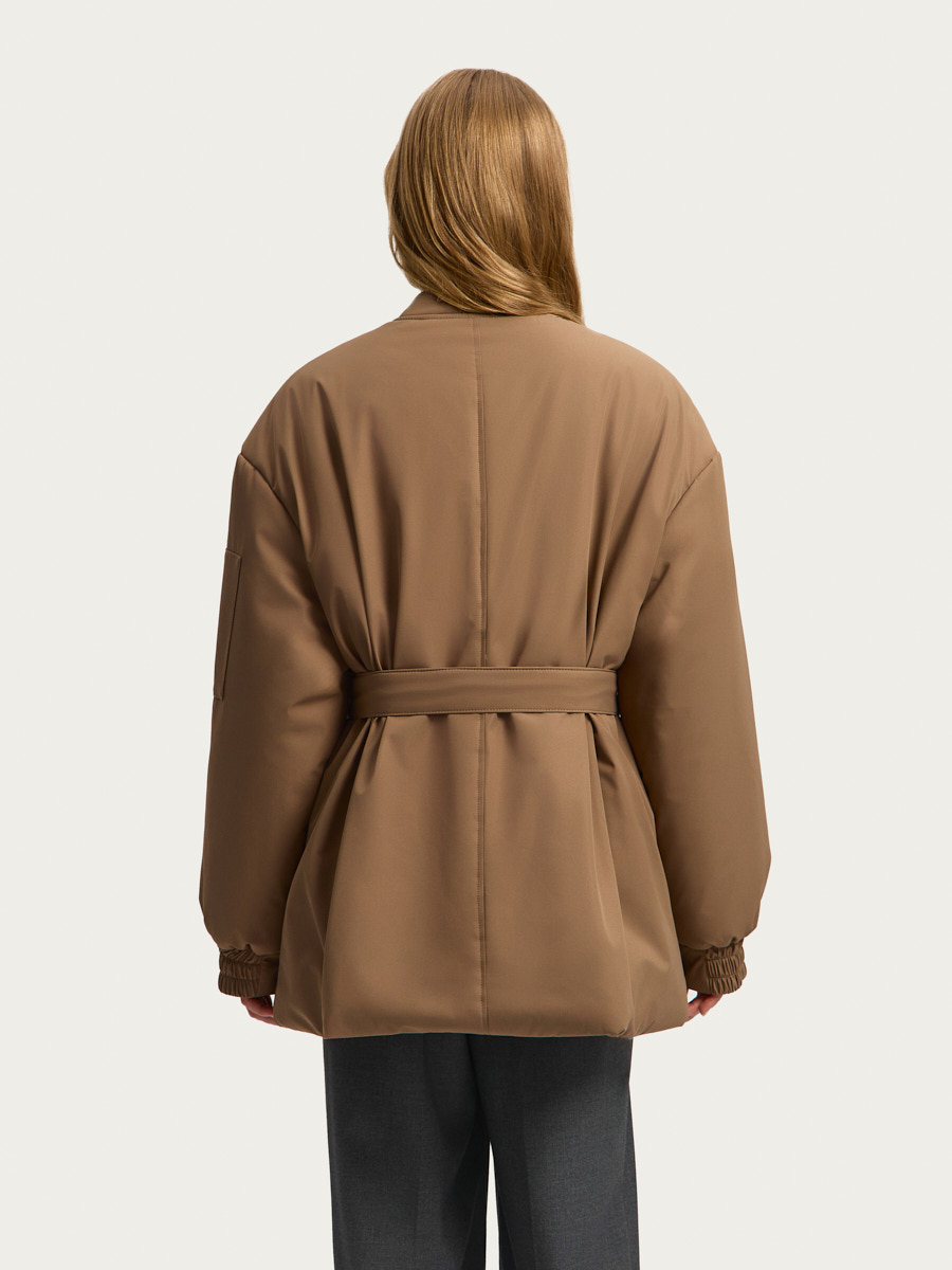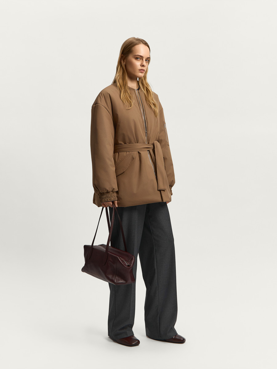 Куртка А-силуэта с застежкой на металлическую молнию имеет воротник-стойку, объемный рукав с накладным карманом на молнии и эластичной манжетой по низу, съемный пояс для приталивания и шляпную резинку со стопорами в боковых швах для регулировки объема по низу.