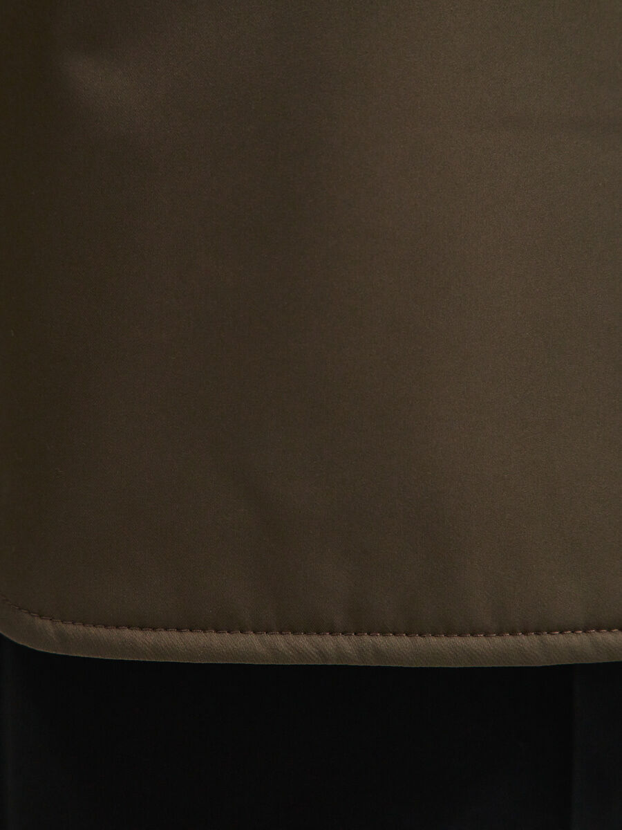 Куртка прямого кроя с воротником-стойкой и застежкой на потайные кнопки, на полочках прорезные карманы с настрочной листочкой, боковые швы с небольшими скругленными разрезами внизу, линия низа разноуровневая (спинка длиннее переда).