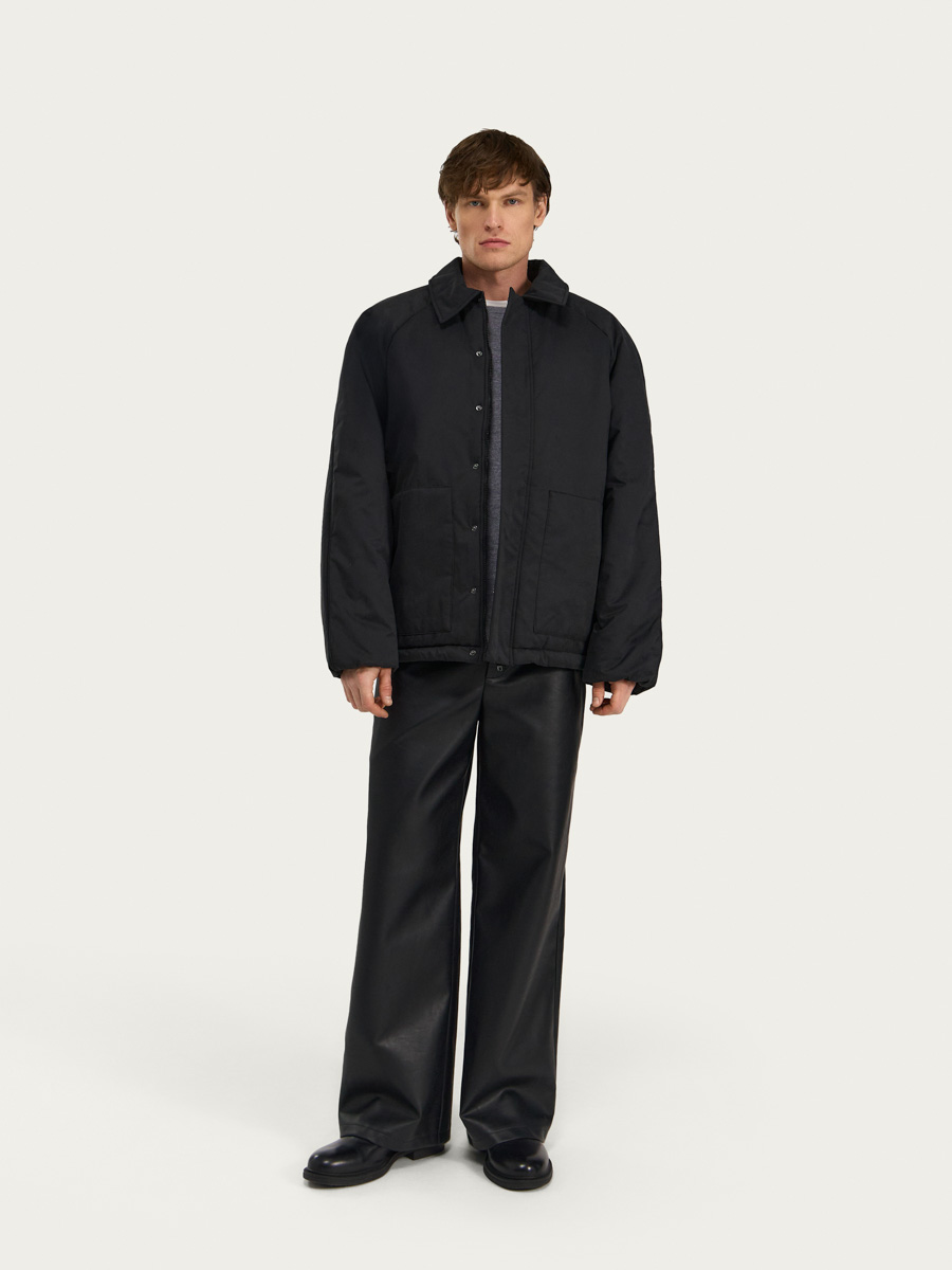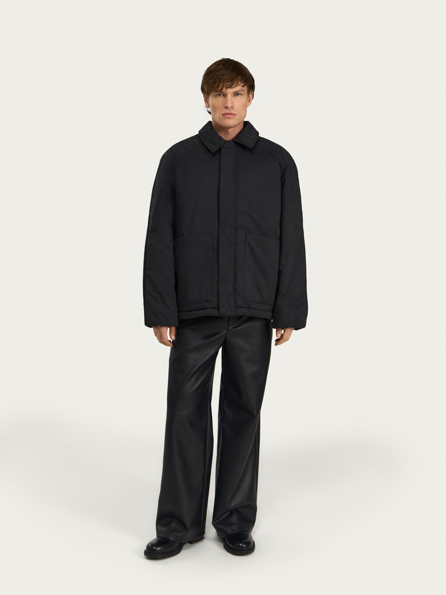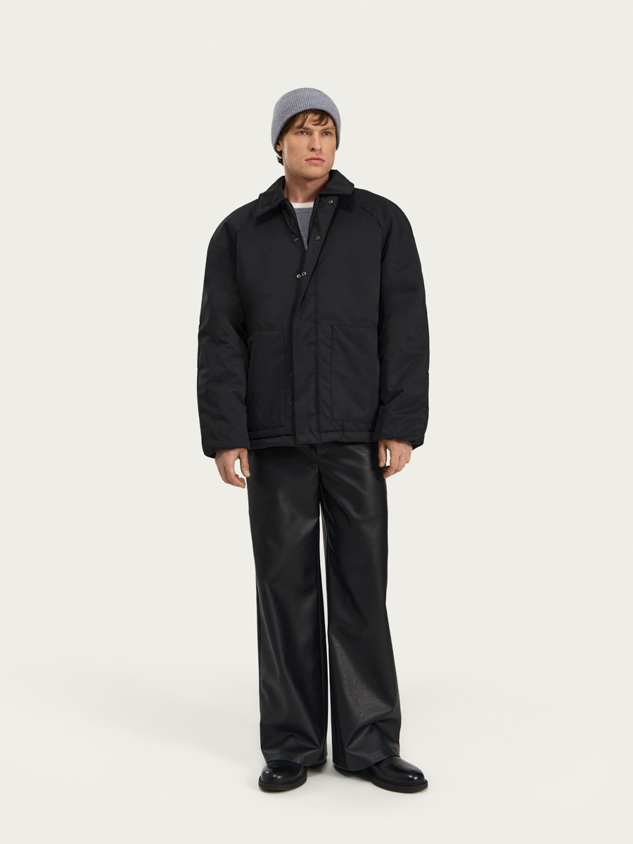 Куртка имеет застежку на молнию и потайные кнопки вдоль планки, накладные карманы с подкладкой из теплого флиса и воротник со стойкой.