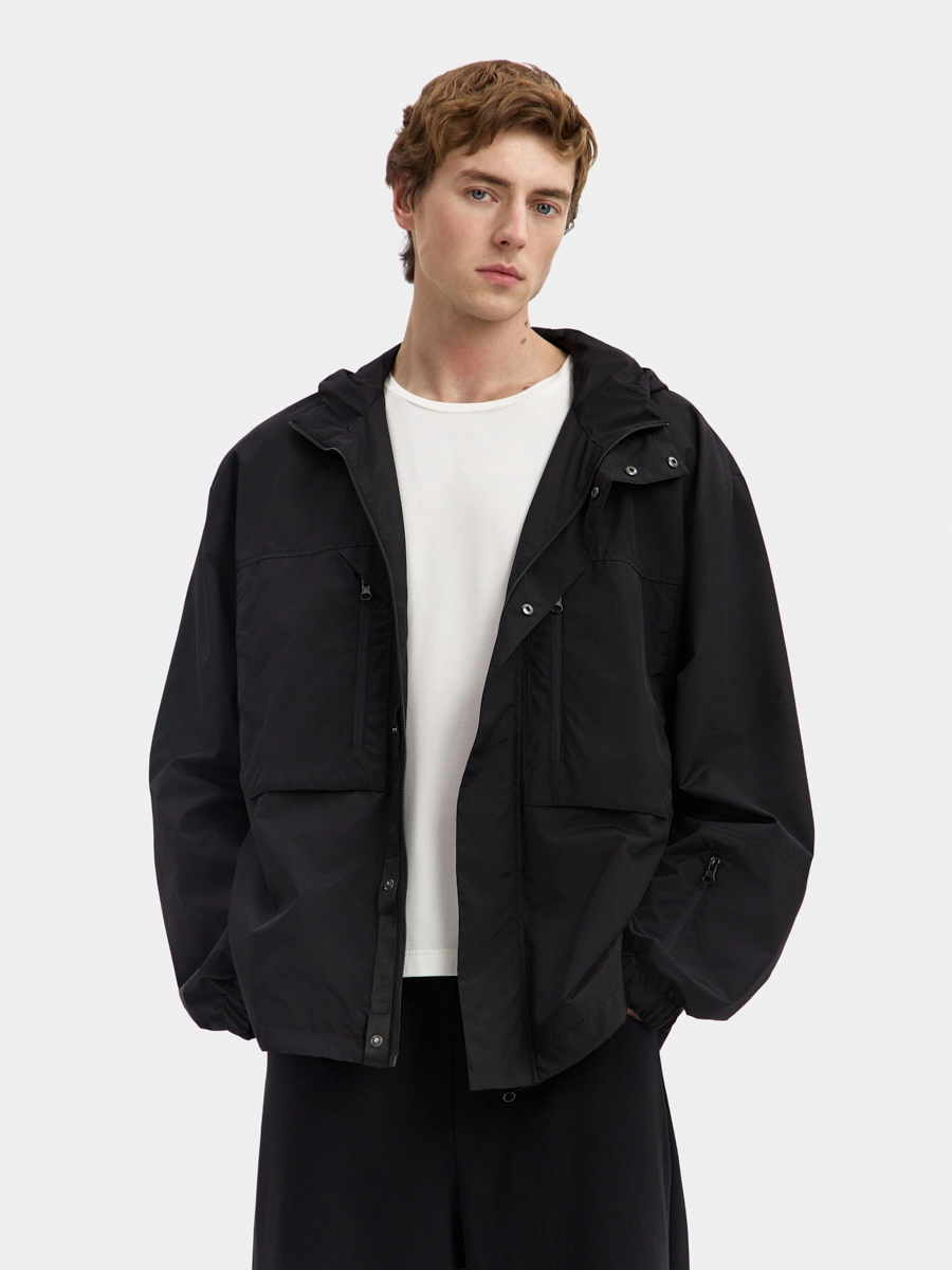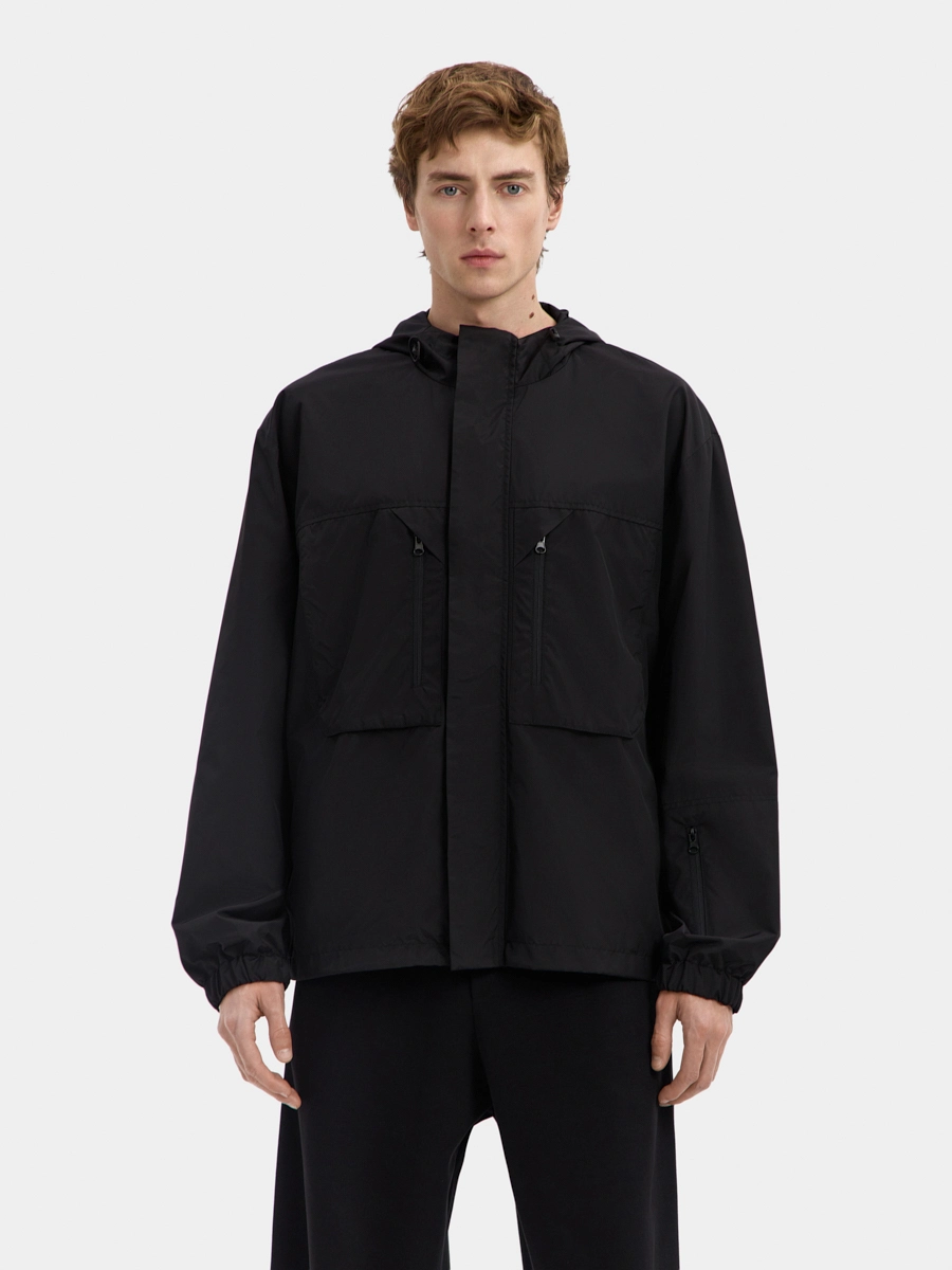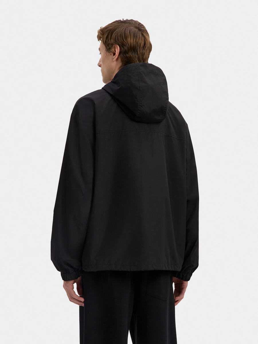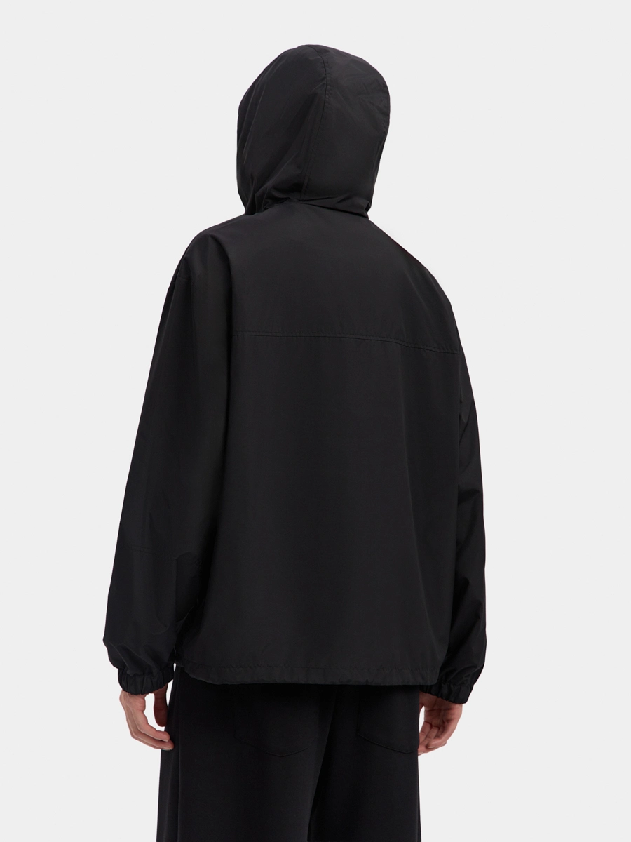 A quilted jacket with an oversized voluminous fit has a cocoon silhouette. There are a side-seam pockets, a buttoned clasp and a hood. The garment has no lining, all of the seams are bound.