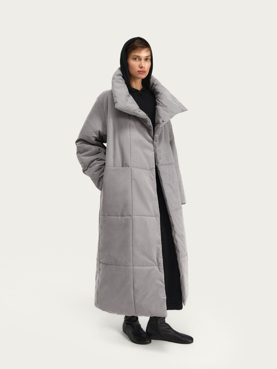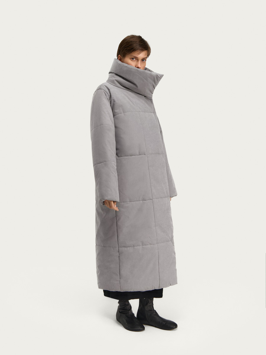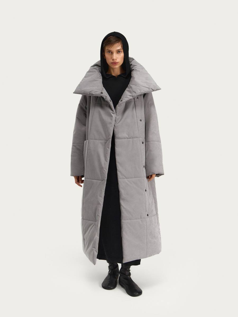 Изделие прямого силуэта имеет спущенную линию плеча, высокий воротник-стойку, накладной карман справа и карманы в боковых швах, застежку на потайные кнопки и внутренний карман. Объемный воротник фиксируется с помощью магнита.