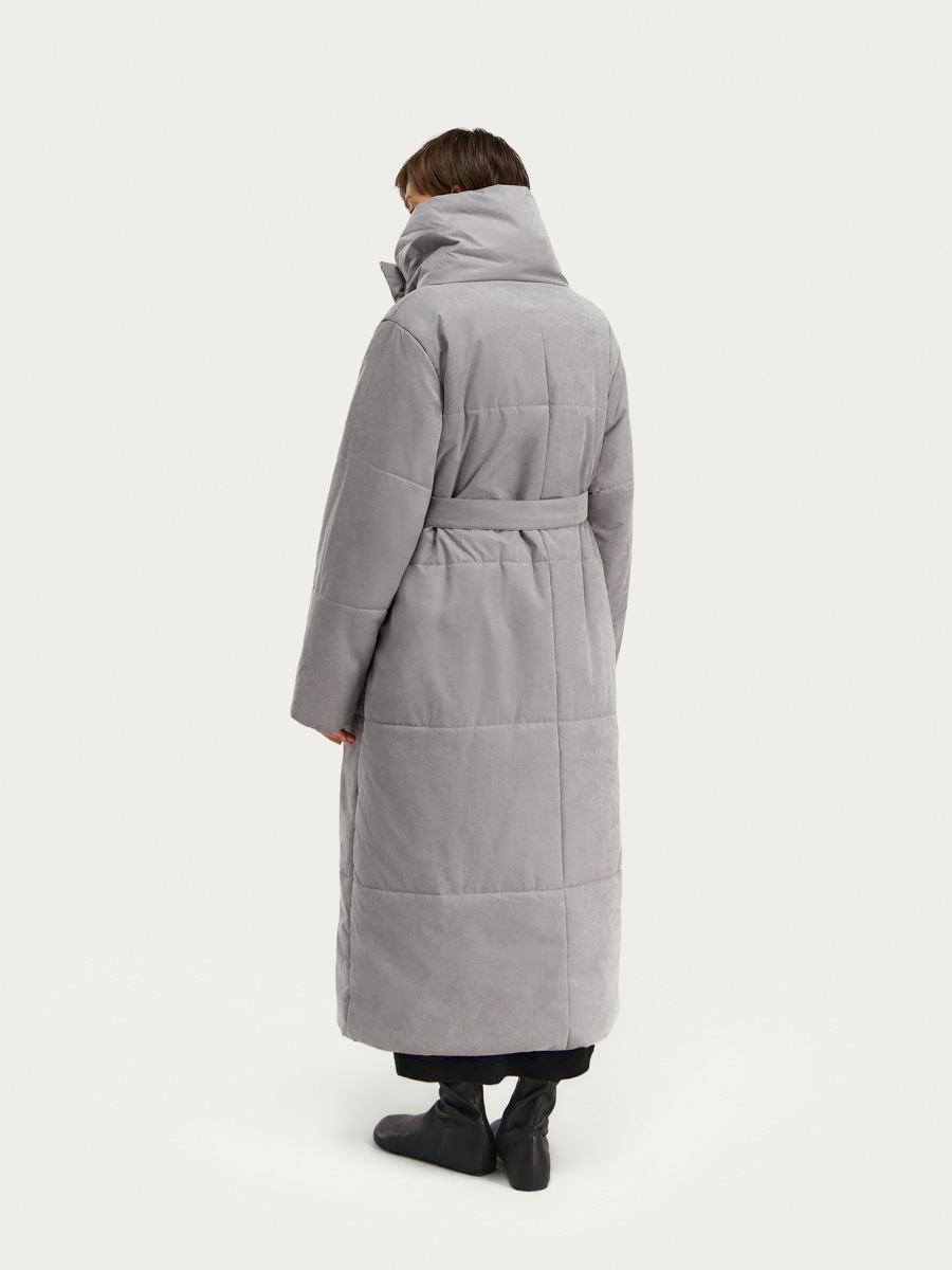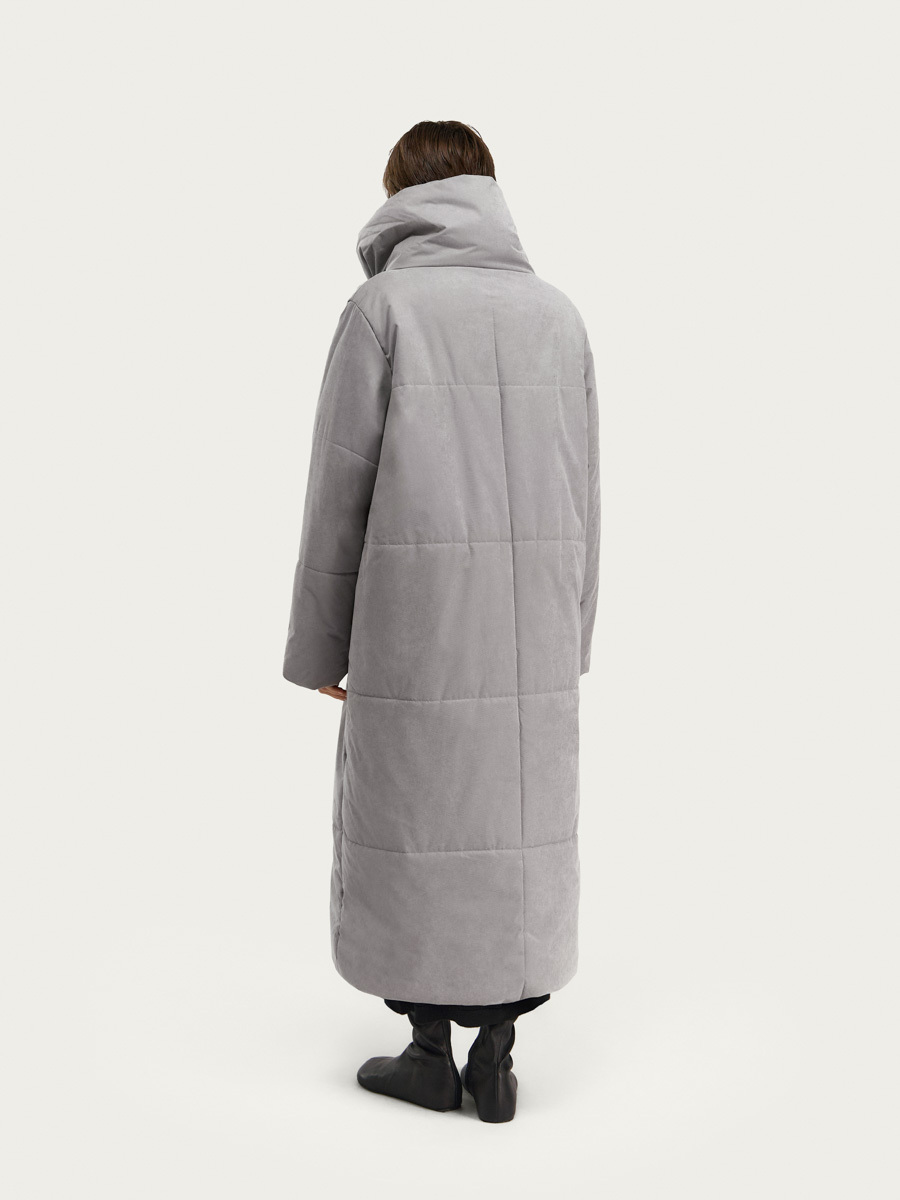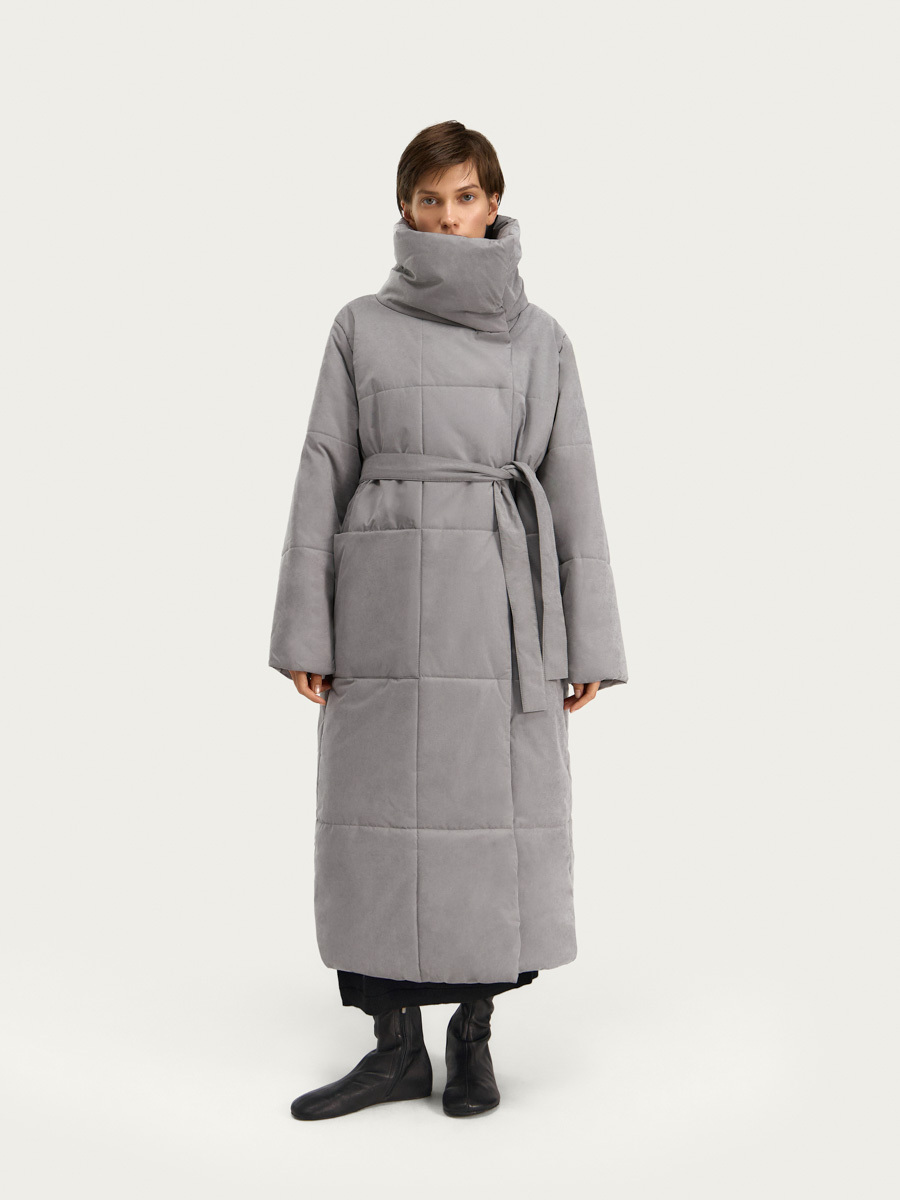 Изделие прямого силуэта имеет спущенную линию плеча, высокий воротник-стойку, накладной карман справа и карманы в боковых швах, застежку на потайные кнопки и внутренний карман. Объемный воротник фиксируется с помощью магнита.
