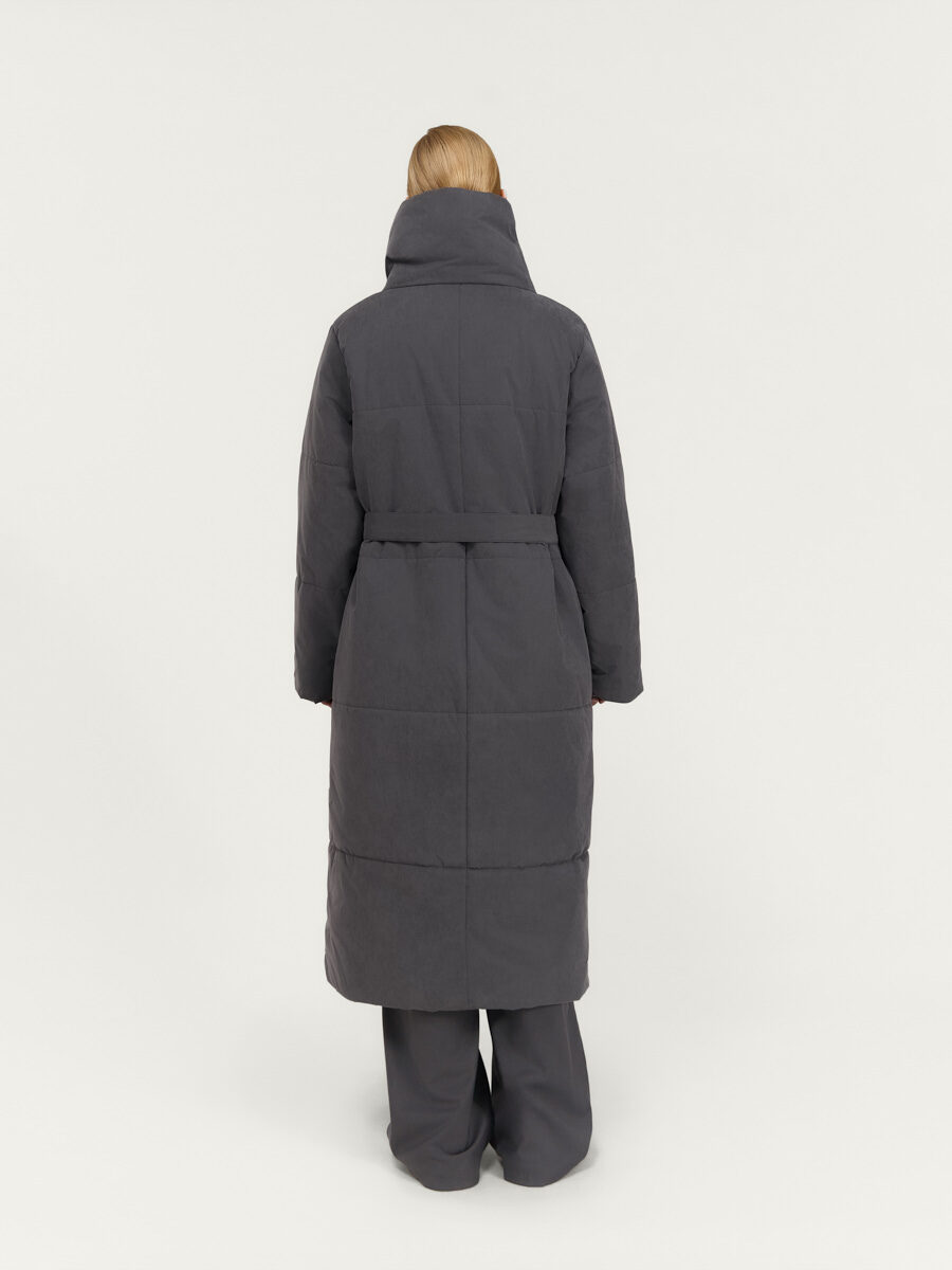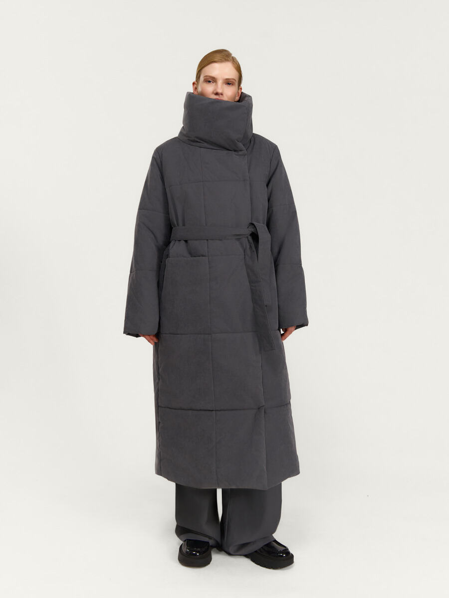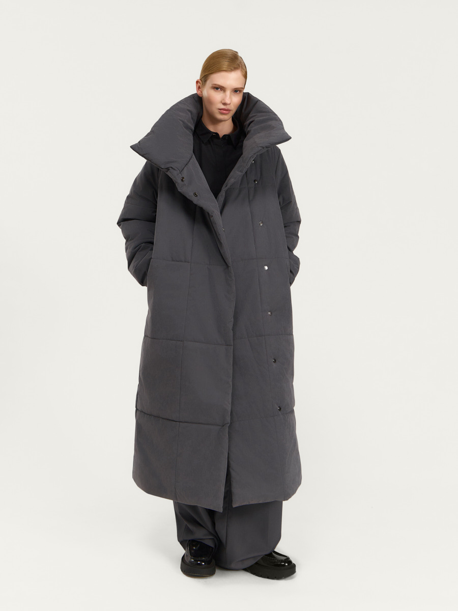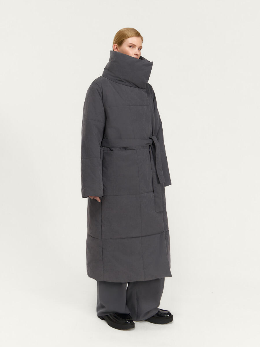 Изделие прямого силуэта имеет спущенную линию плеча, высокий воротник-стойку, накладной карман справа и карманы в боковых швах, застежку на потайные кнопки и внутренний карман. Объемный воротник фиксируется с помощью магнита.
