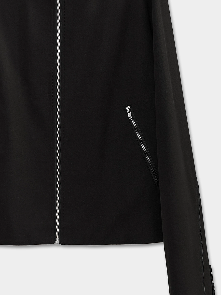 Спинка со средним швом, на полочках обработаны карманы на молнии. В локтевом шве рукава обработана застёжка на молнию с внутренней вставкой, имитирующей пиджачный рукав. На вставке обработана ложная шлица с пуговицами.