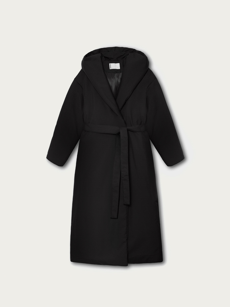 Куртка Себу увеличенного объёма в длине макси со съёмным поясом выполнена из курточной ткани на мембране. Куртка имеет спущенную линию плеча, объемный шалевый воротник, переходящий в капюшон, застёжку на потайную кнопку, шлевки и карманы в боковых швах. Внутри предусмотрен карман на молнии. Изделие на подкладке.