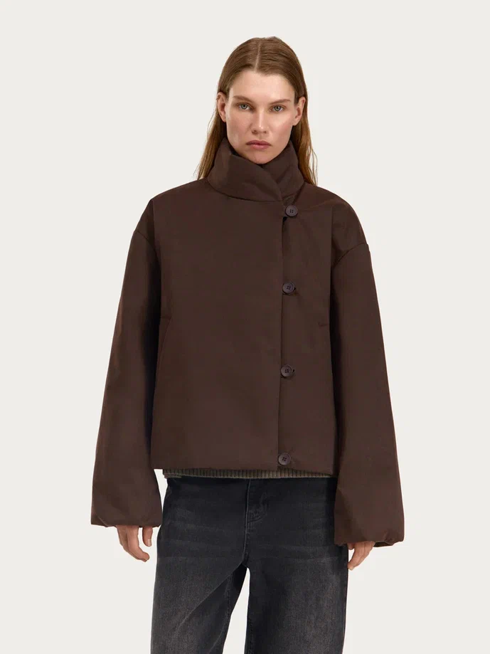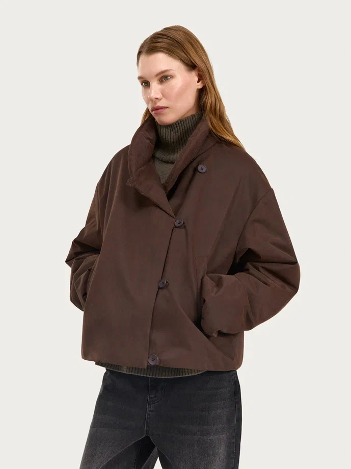 Женская куртка Томск выполнена из курточной ткани с пропиткой, имеющей бархатистую поверхность. Куртка со смещенной застежкой на пуговицы и навесные петли, спущенной линией плеча и воротником-стойкой. На полочках обработаны прорезные карманы с листочкой. Рукава по низу собраны на внутреннюю резинку.