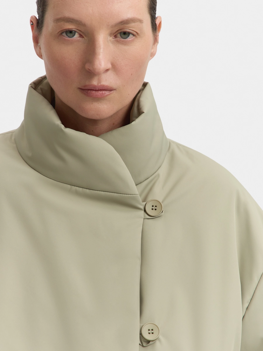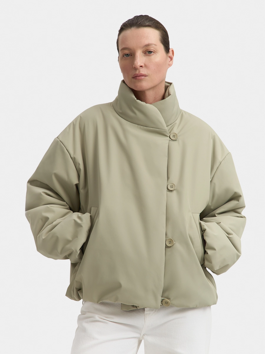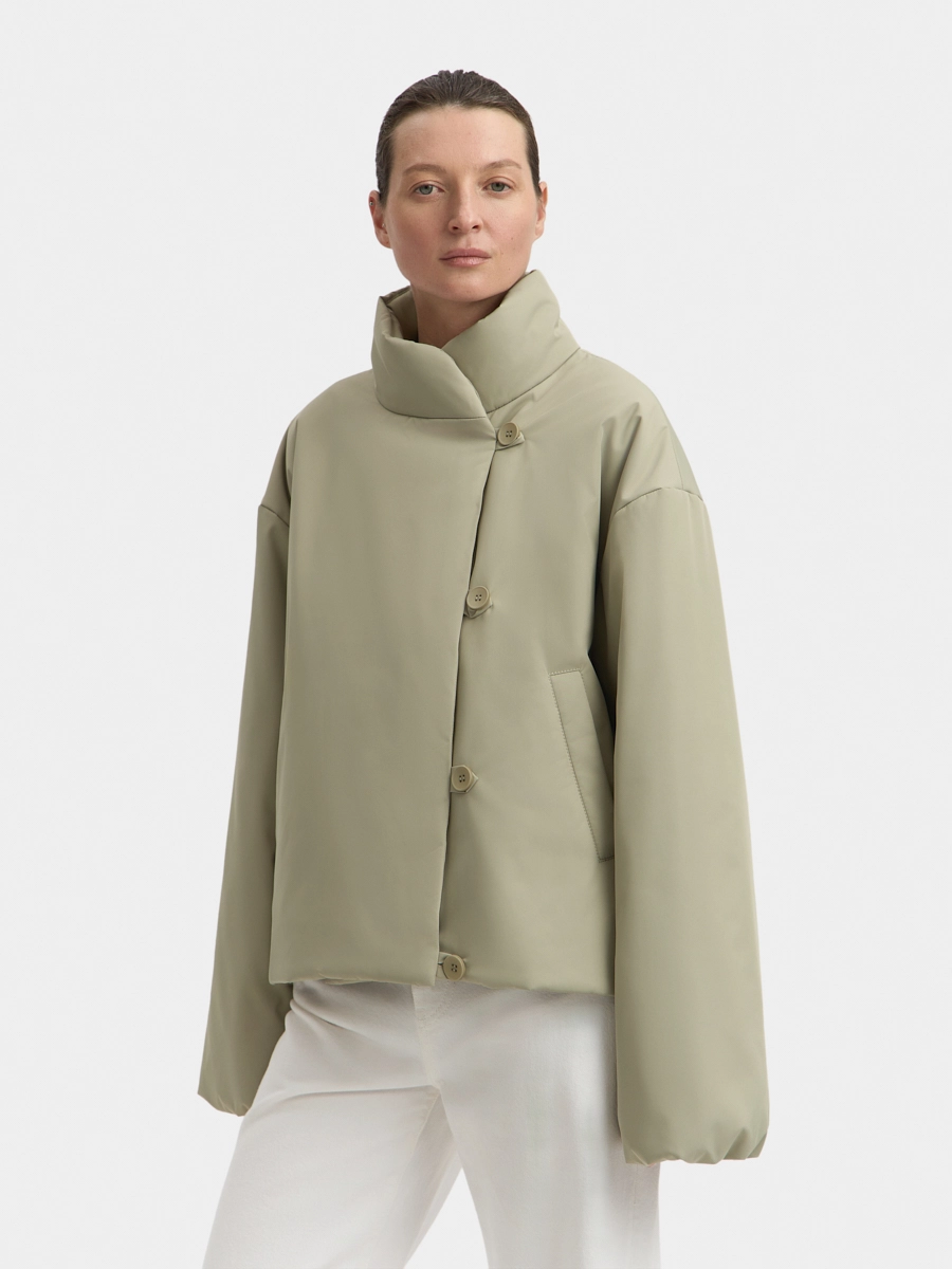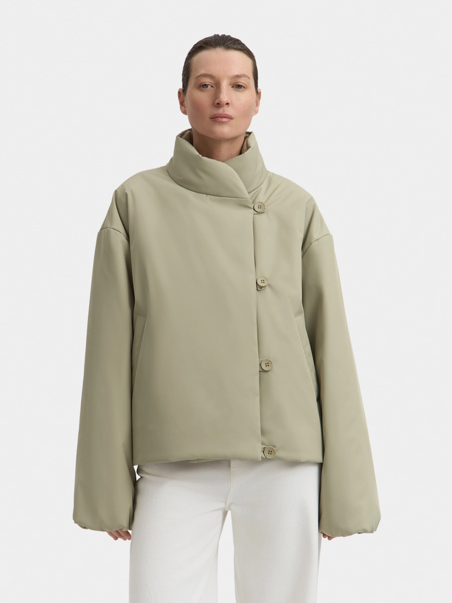Puffer jacket Tomsk is made of coated outerwear fabric. The jacket features an asymmetric button closure with hanging loops, a dropped shoulder line, and a stand-up collar. The front panels have welt pockets with a flap. The sleeves are gathered at the cuff with an inner elastic band.