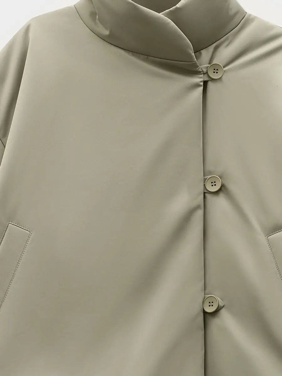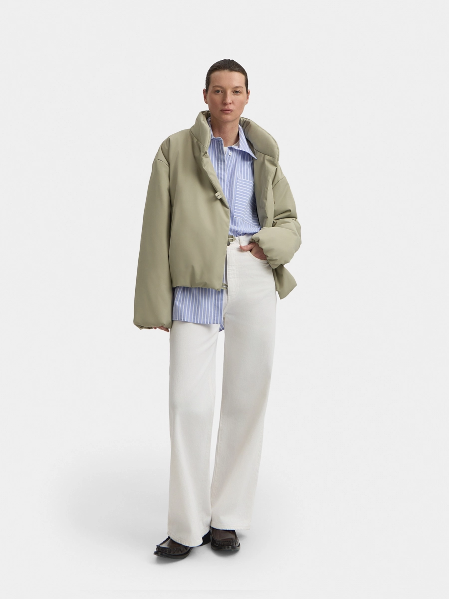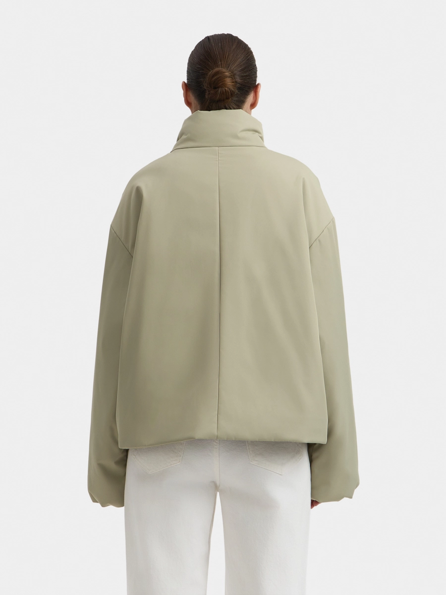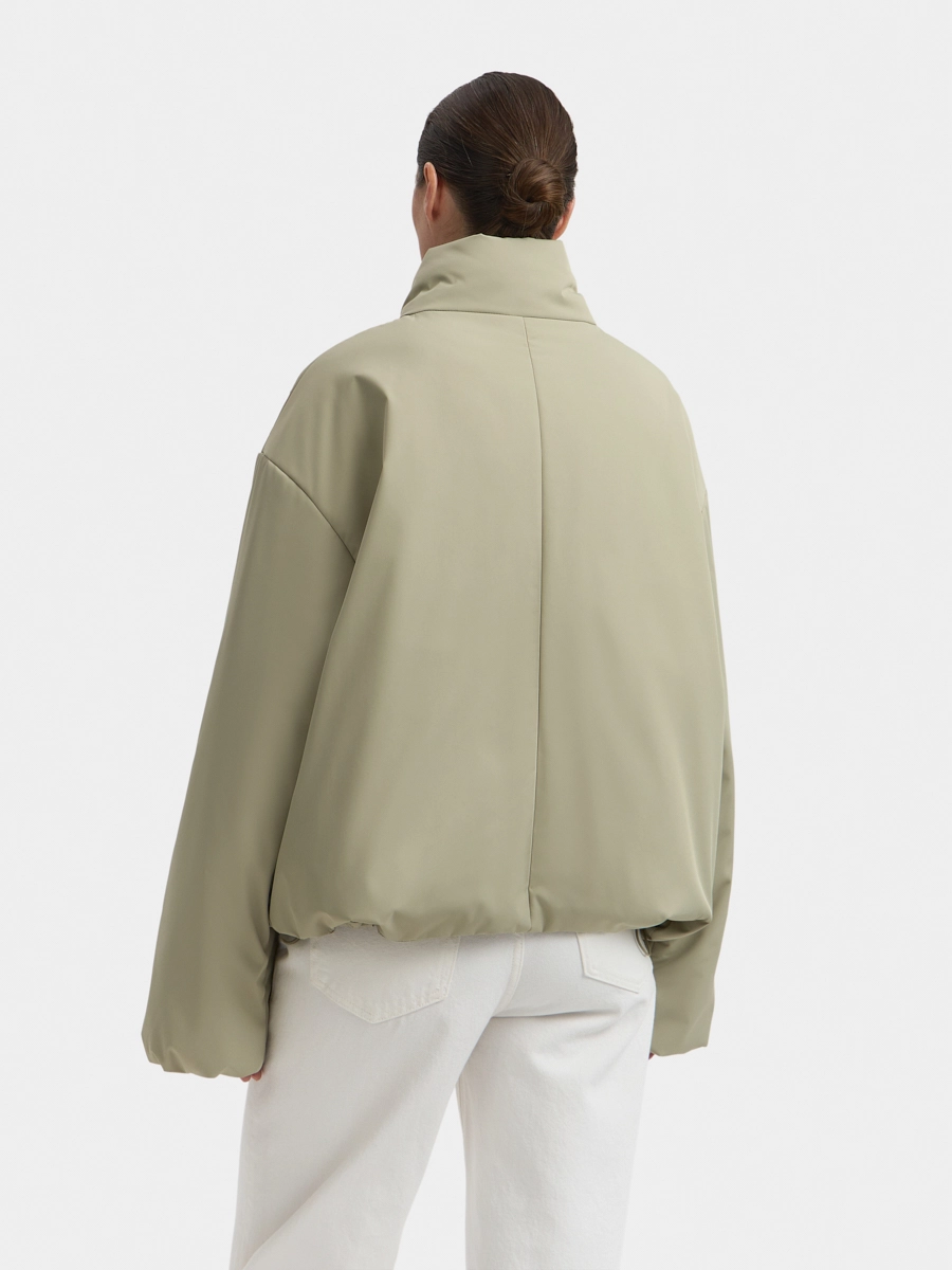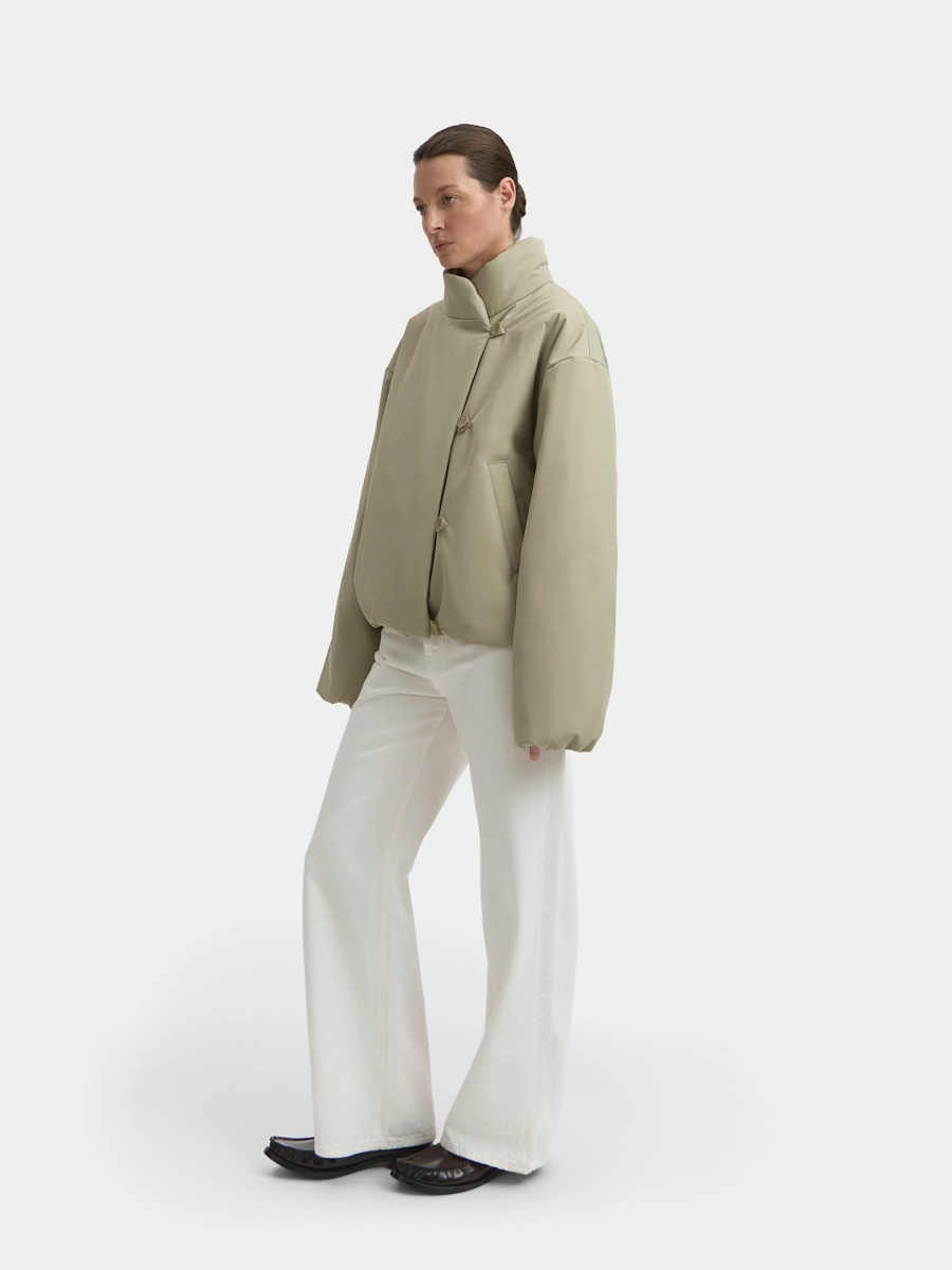 Puffer jacket Tomsk is made of coated outerwear fabric. The jacket features an asymmetric button closure with hanging loops, a dropped shoulder line, and a stand-up collar. The front panels have welt pockets with a flap. The sleeves are gathered at the cuff with an inner elastic band.