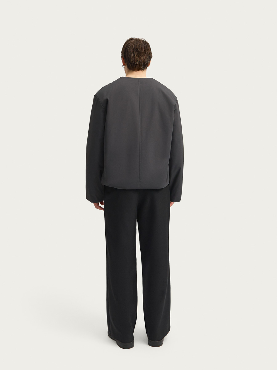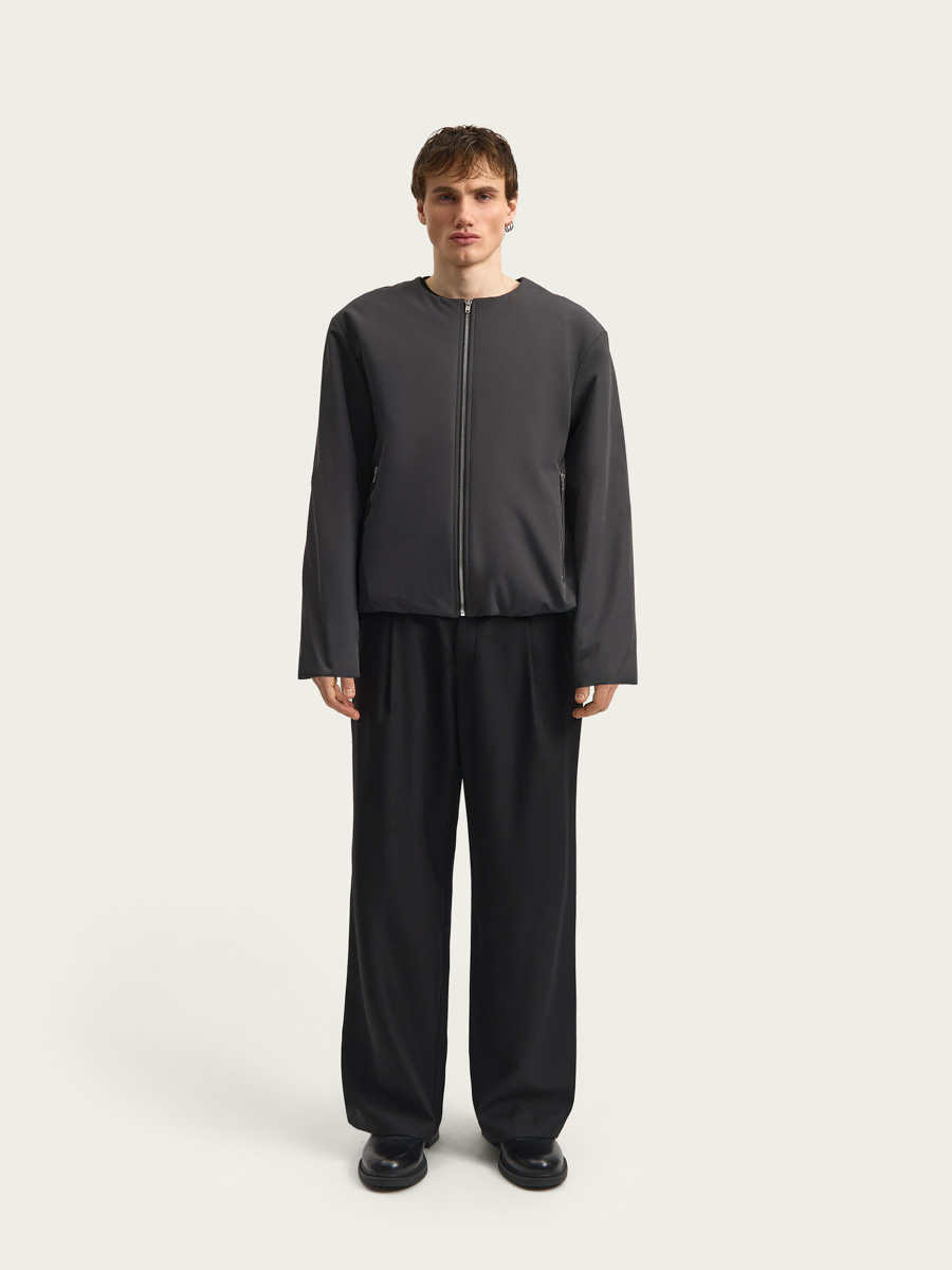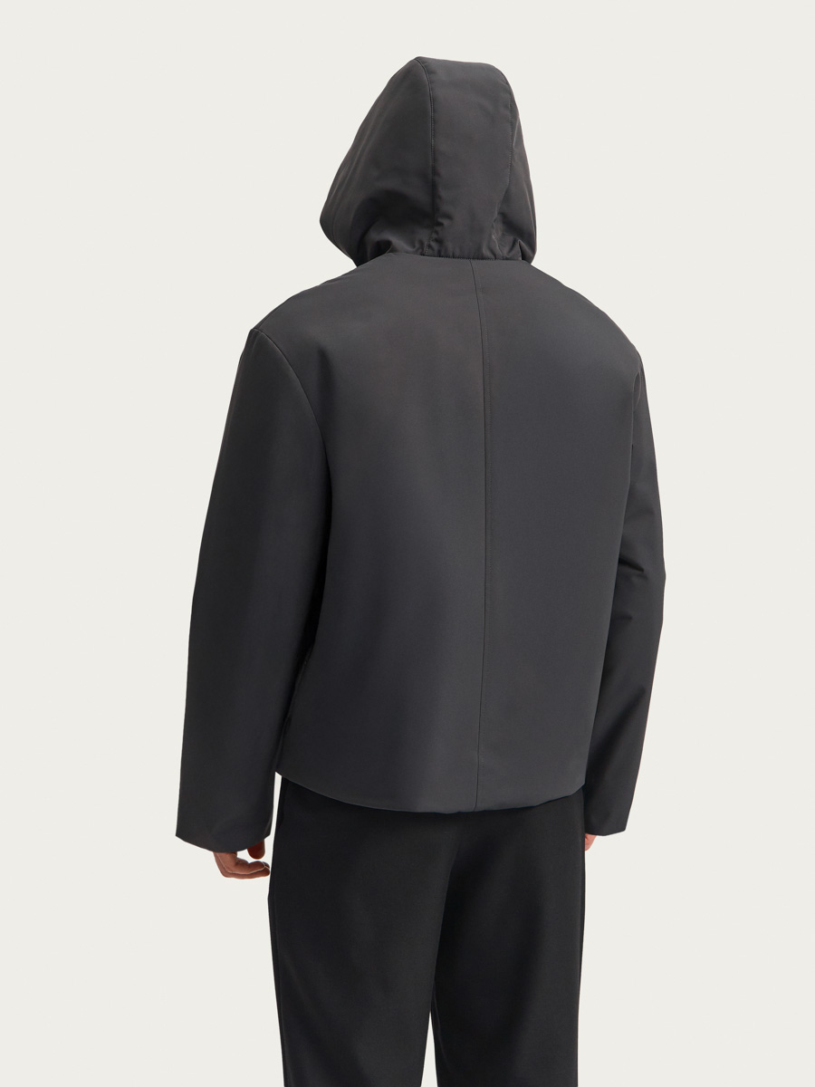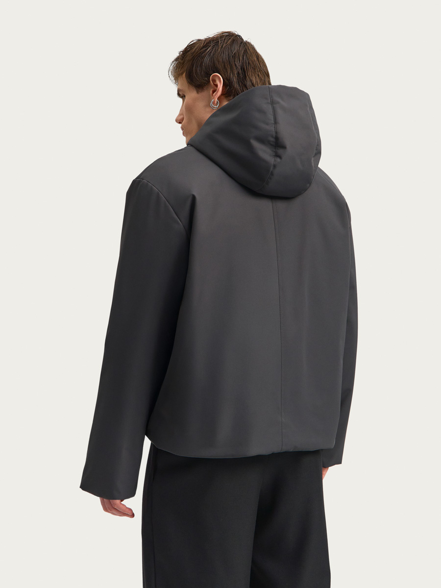 Куртка имеет прямой силуэт, спущенное плечо, центральную застежку на металлическую молнию, капюшон на потайных кнопках и внутренней кулисой по внешнему краю, прорезные карманы на молнии. Низ рукавов с внутренней стороны собран на резинку, по низу изделия - внутренняя кулиса с узкой резинкой и стопорами у боковых швов. Съемный капюшон позволяет носить куртку без него, позволяя создать массу образов. Изделие выполнено на подкладке и дополнено одним внутренними карманом.